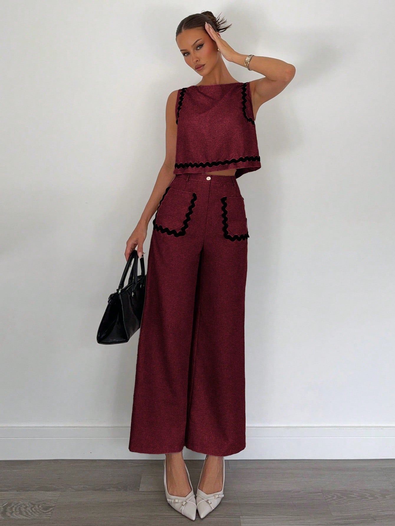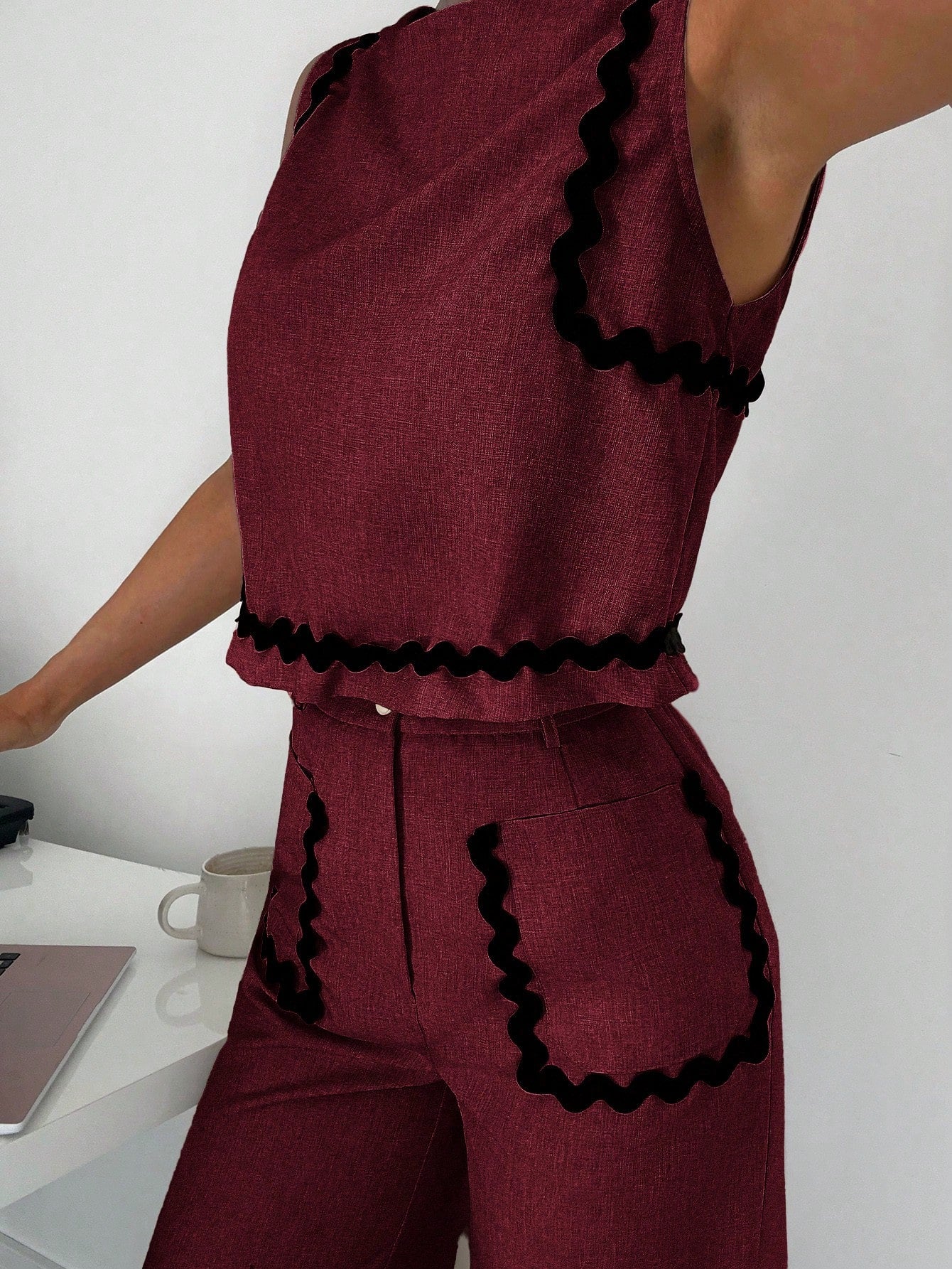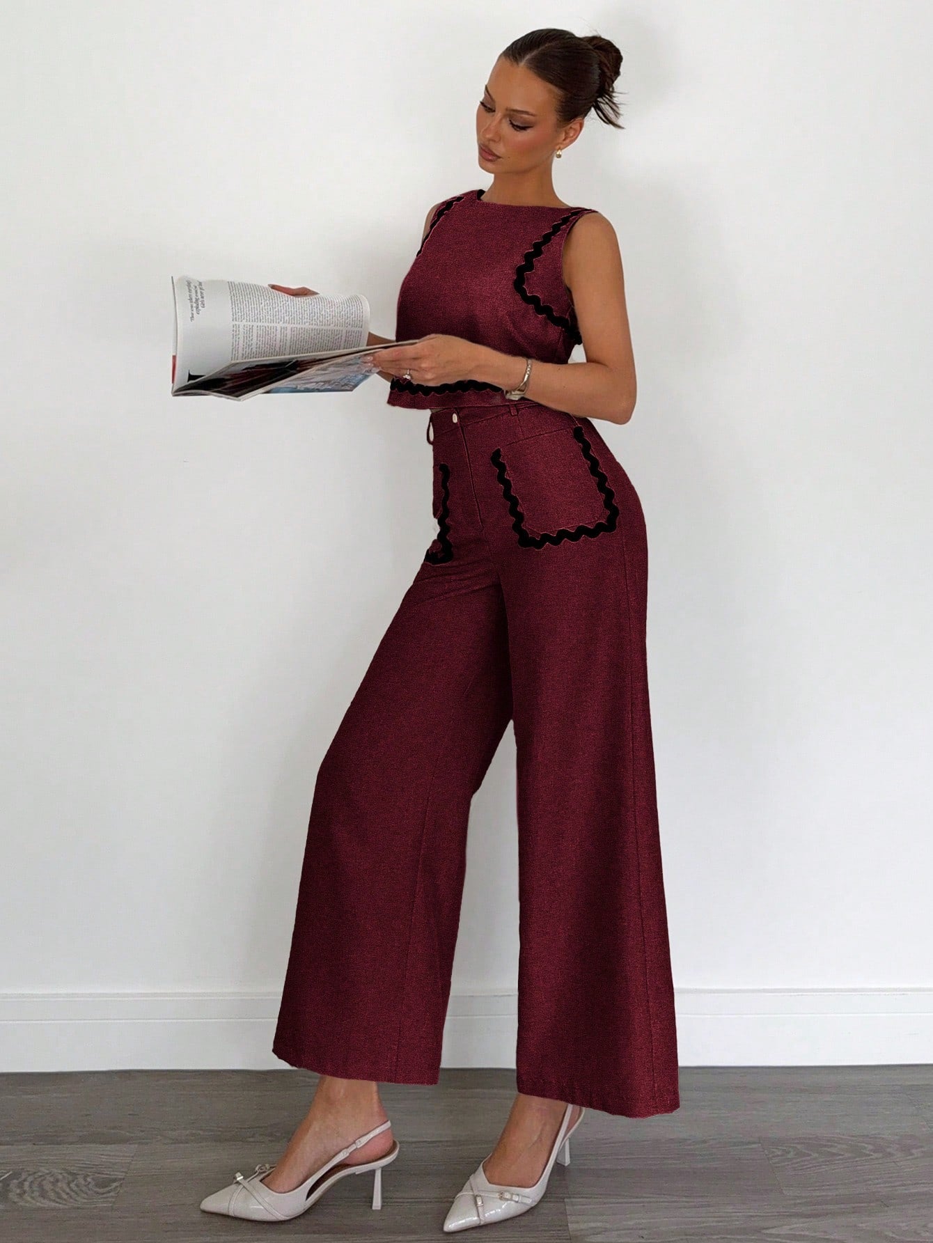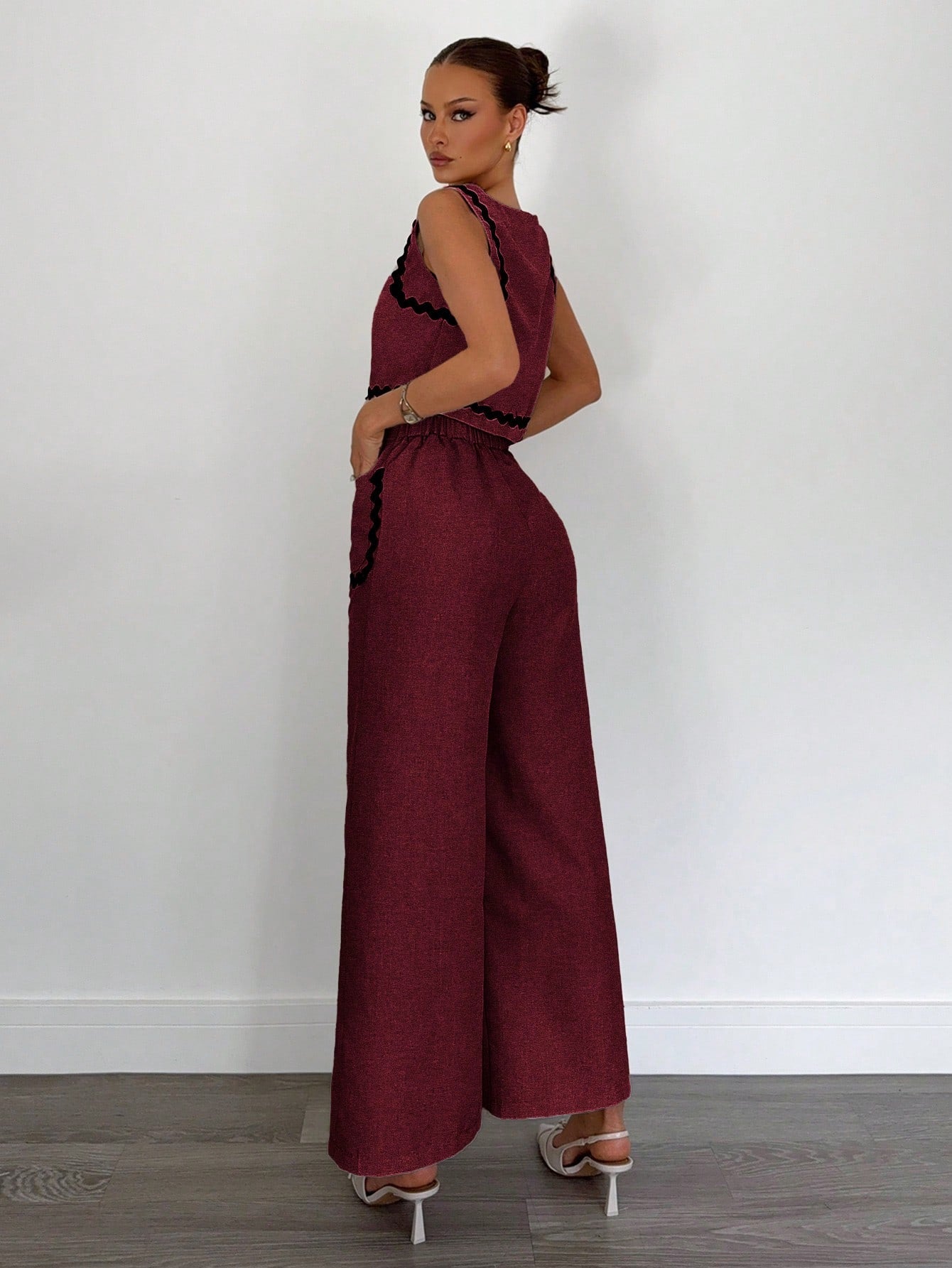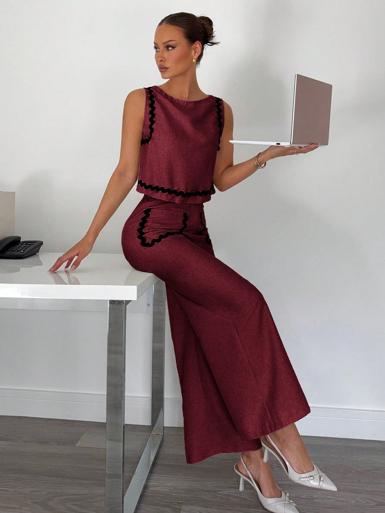 Siren Gaze 2pcs Women Set For Summer, Contrast Trim Loose Top And Plain Wide-Leg Pants, Casual Daily/Office