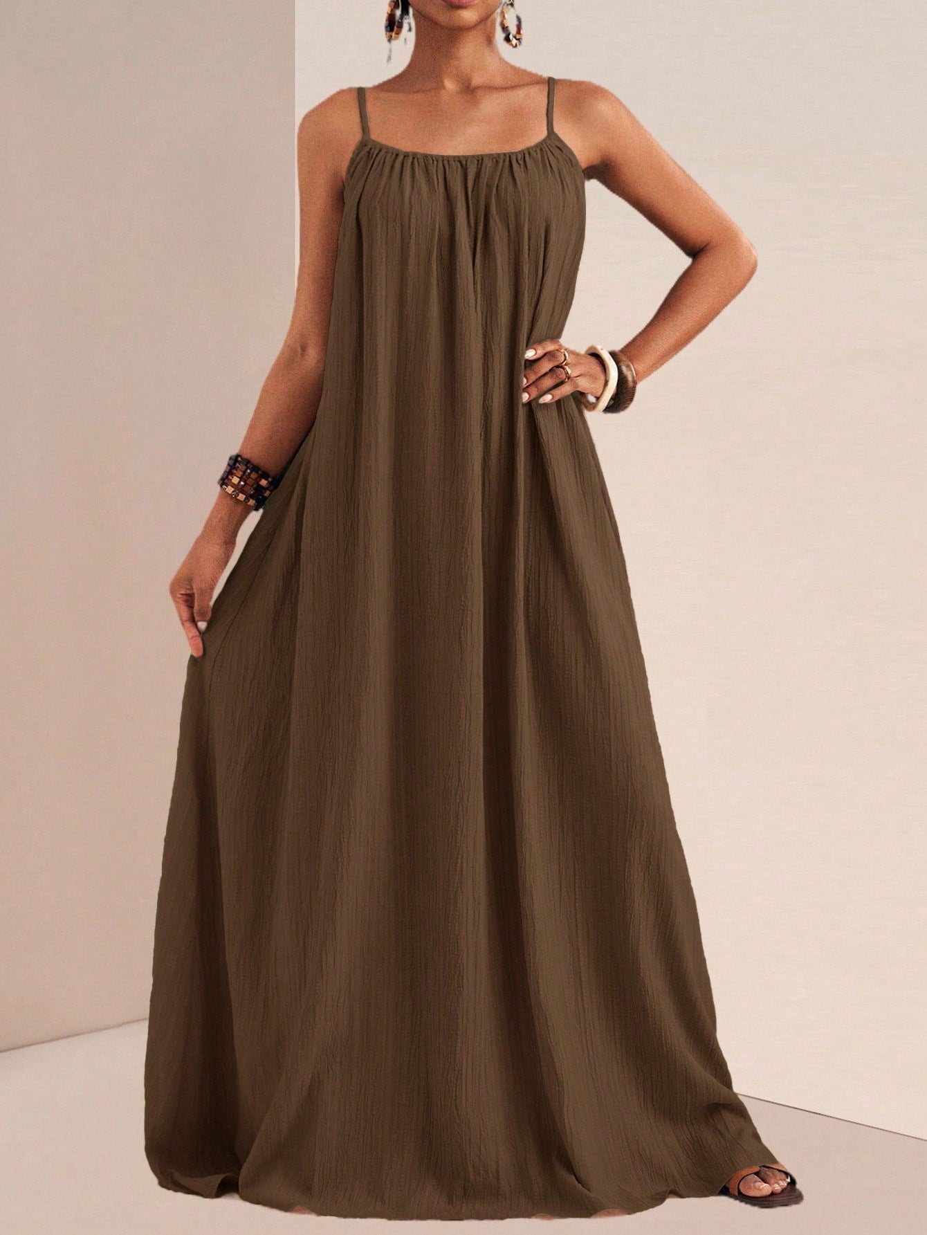 Slaydiva Plus Size Women's Casual Solid Color Long Camisole Dress For Summer Brown Maxi Dress Long Summer Dress Brown Sundress Maxi Sundress Brown Long Dress Brown Dress