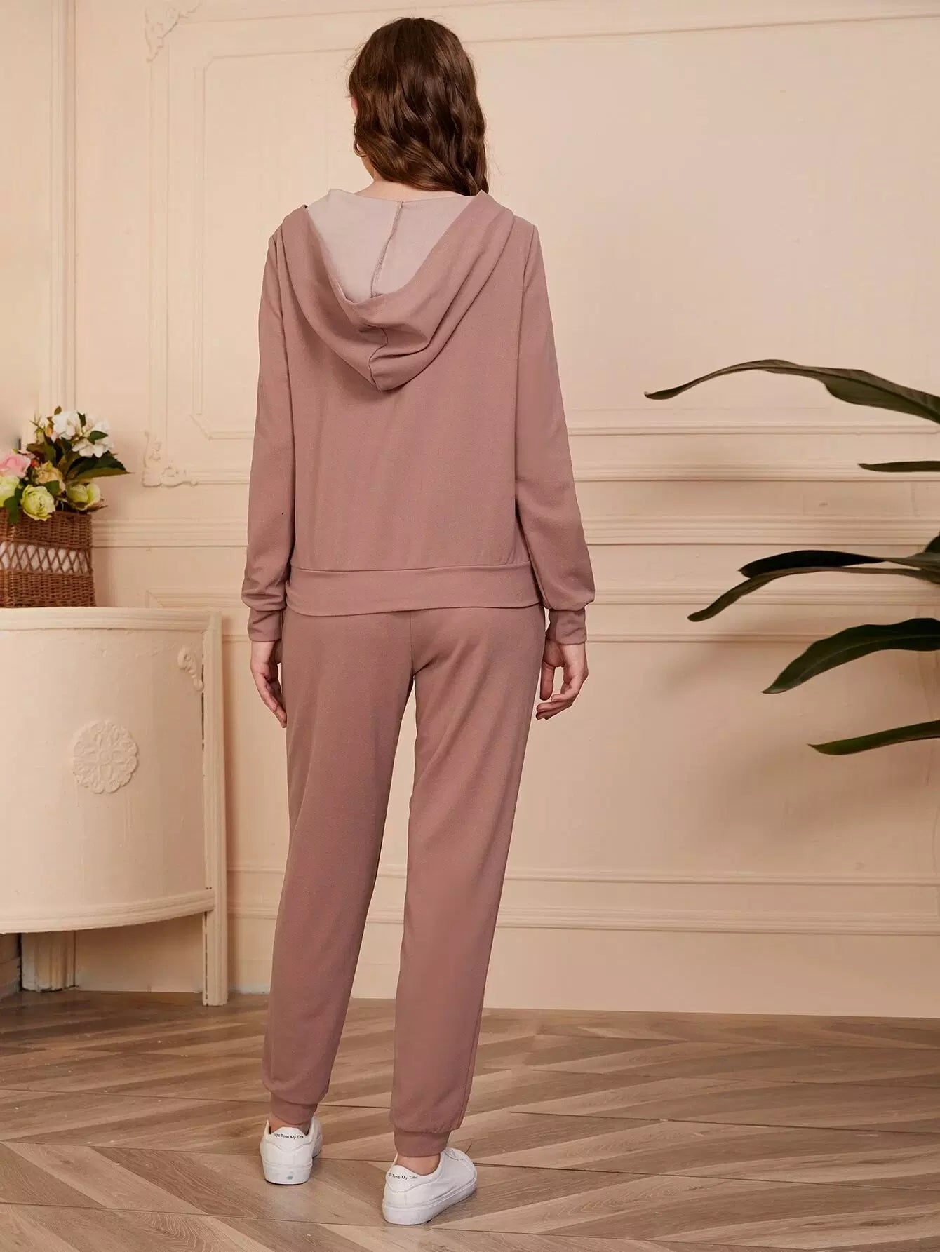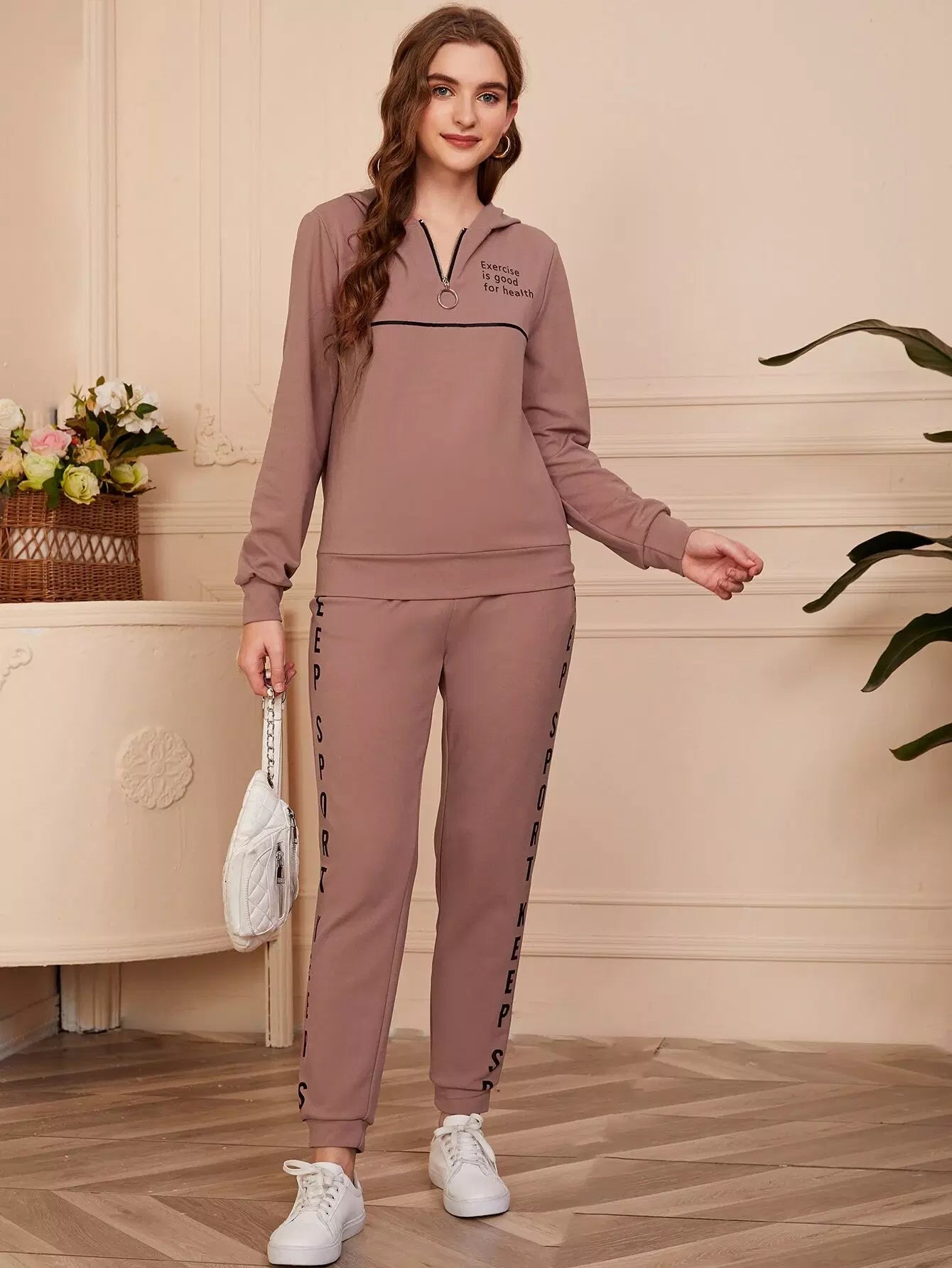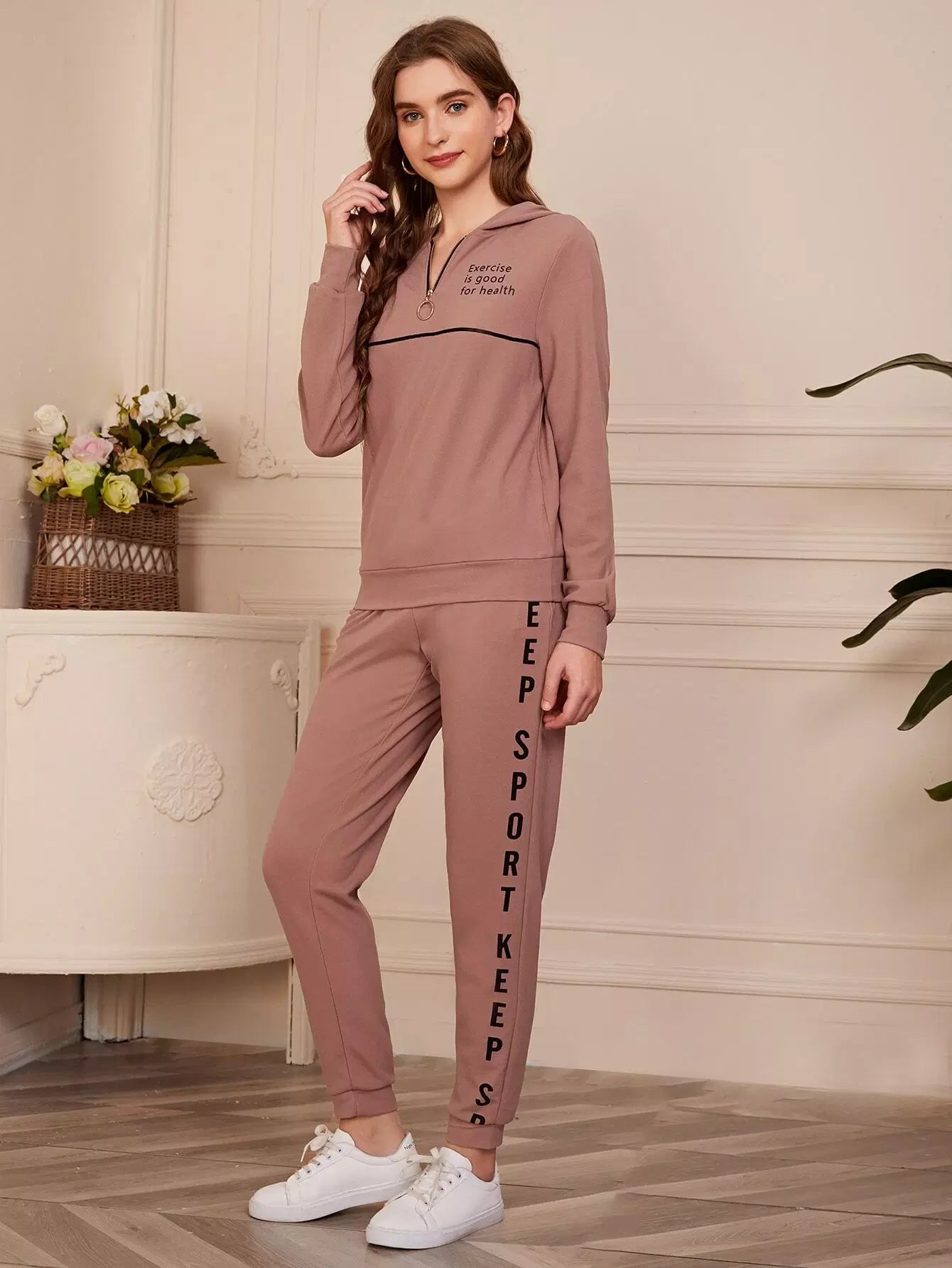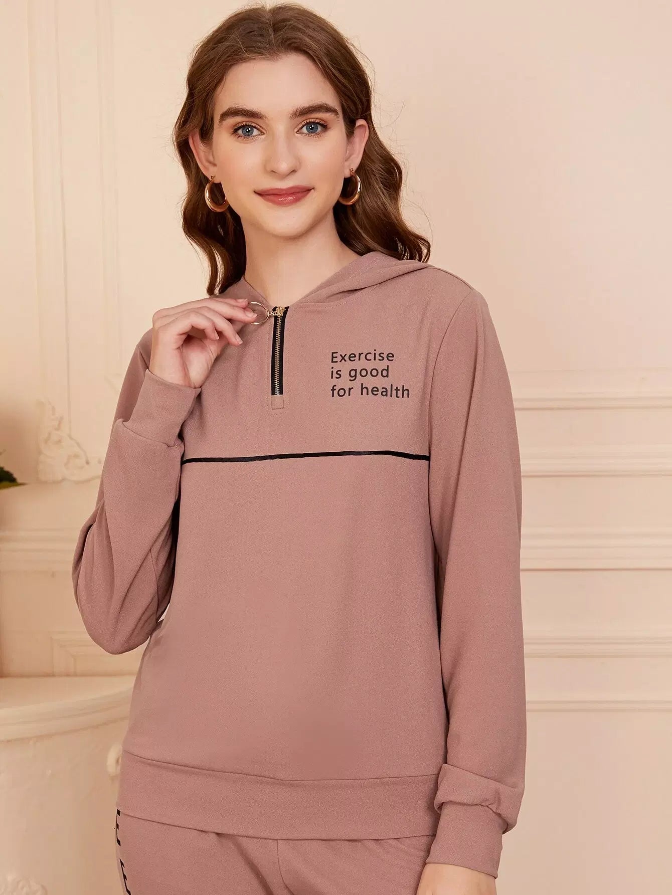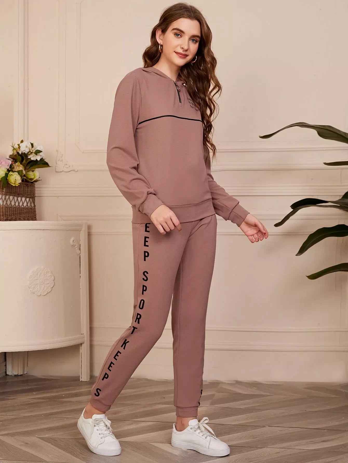 Slogan Graphic Half Zipper Placket Hoodie & Joggers Set