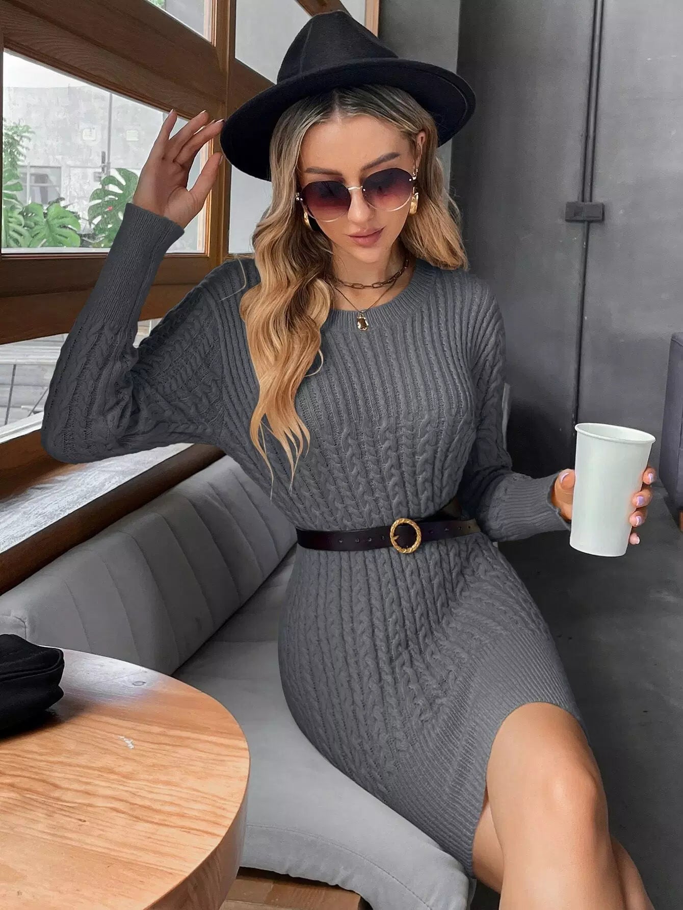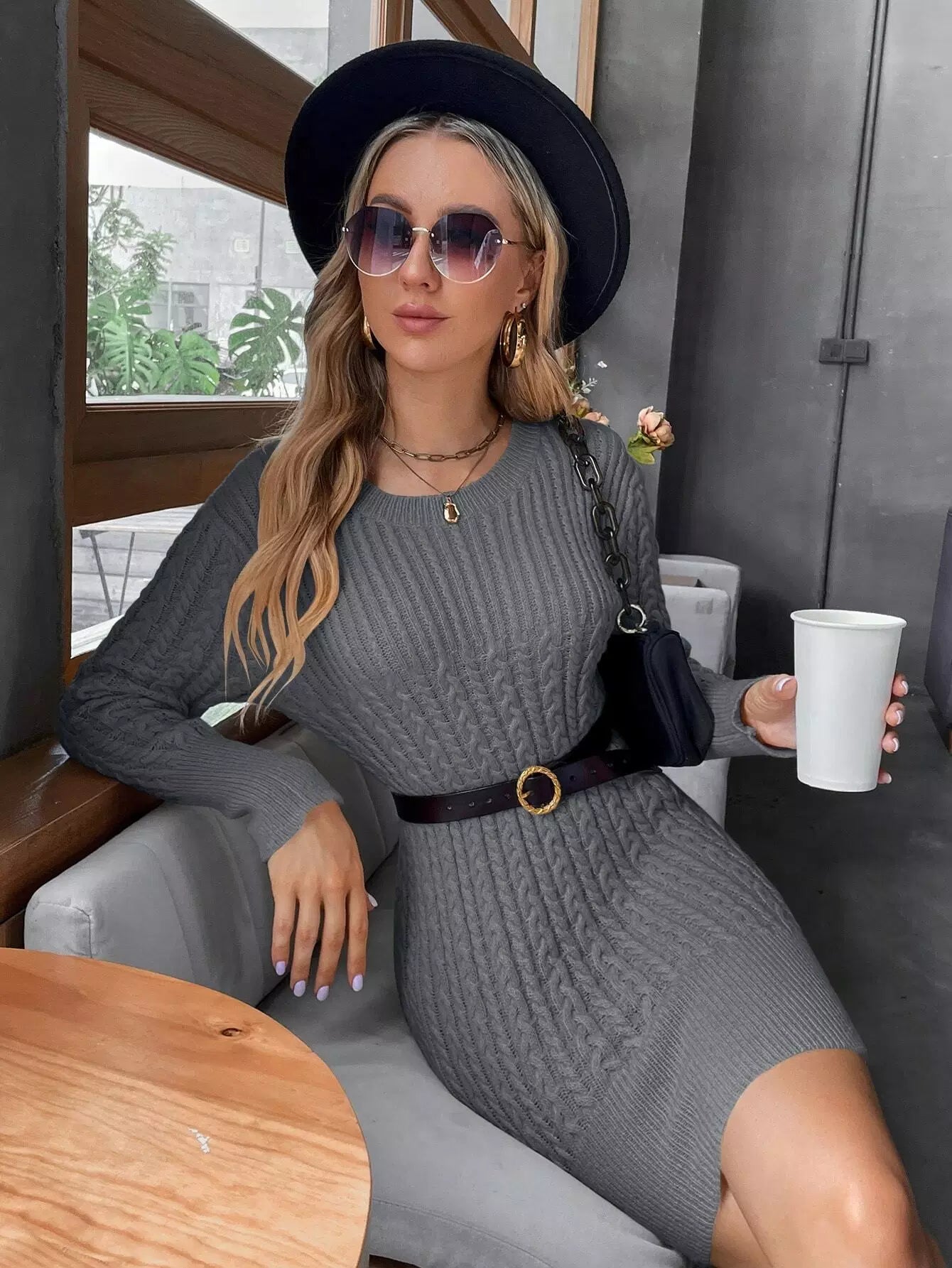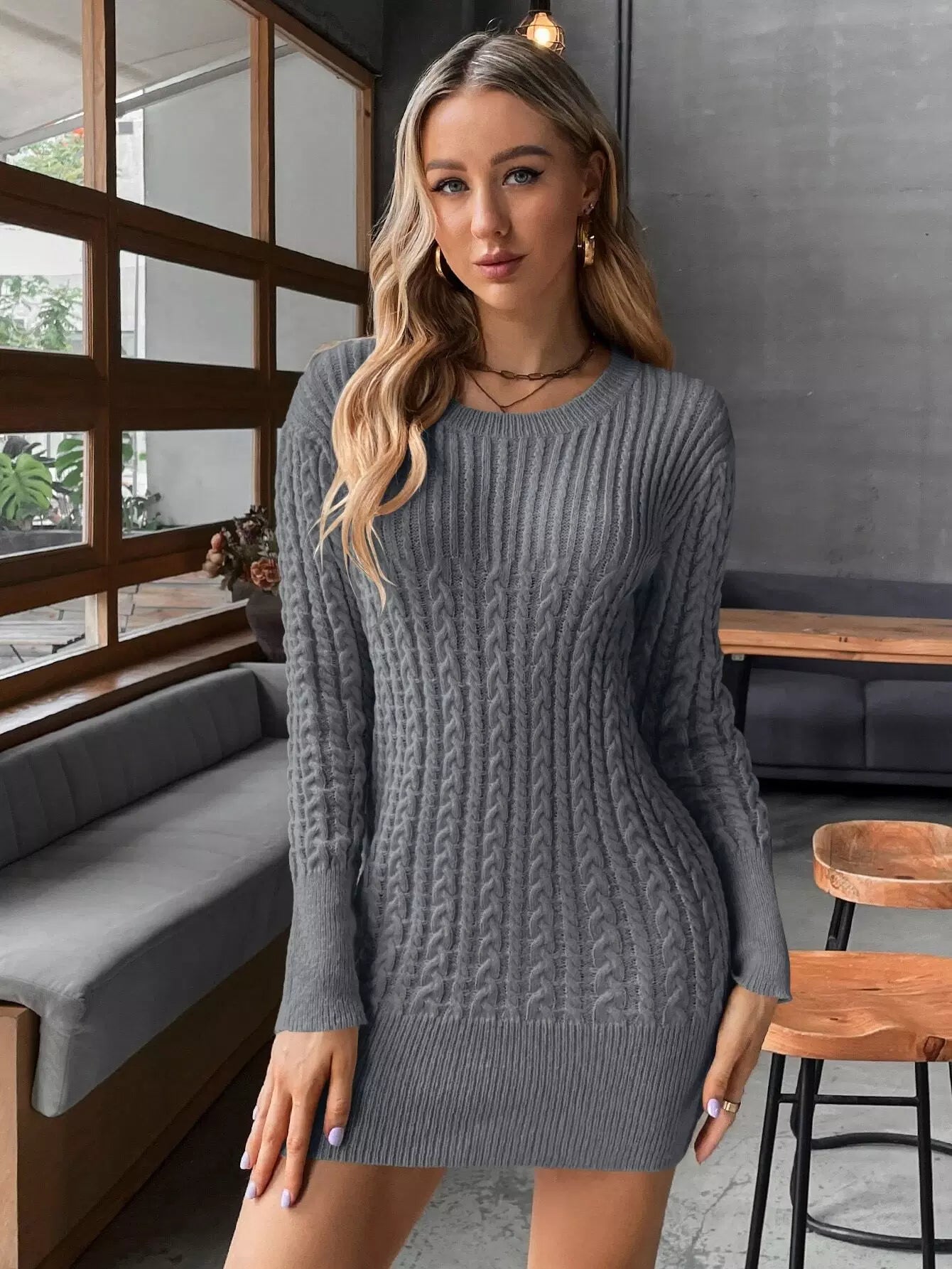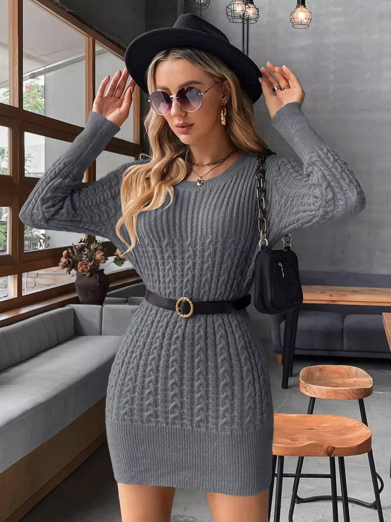 Solid Cable Knit Bodycon Sweater Dress Without Belt