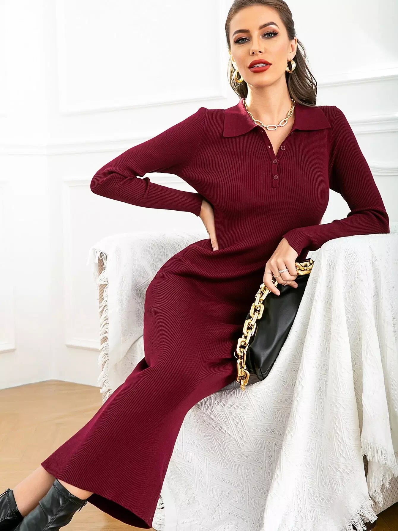 Solid Collar Neck Button Sweater Dress