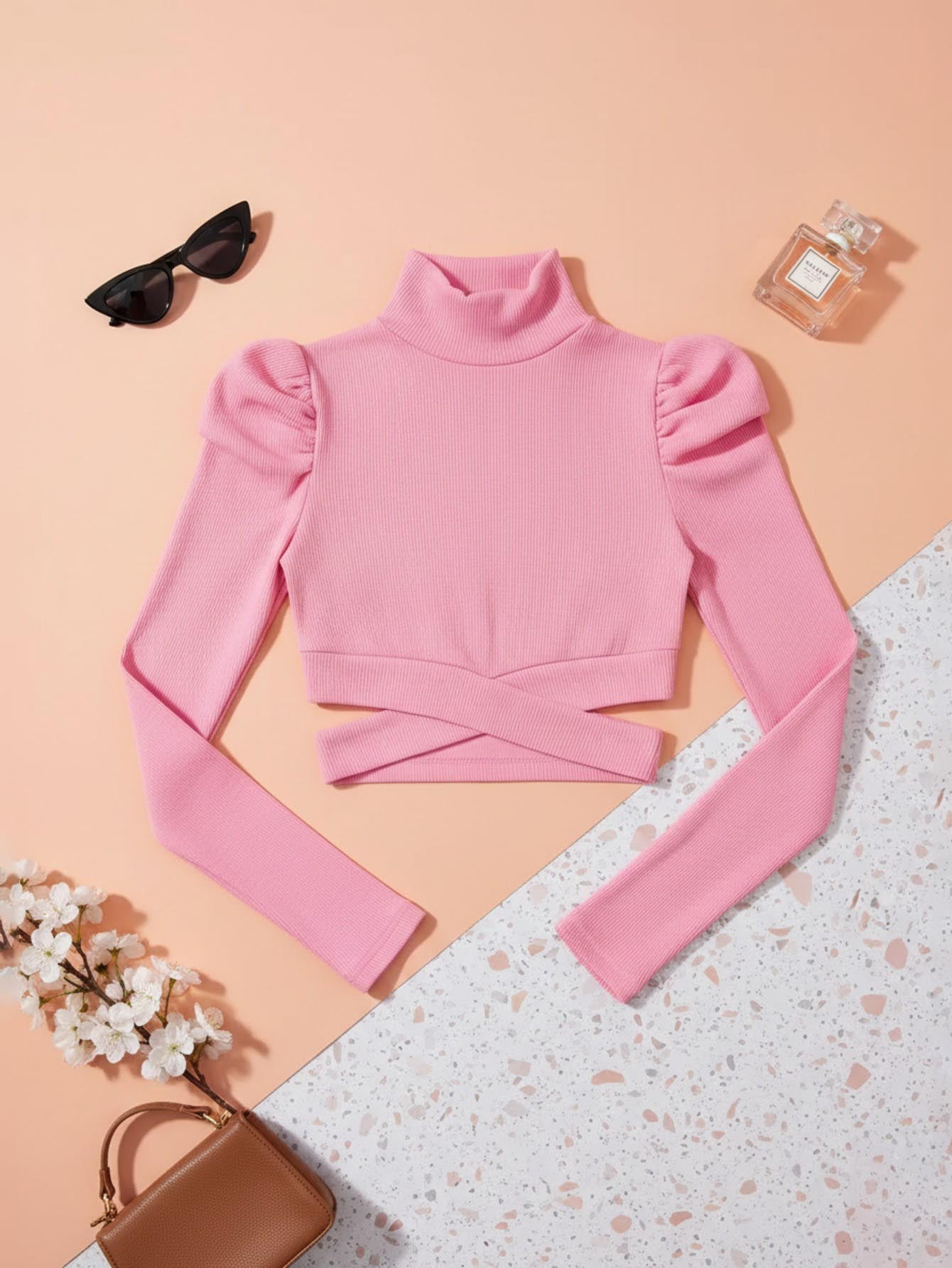 Solid High Neck Gigot Sleeve Criss Cross Crop Tee