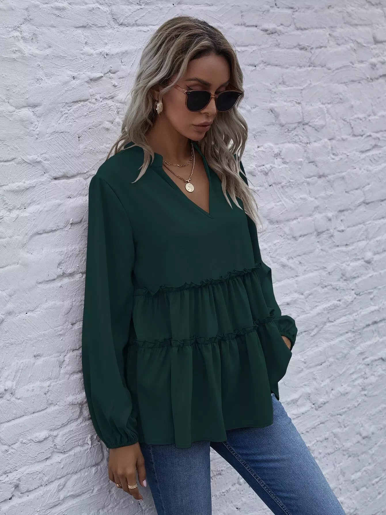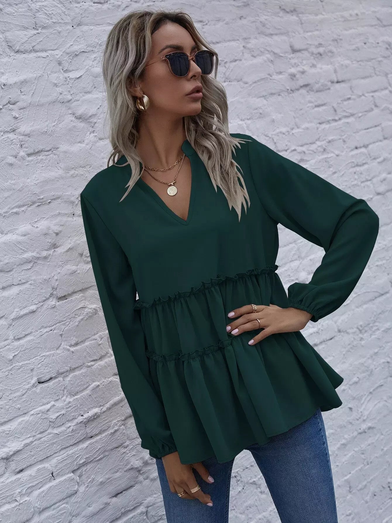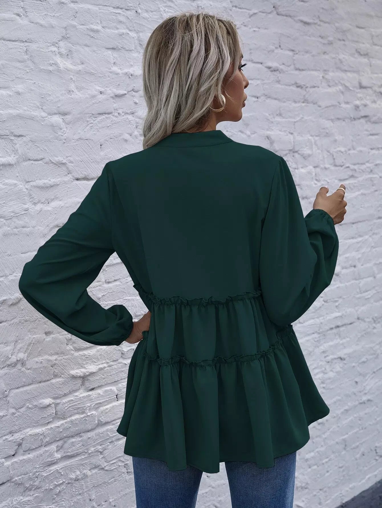Solid Notched Neck Frill Ruffle Hem Blouse