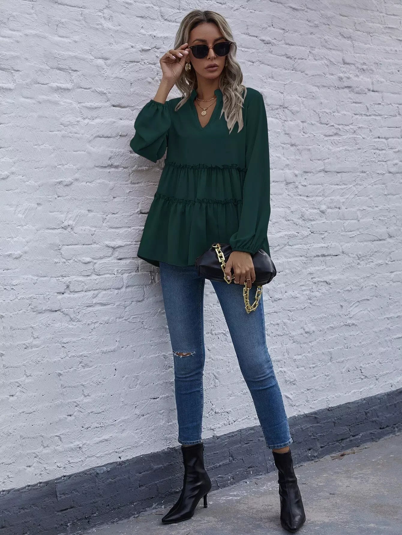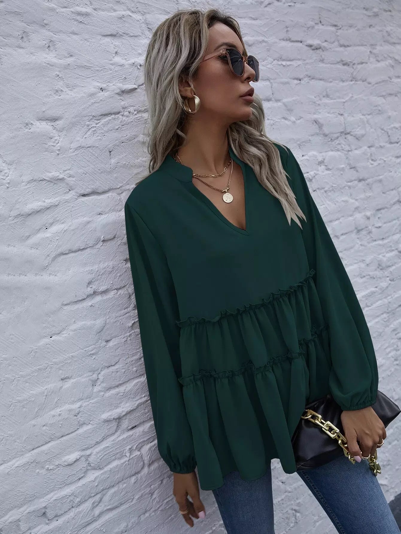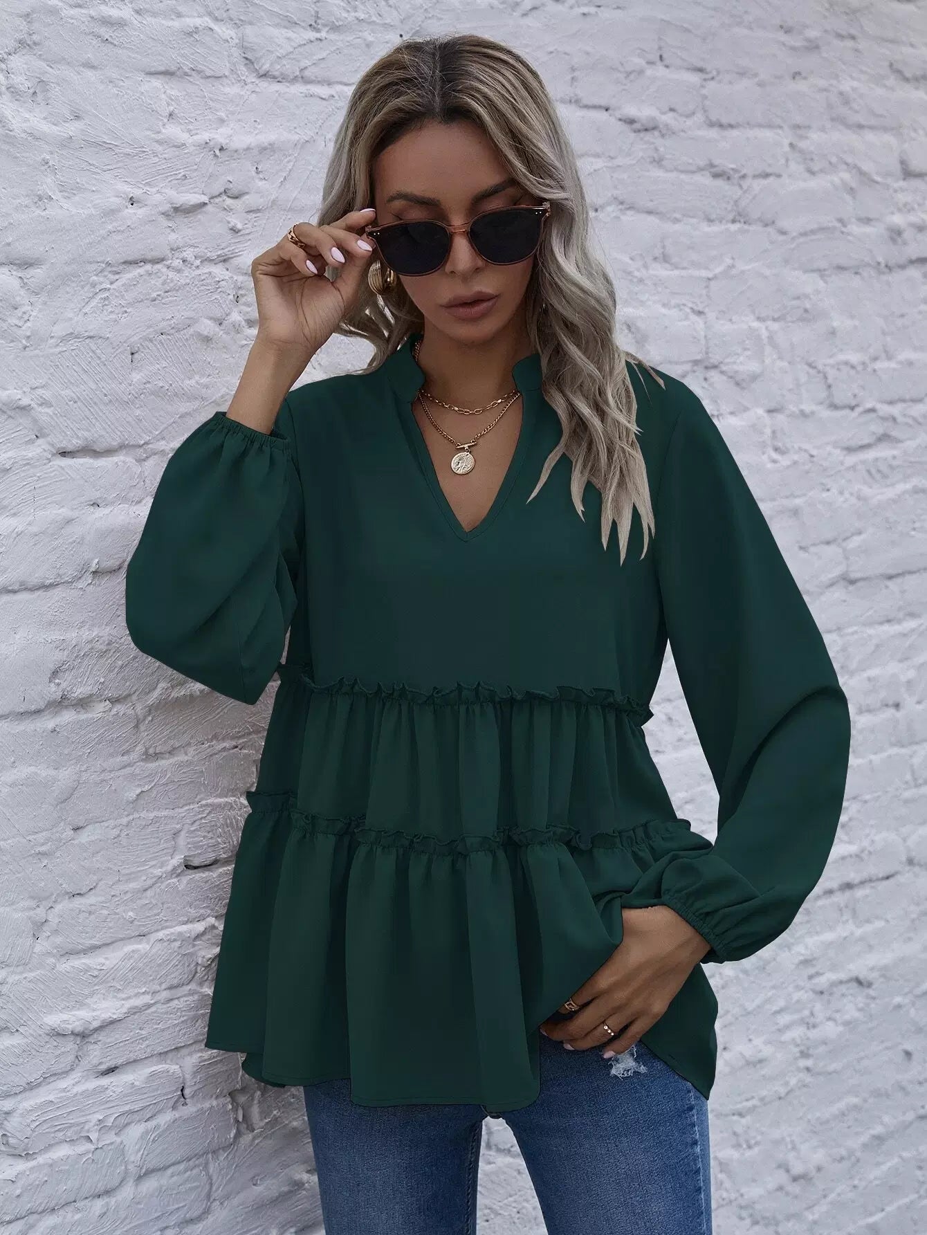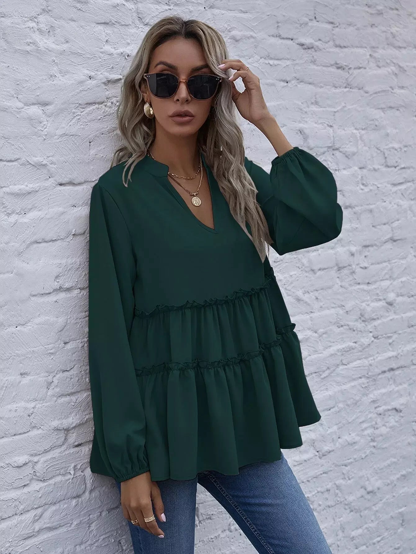 Solid Notched Neck Frill Ruffle Hem Blouse