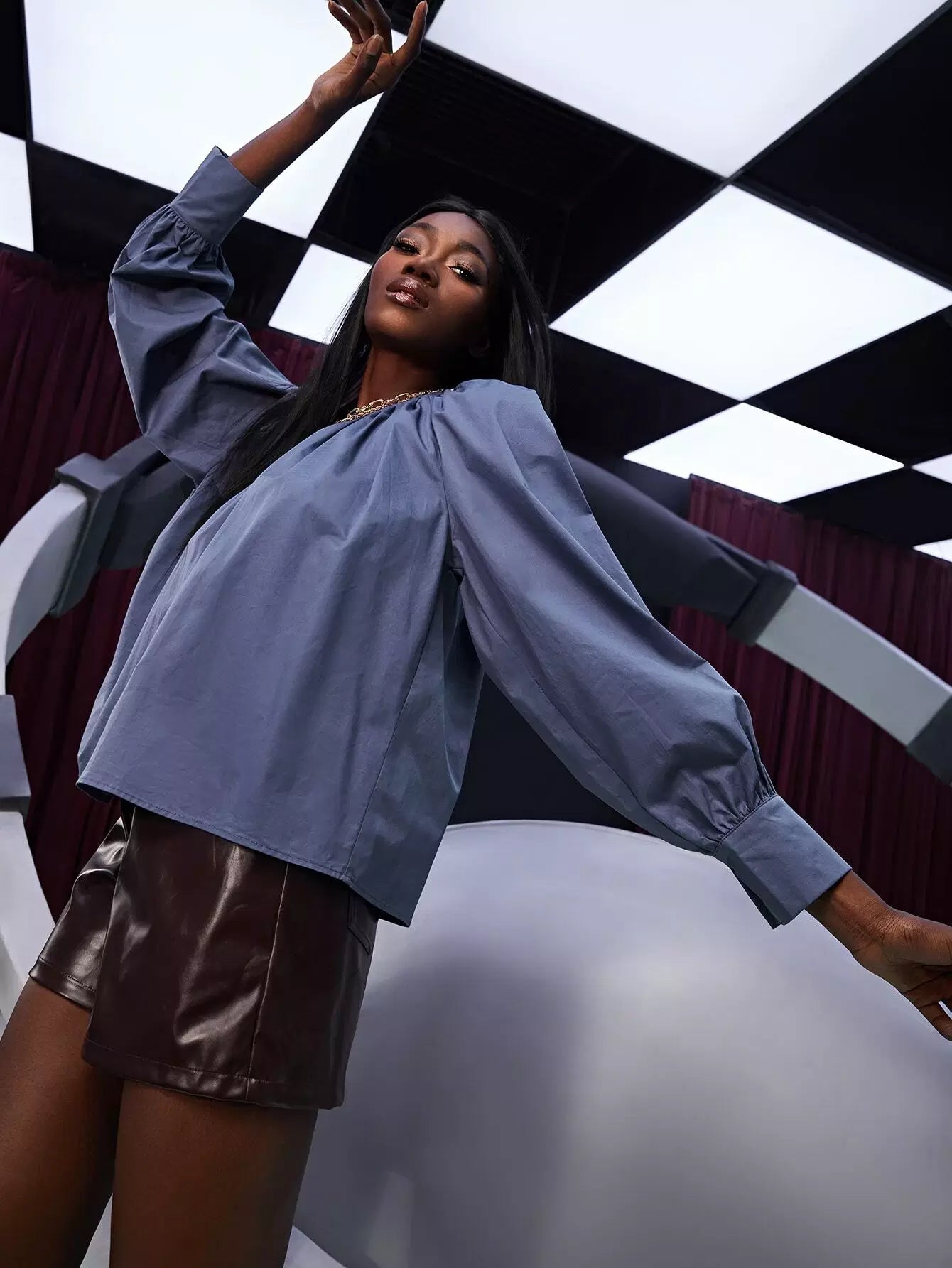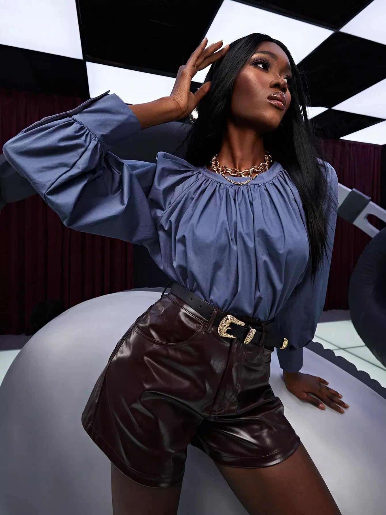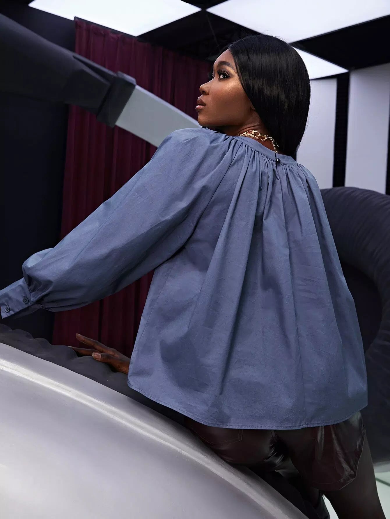 Solid Ruffle Hem Bishop Sleeve Blouse
