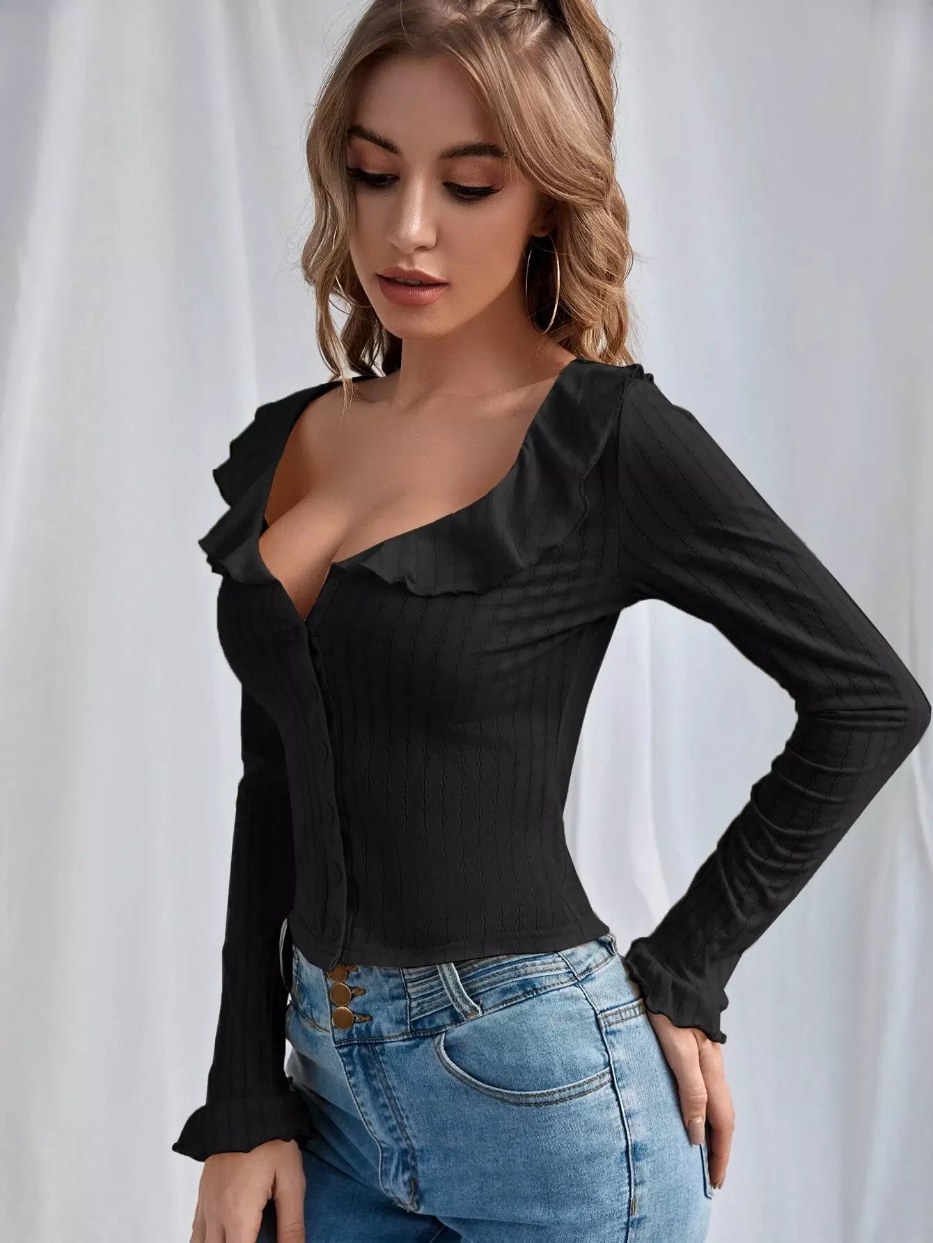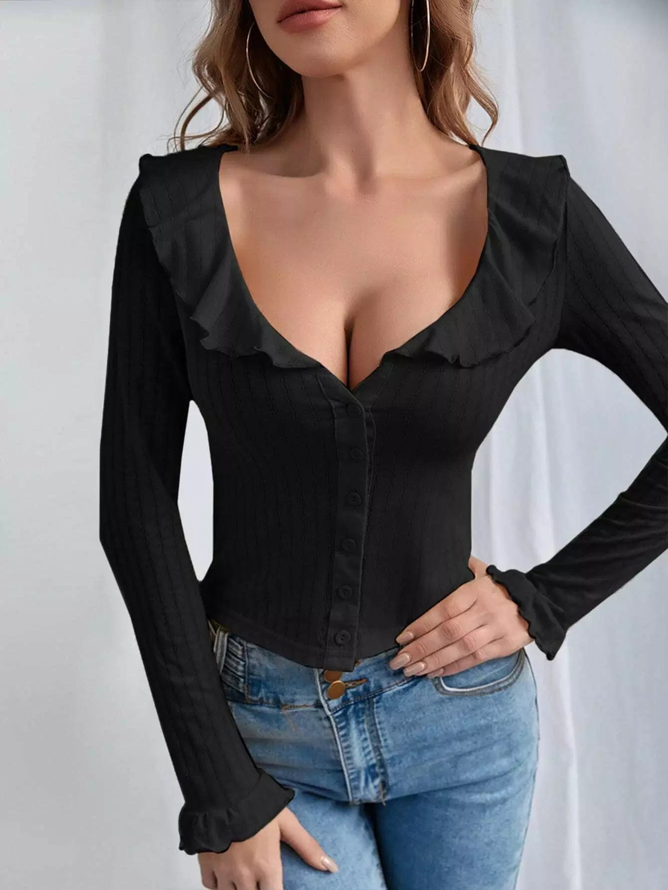 Solid Ruffle Trim Button Up Crop Top