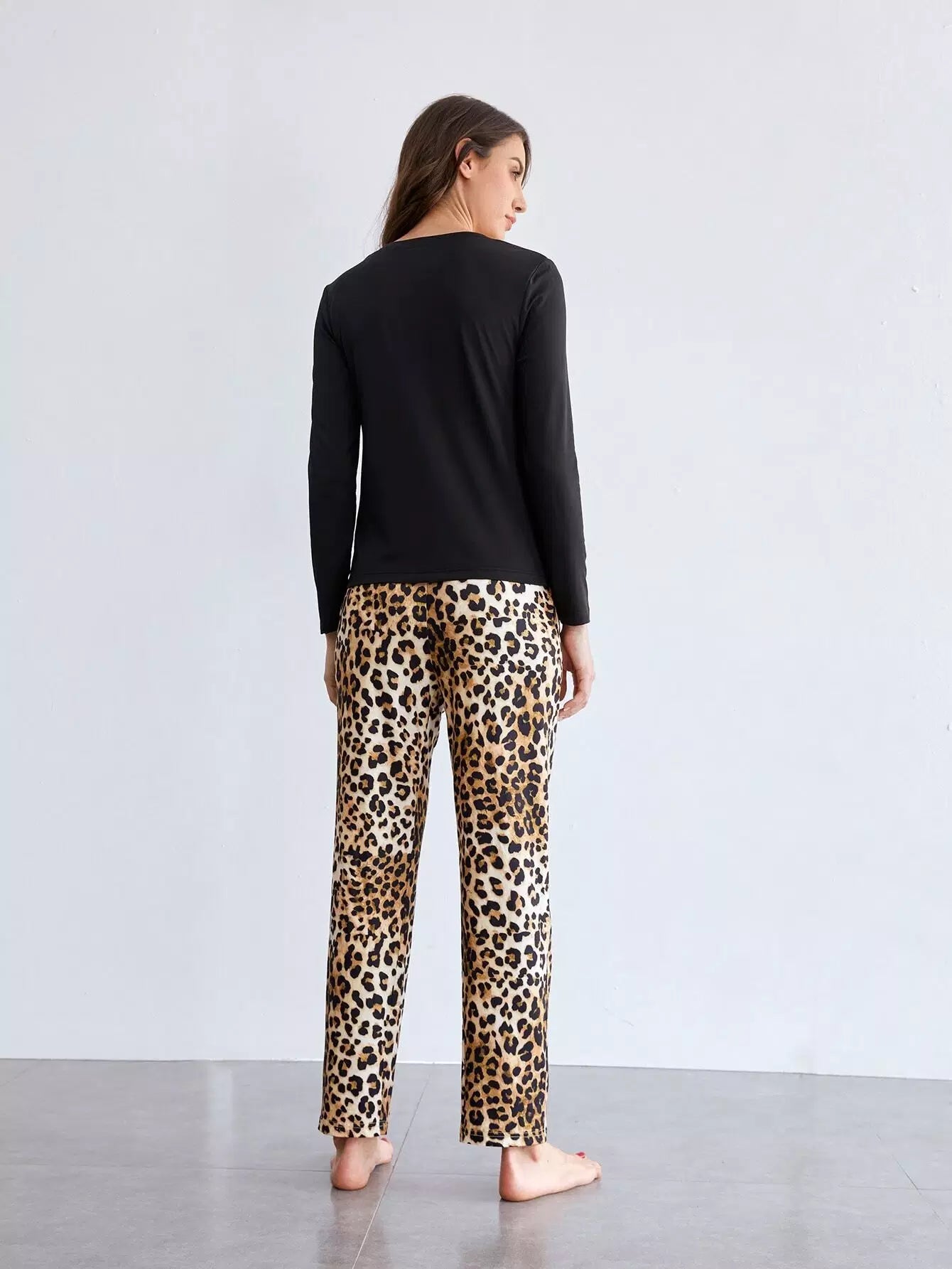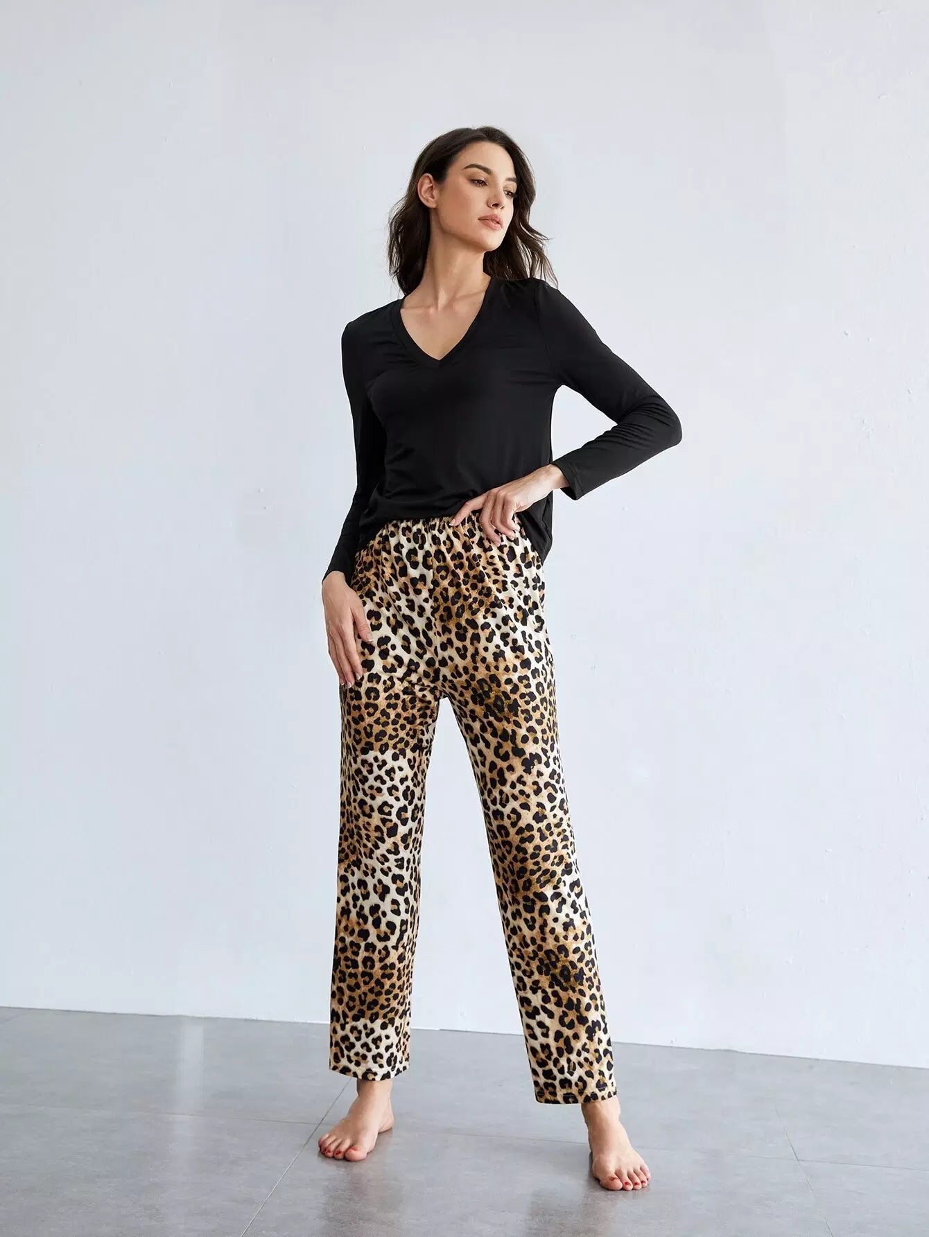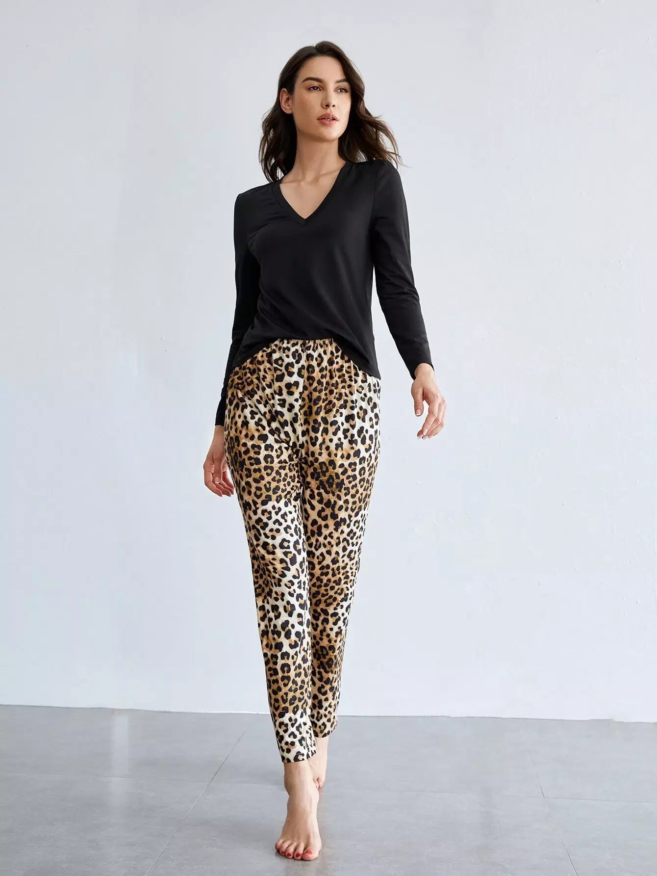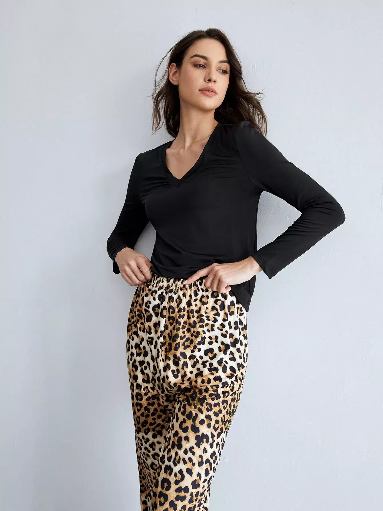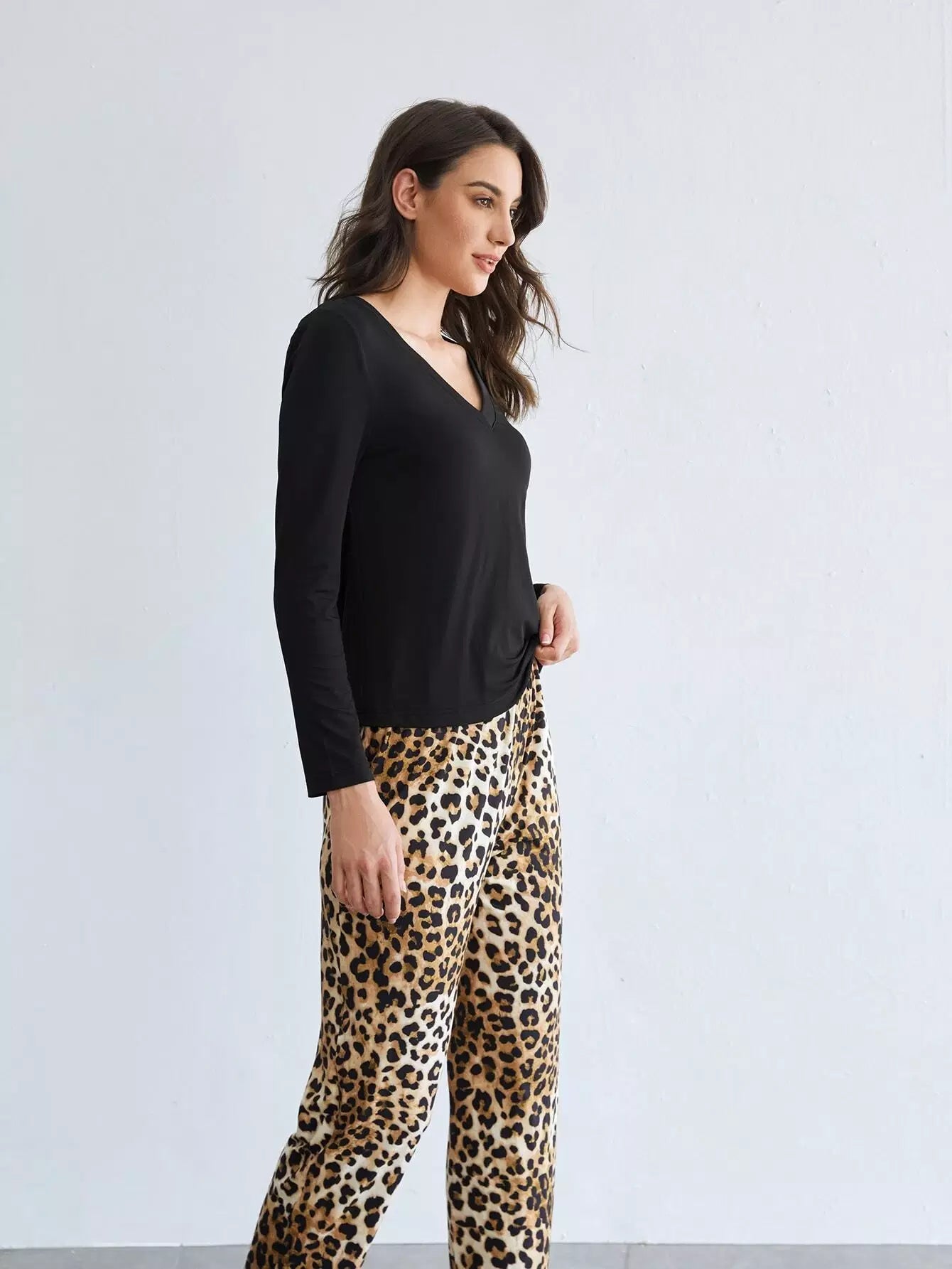Solid V Neck Tee & Leopard Print Pants PJ Set