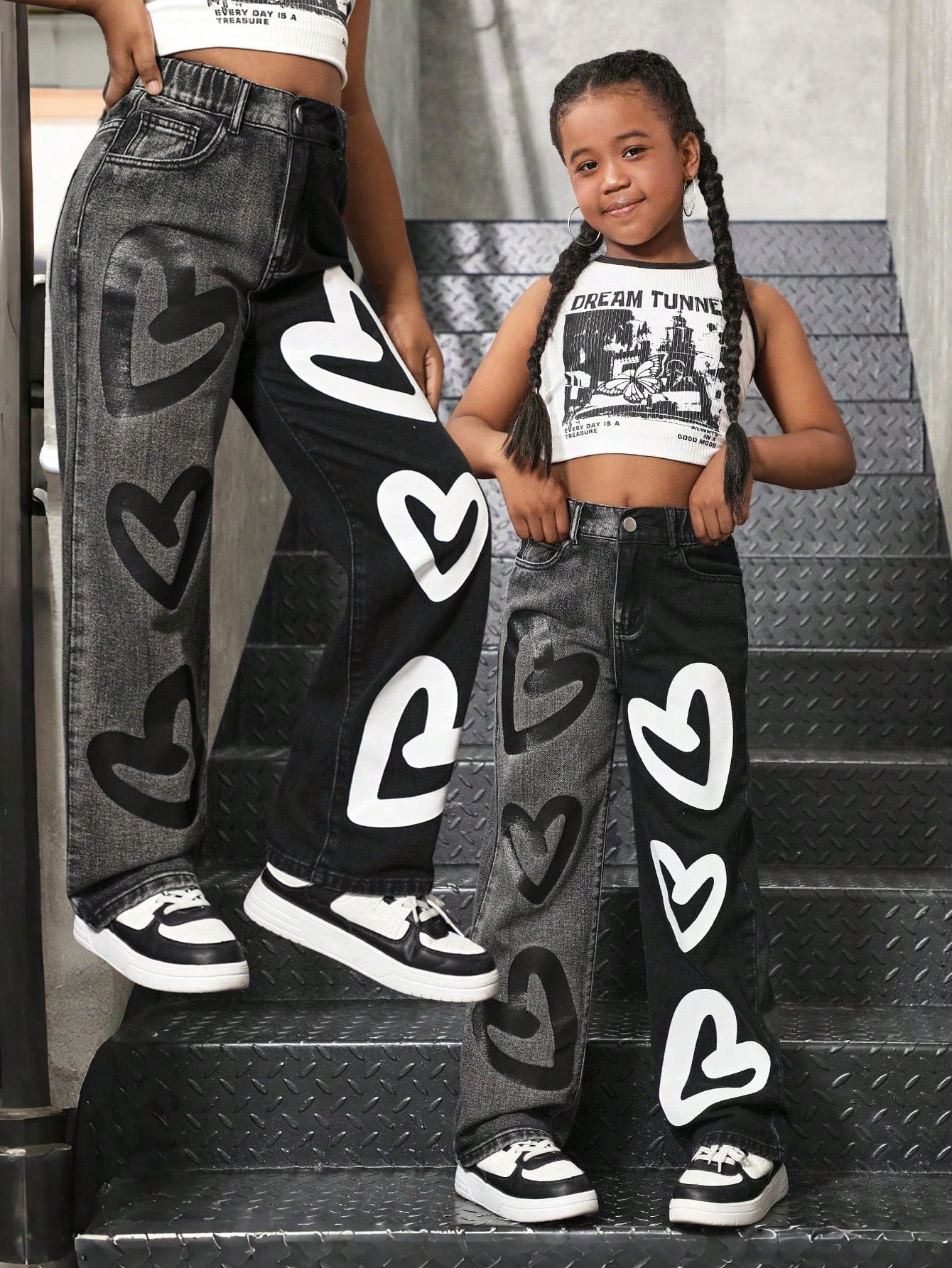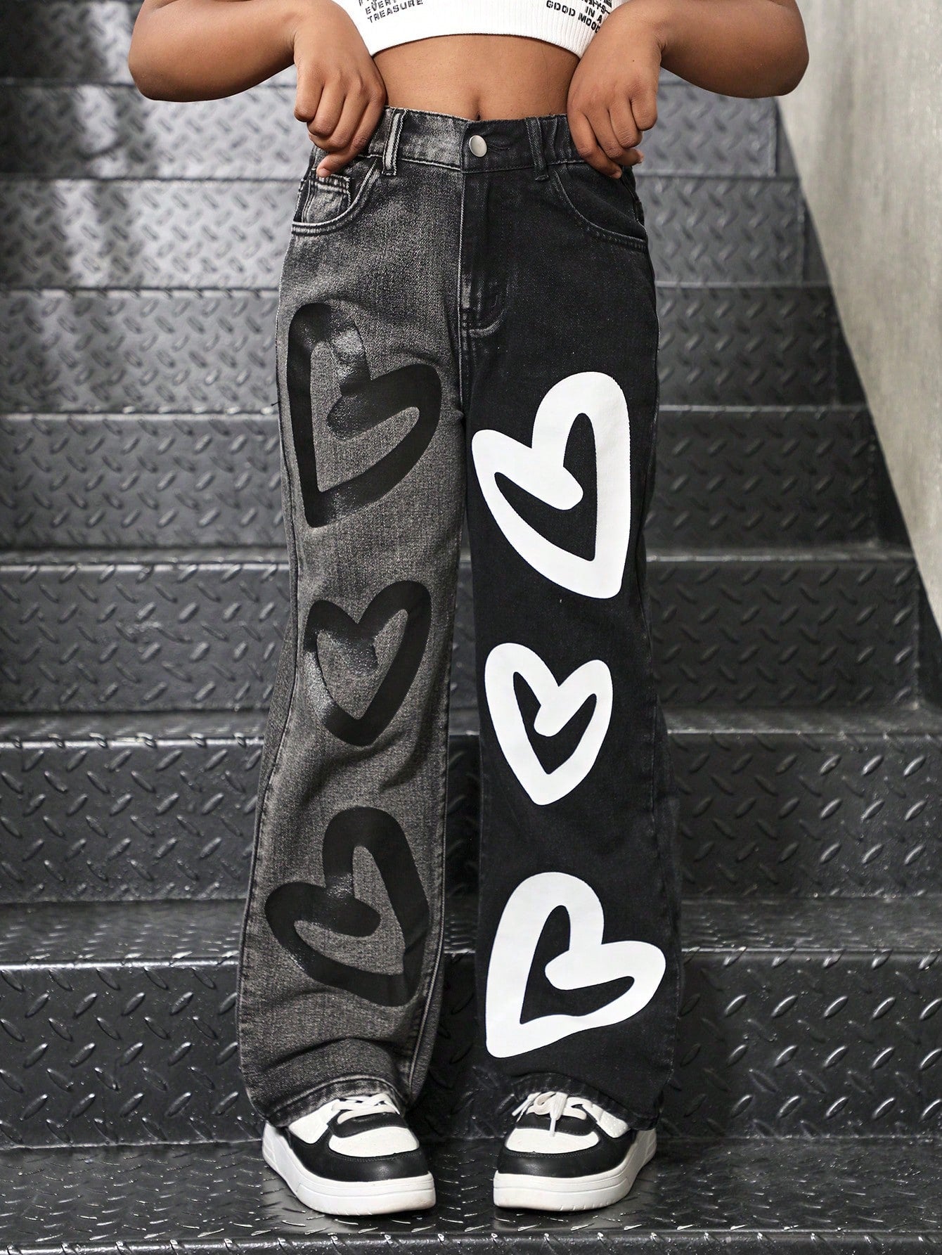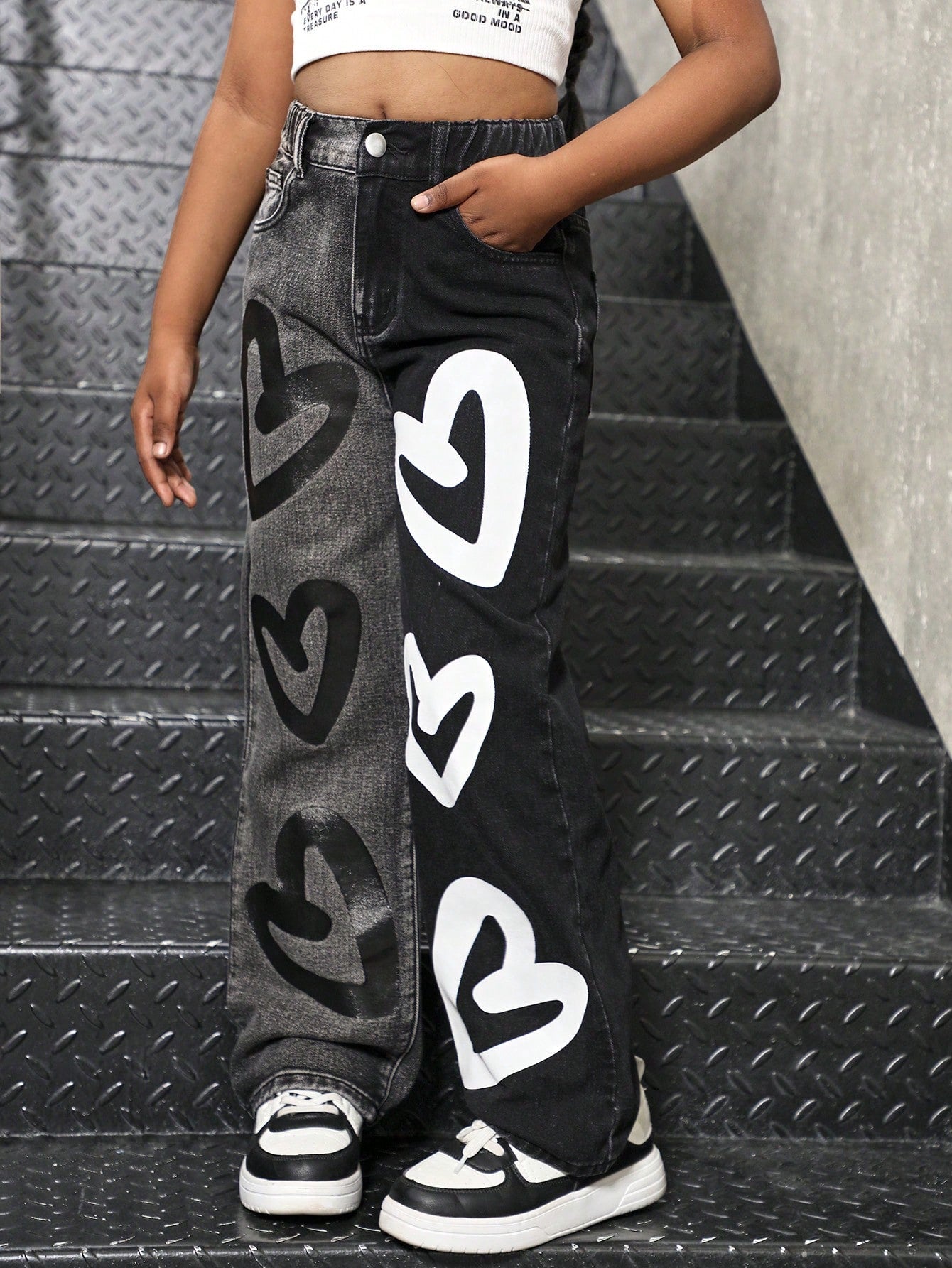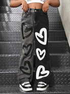 Sparklyn Tween Girls Fashionable Color Block Heart Print Loose Straight Leg Jeans