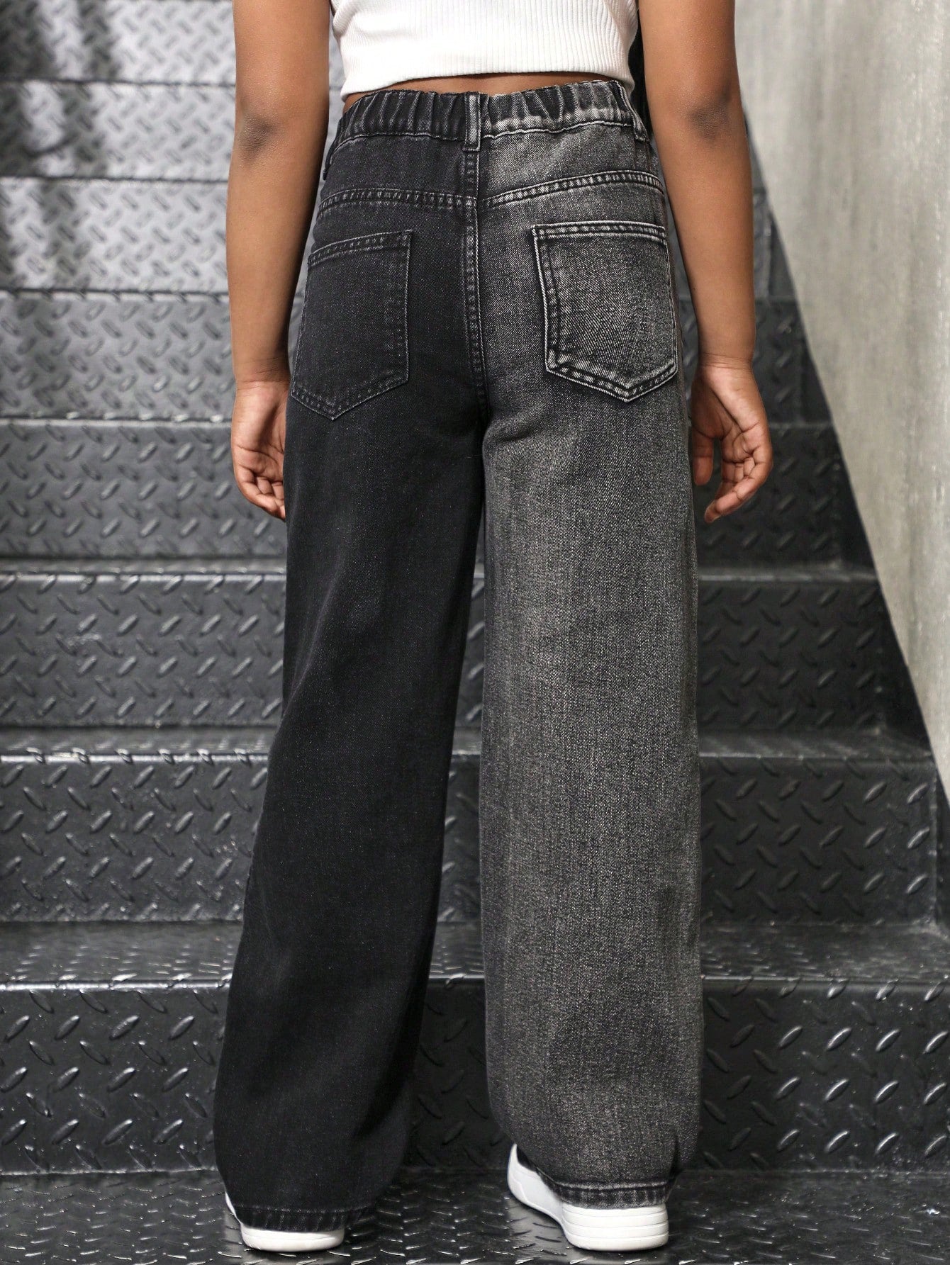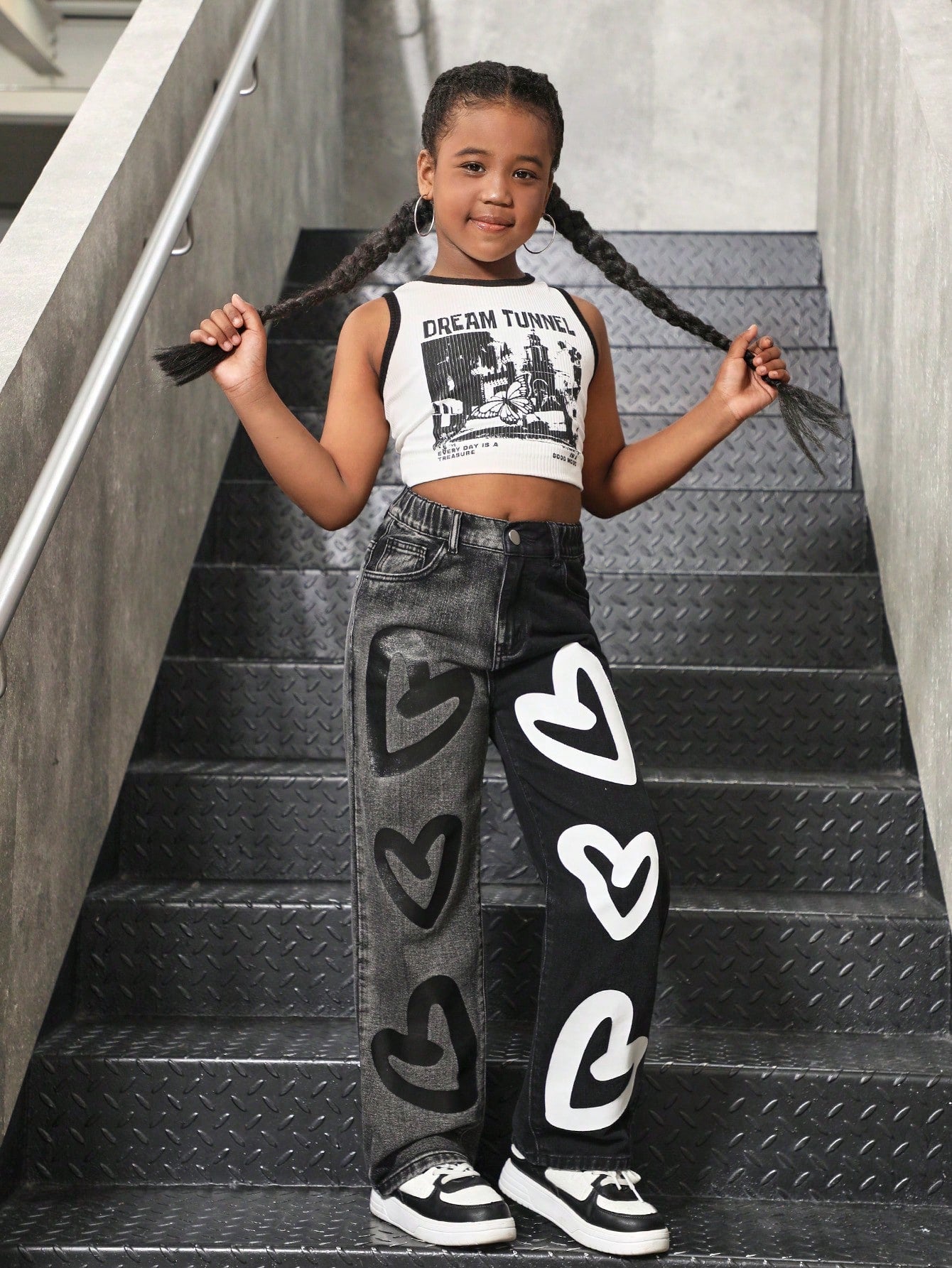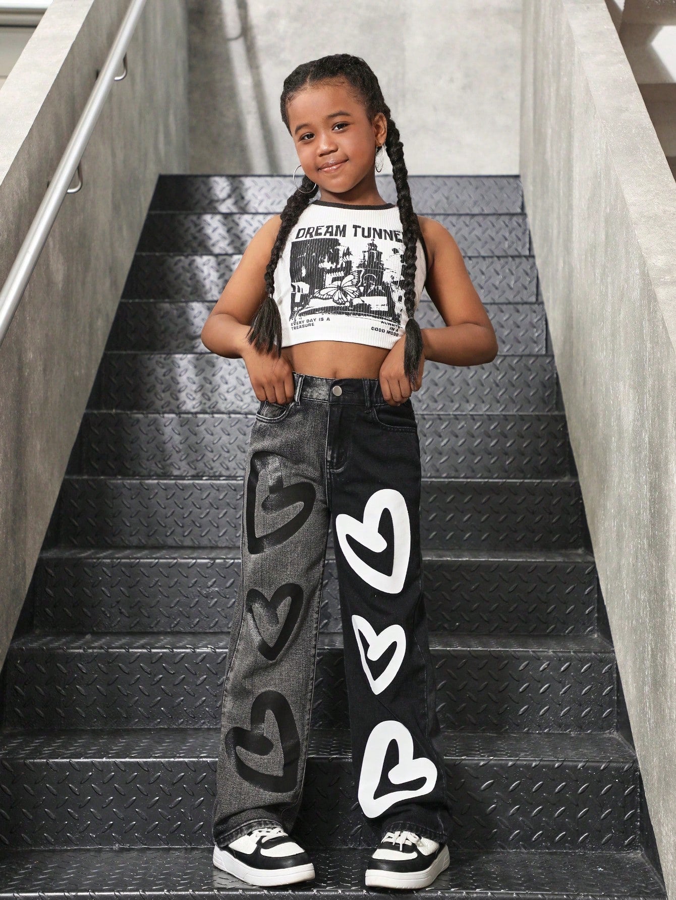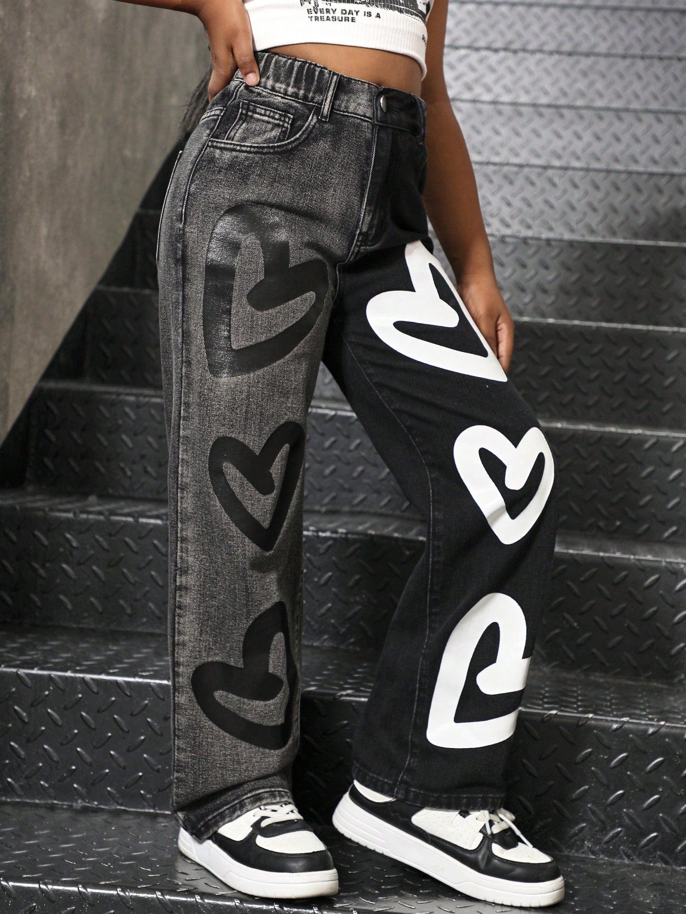 Sparklyn Tween Girls Fashionable Color Block Heart Print Loose Straight Leg Jeans