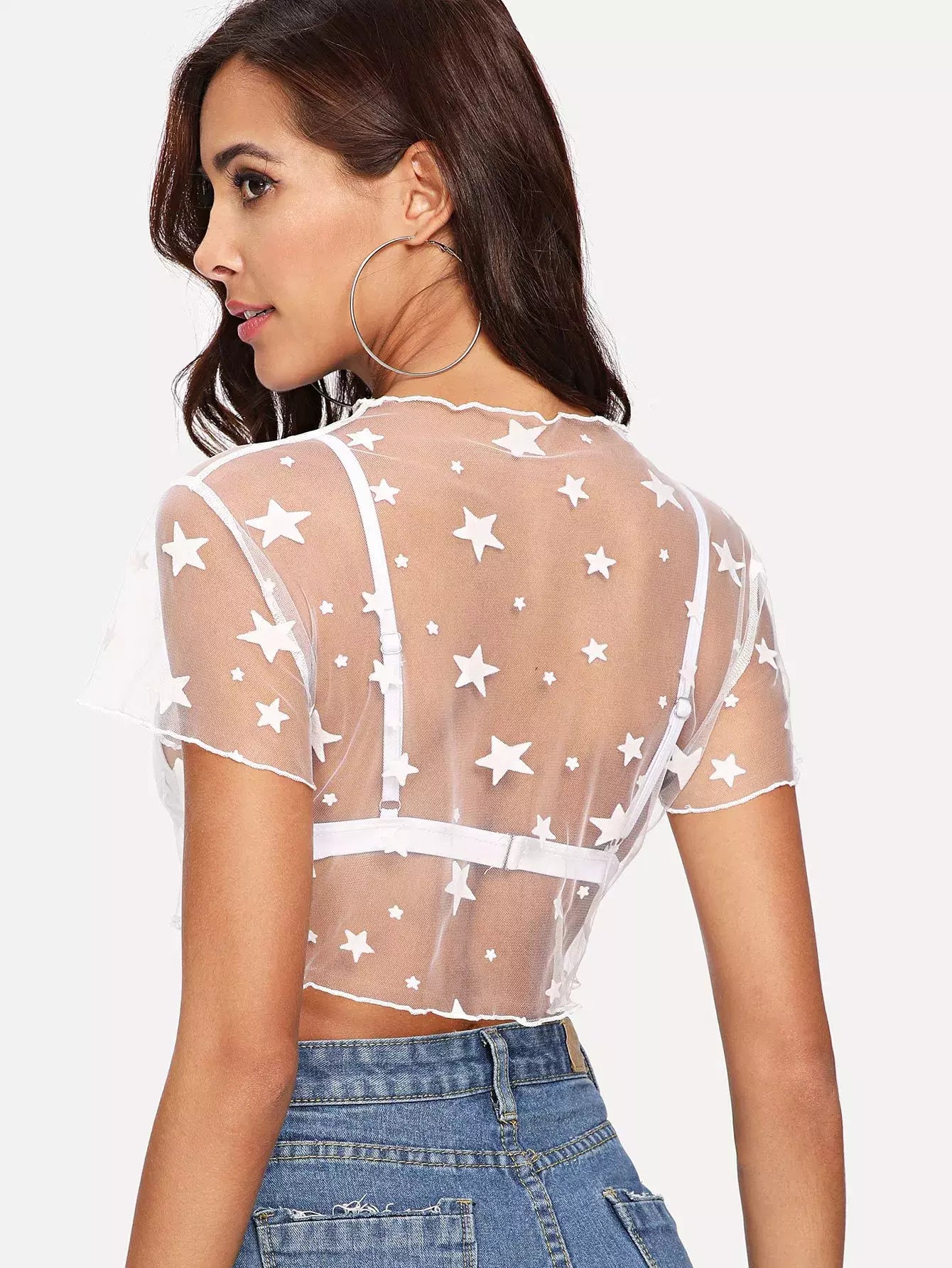 Star Print Sheer Mesh Crop Top