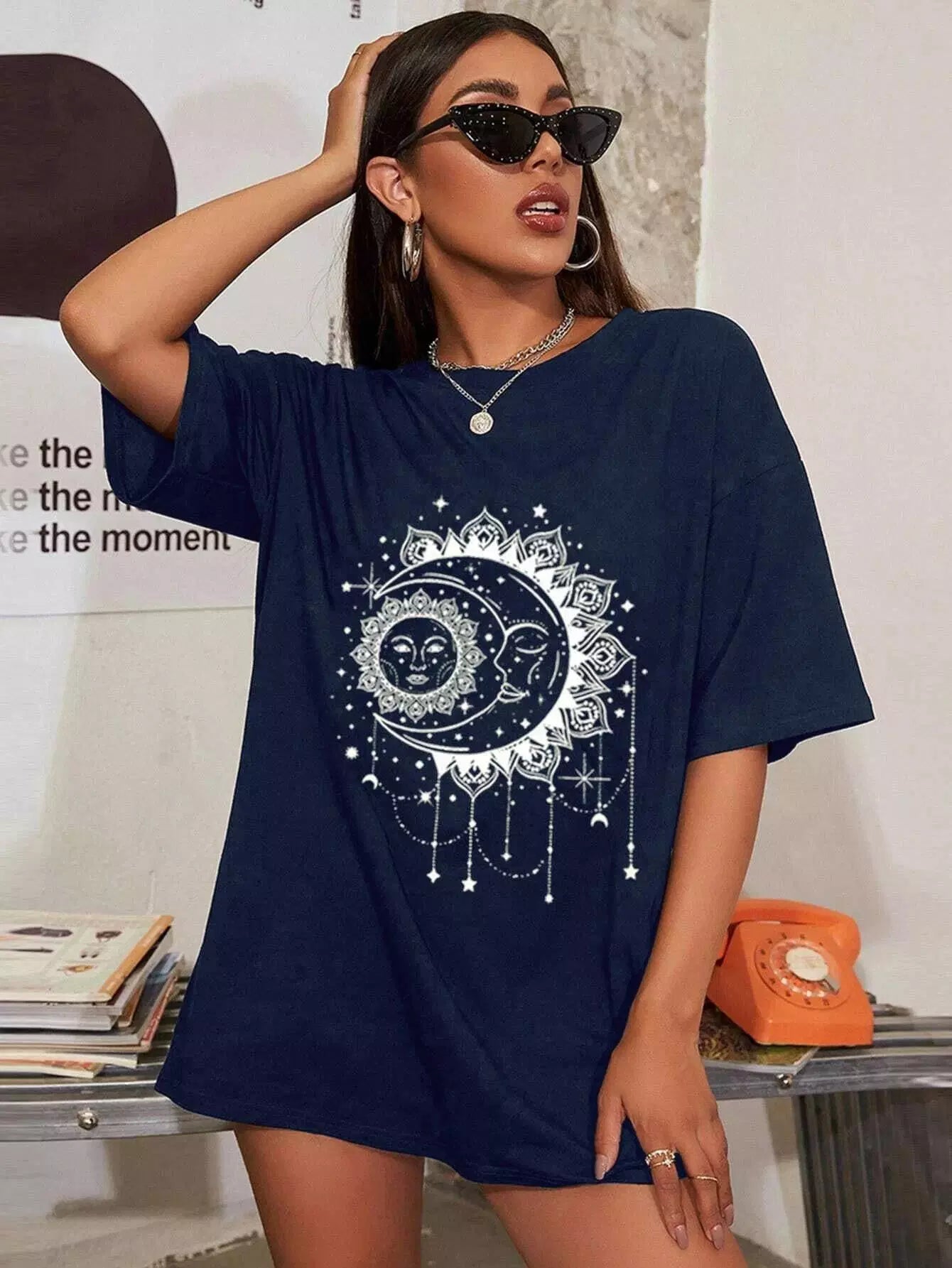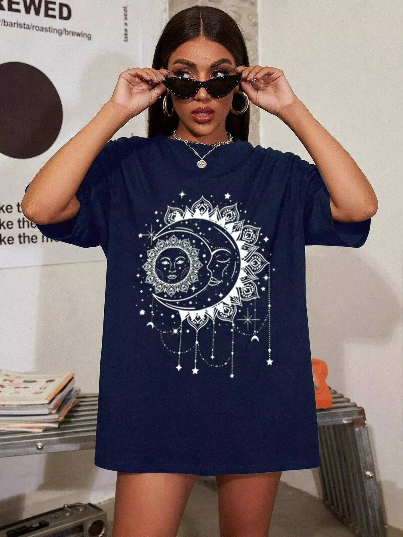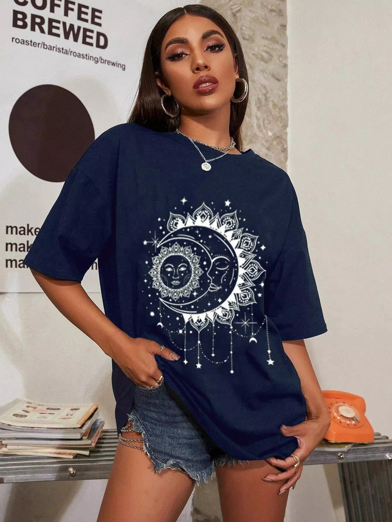 Star & Sun Print Oversized Tee