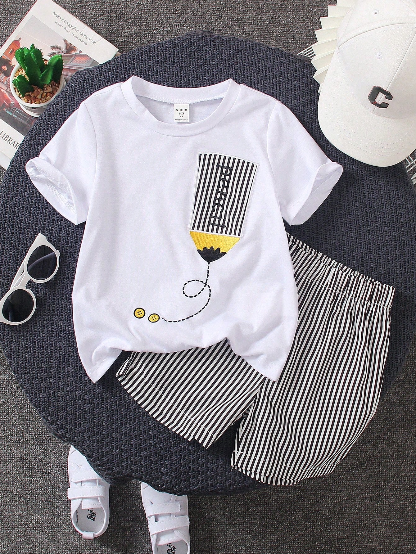 Streecool Kids 2pcs/Set Young Boy Academy Embroidered Pencil Design & Striped Casual Shorts