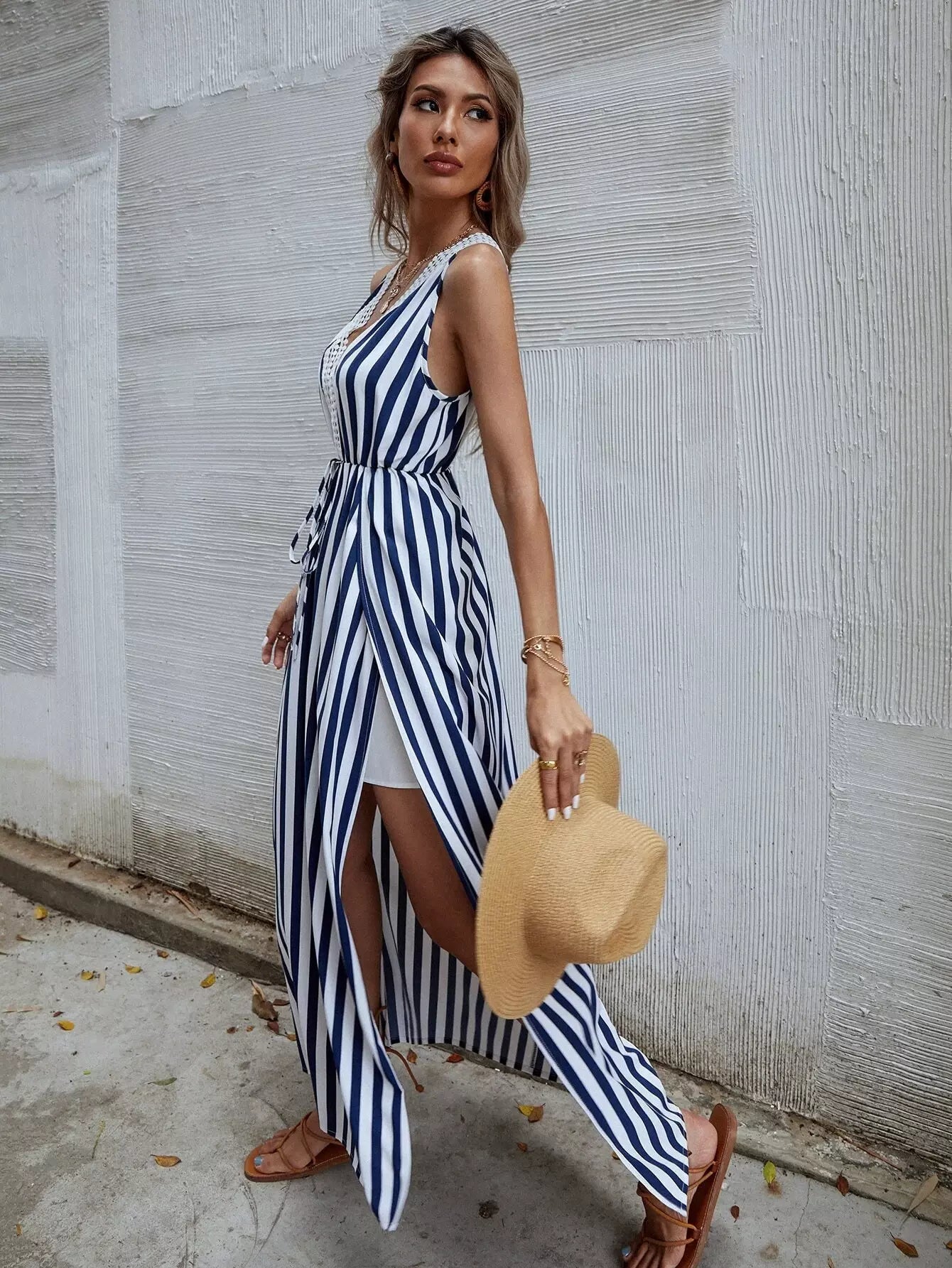 Striped Print Split Thigh A-line Dress