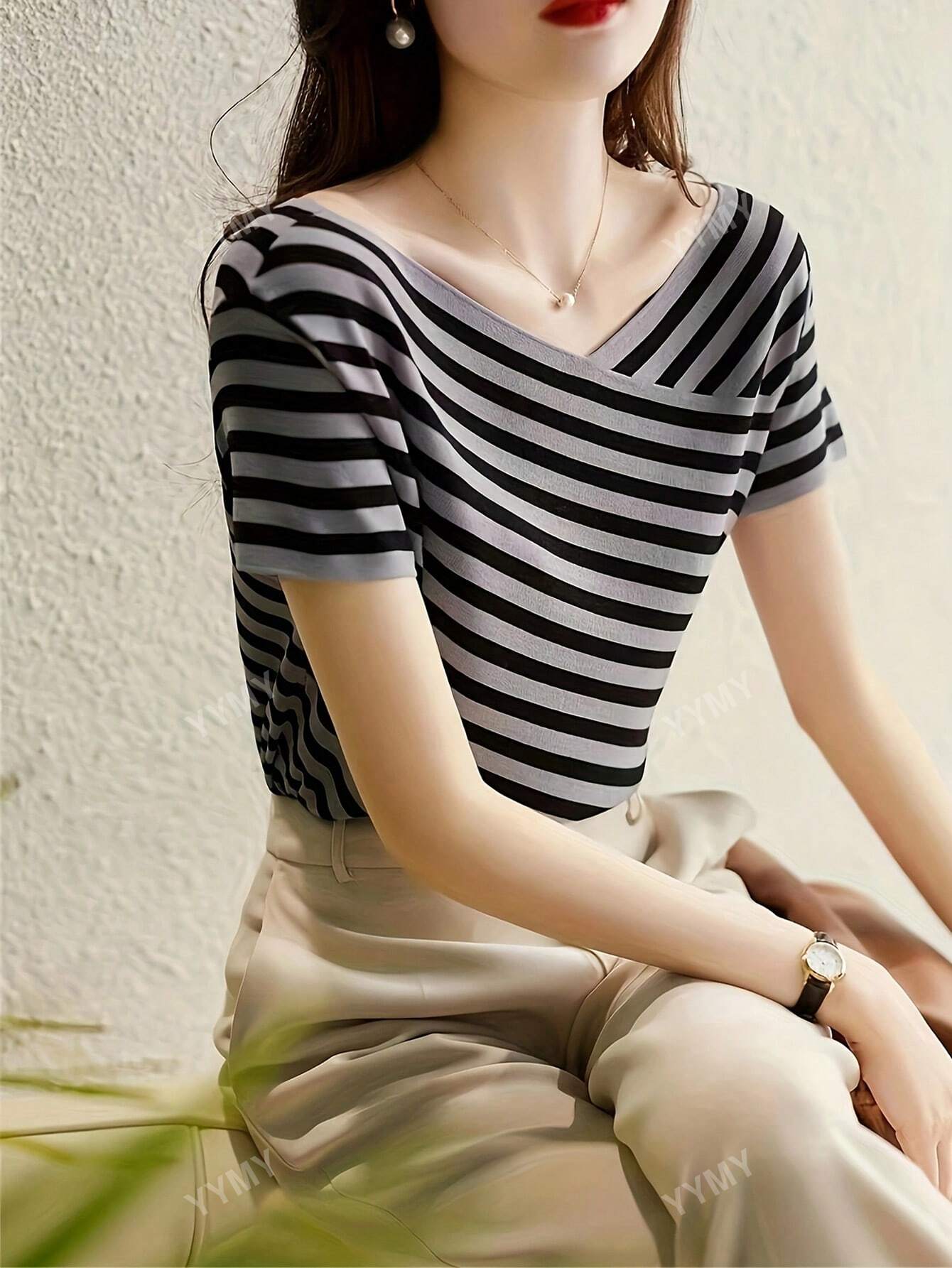 women Striped V-Neck Casual Knit Top