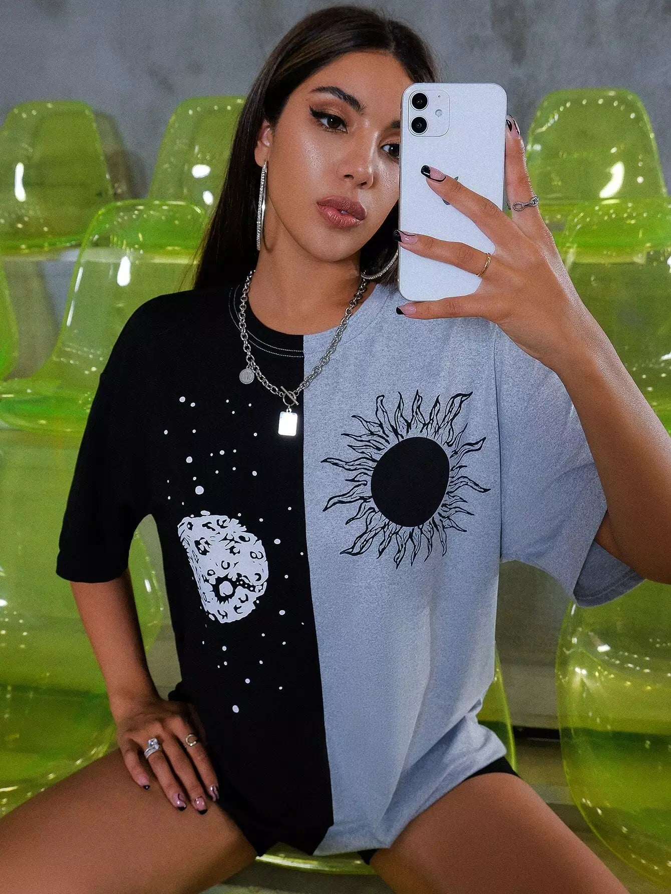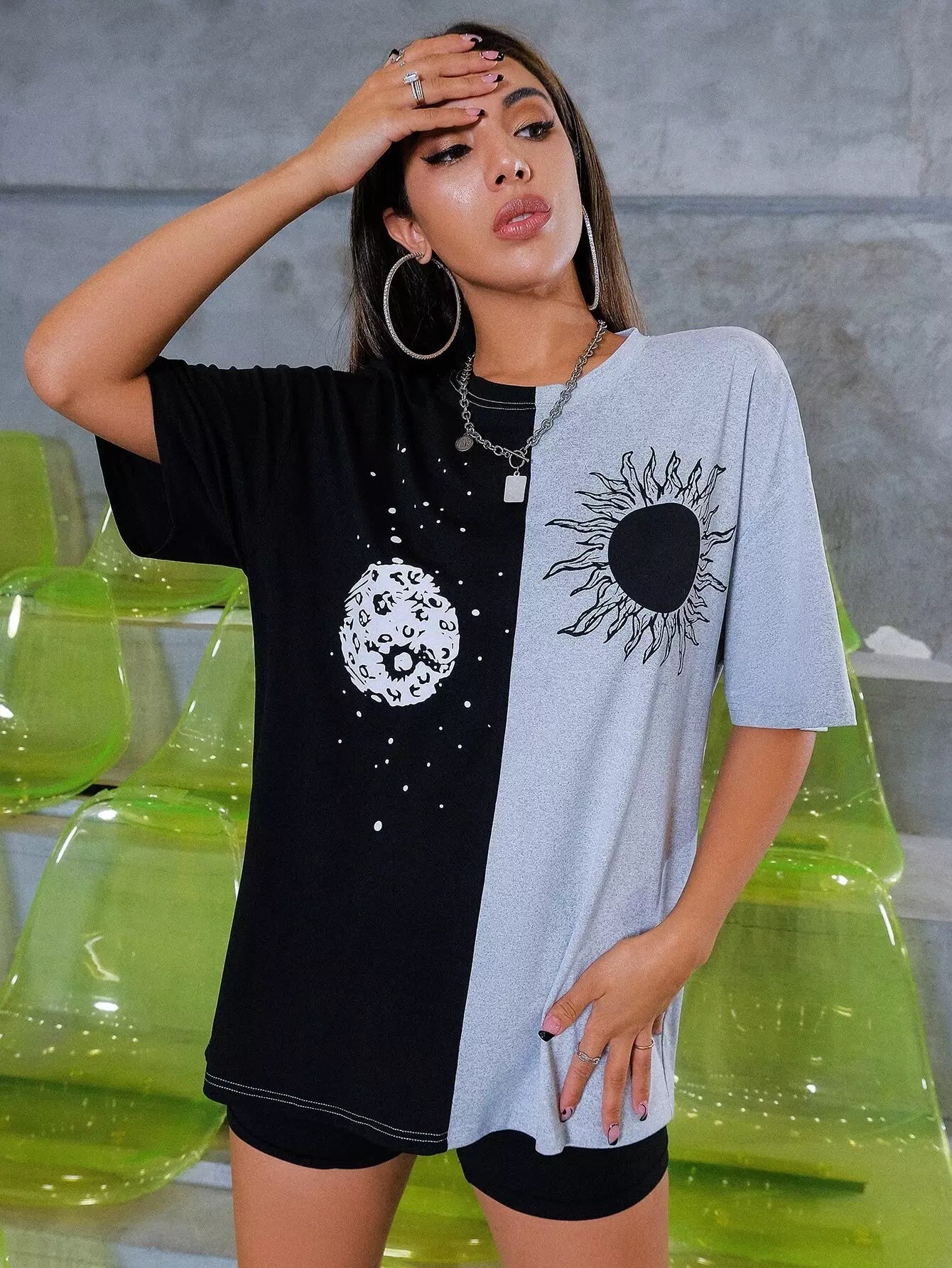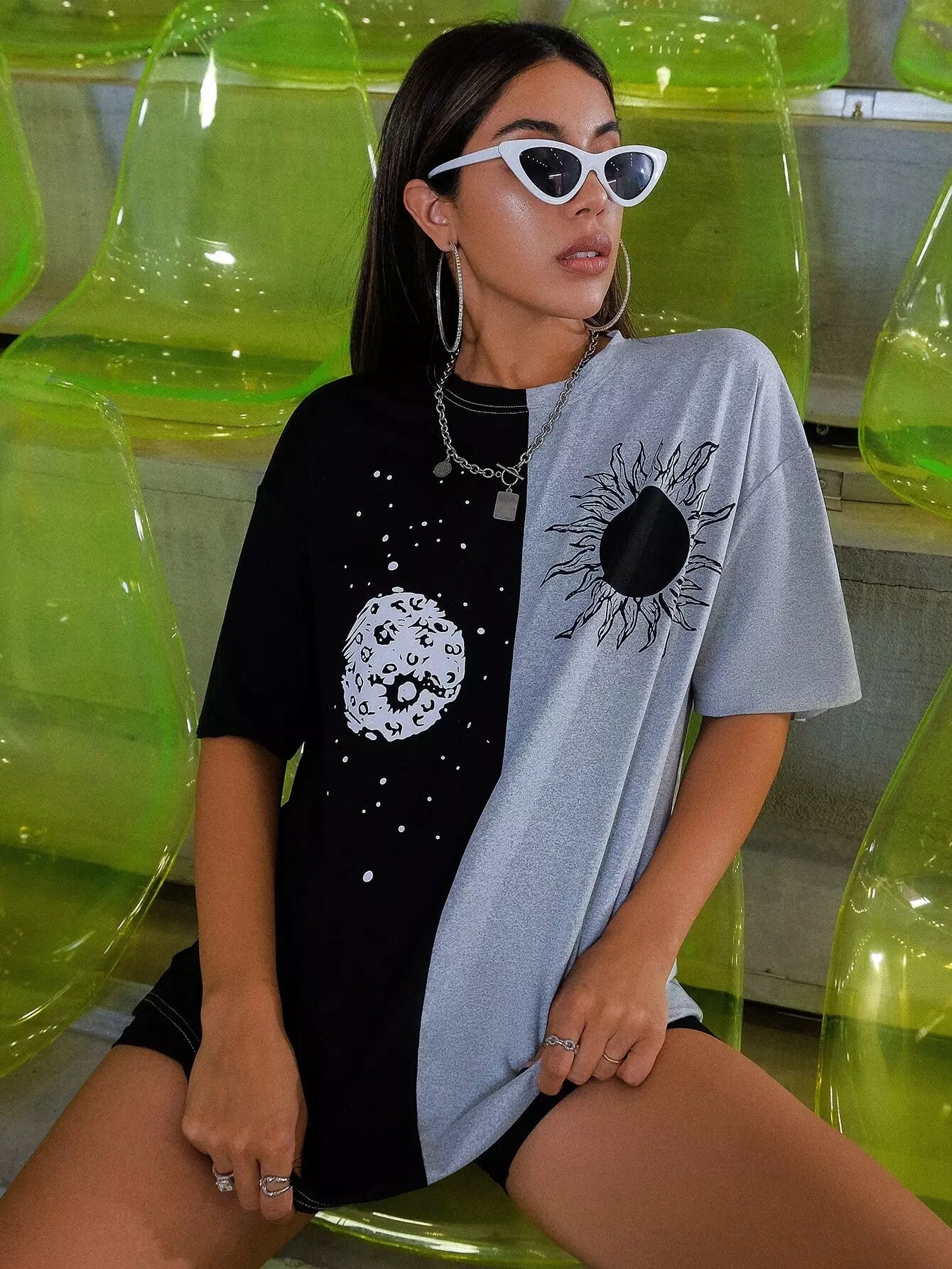Sun & Moon Print Two Tone Drop Shoulder Longline Tee