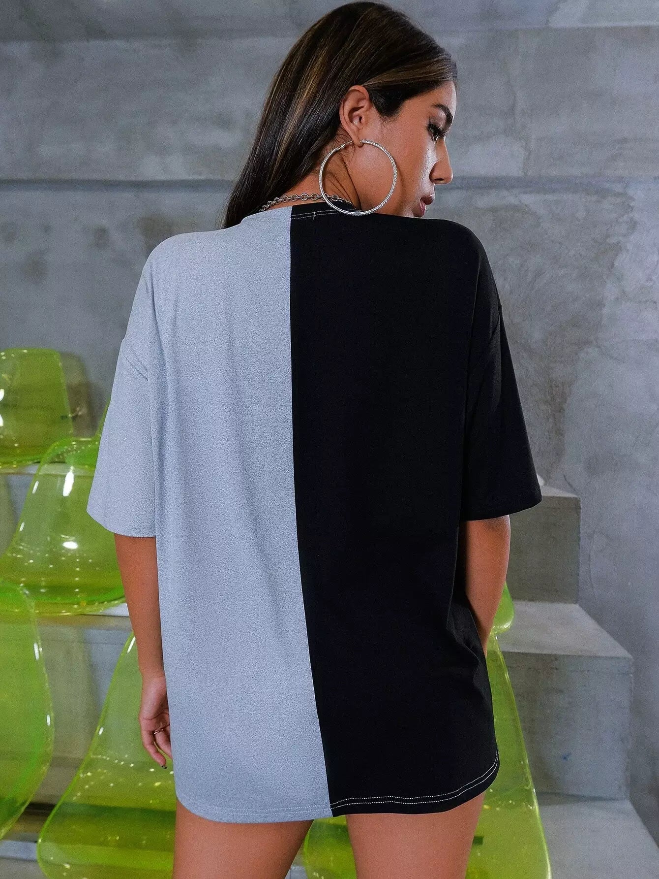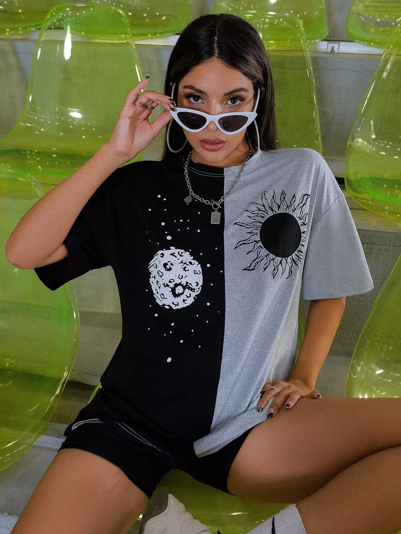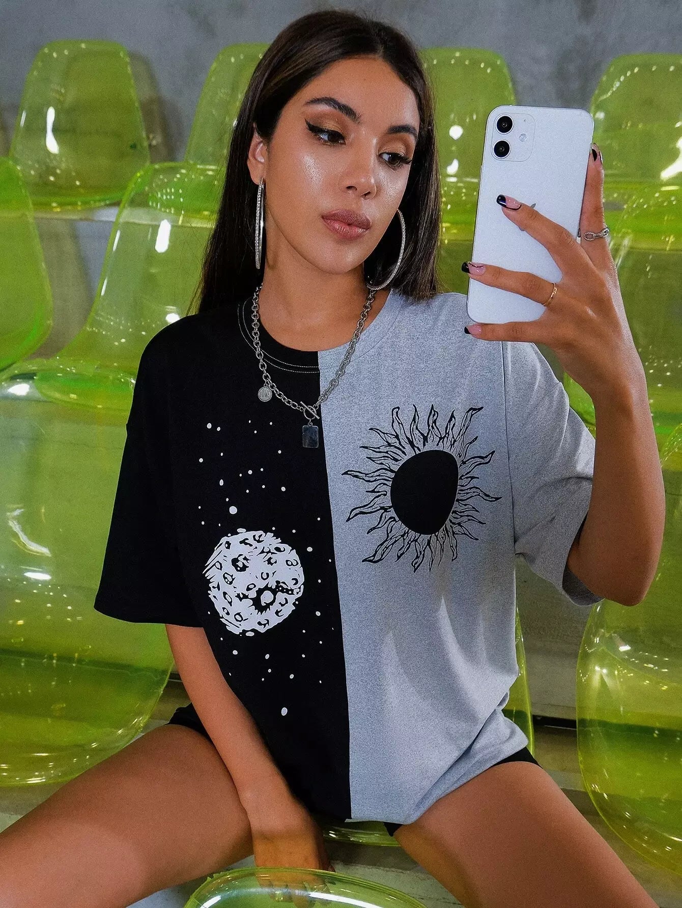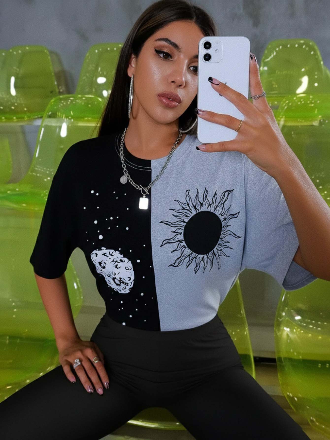 Sun & Moon Print Two Tone Drop Shoulder Longline Tee