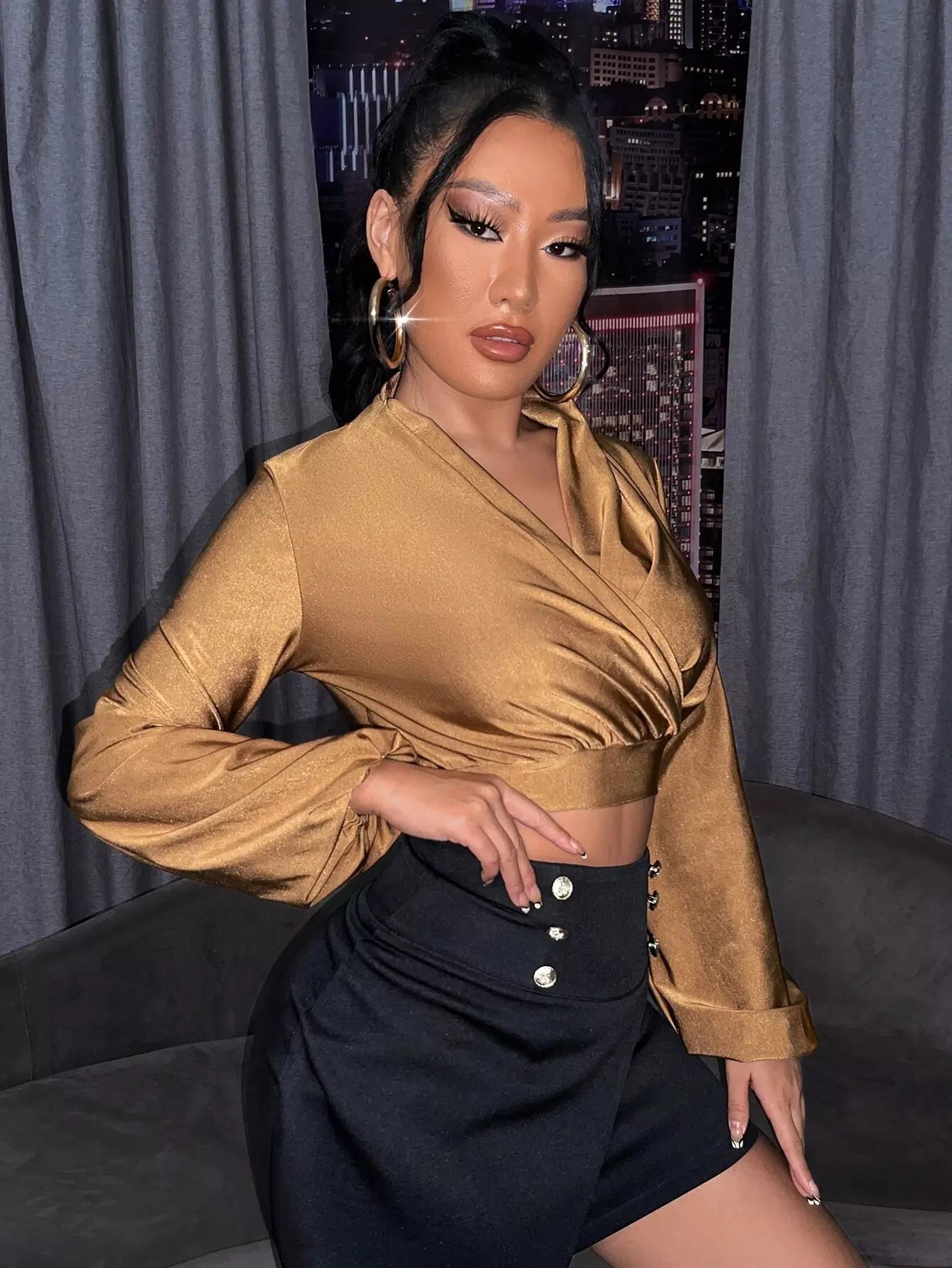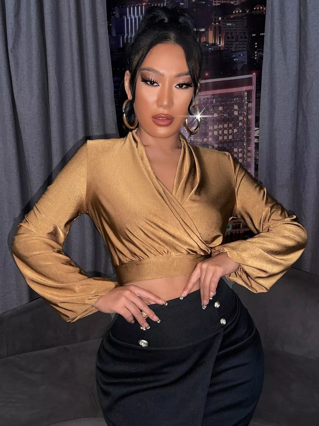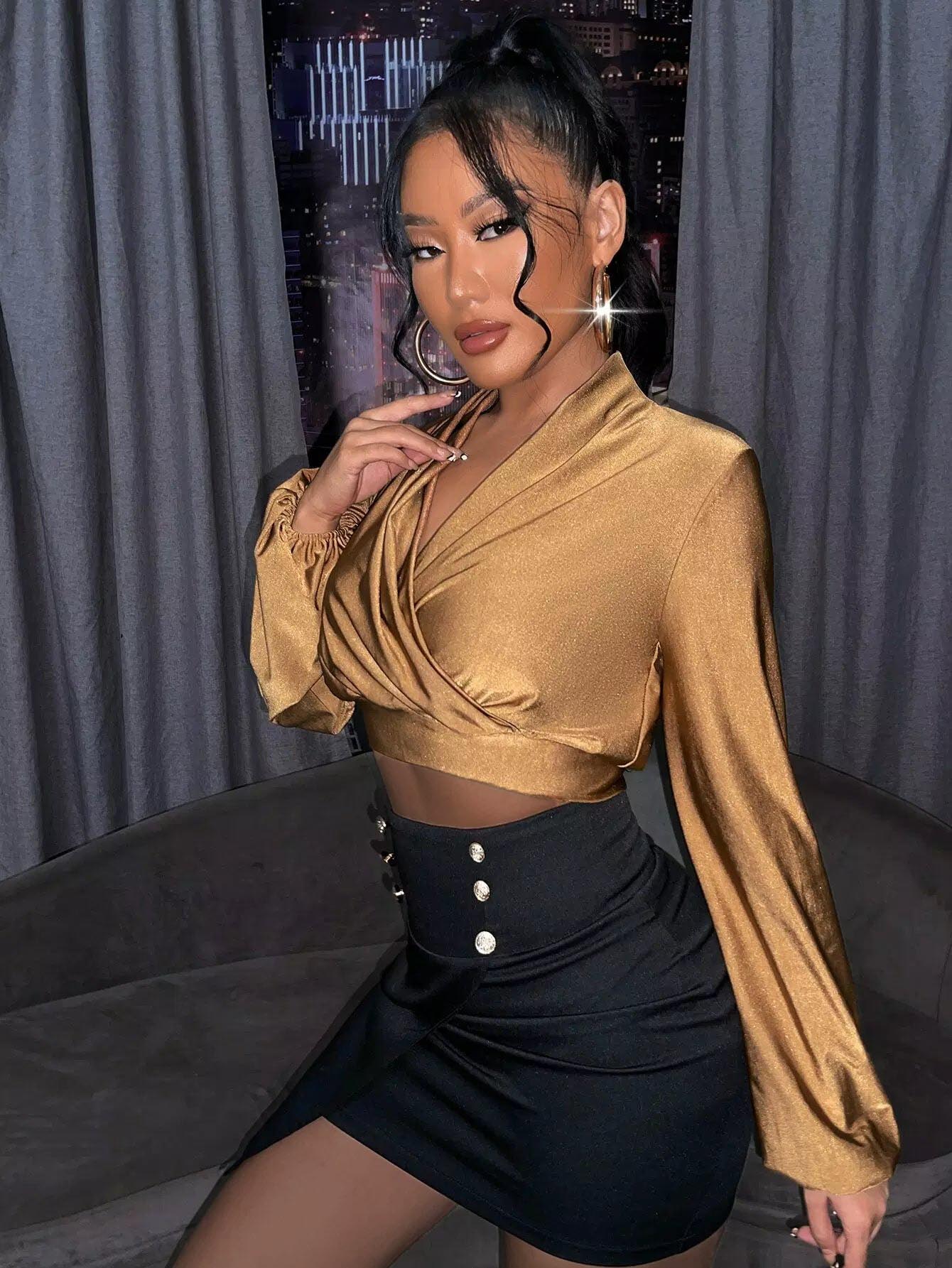 Surplice Neck Lantern Sleeve Crop Top