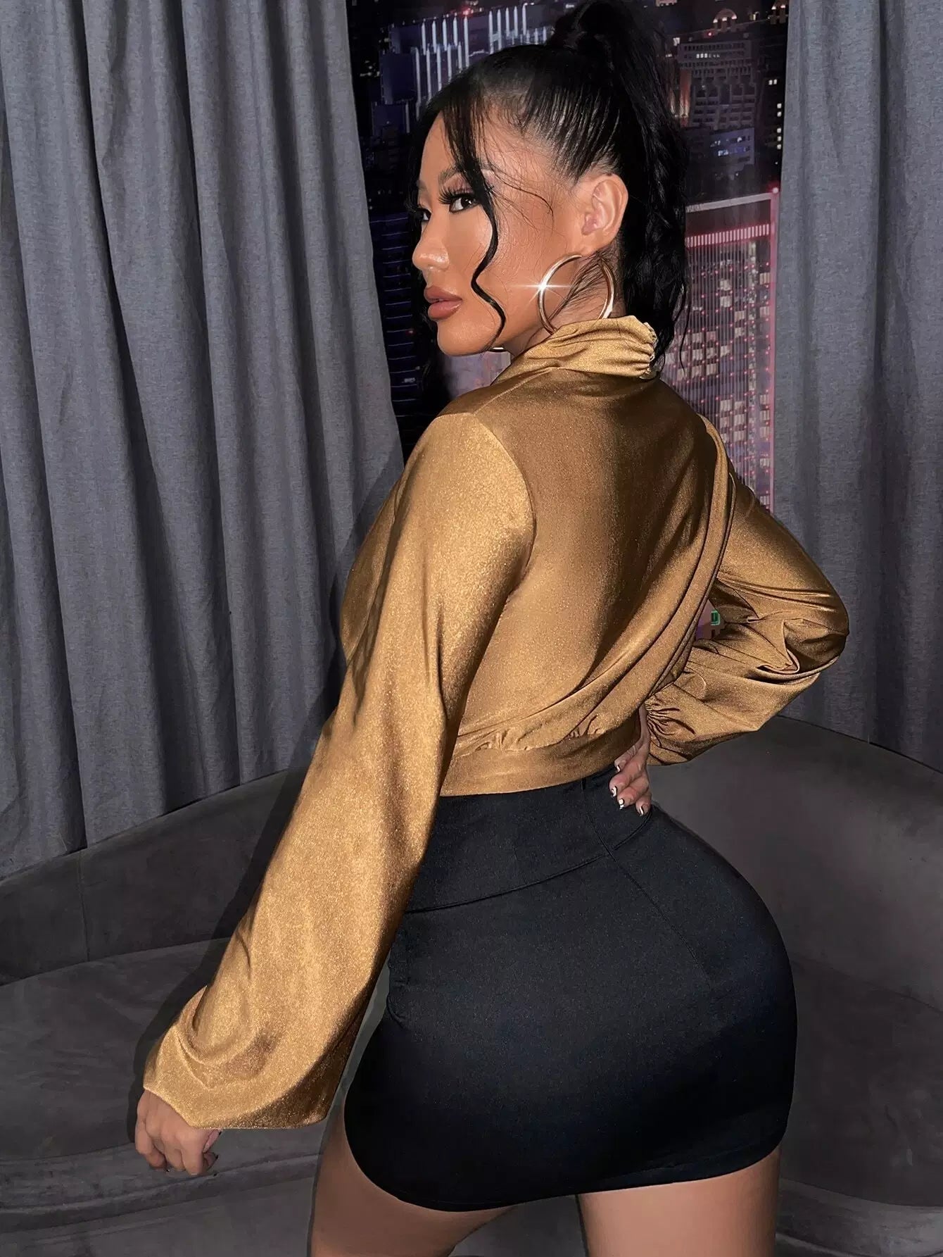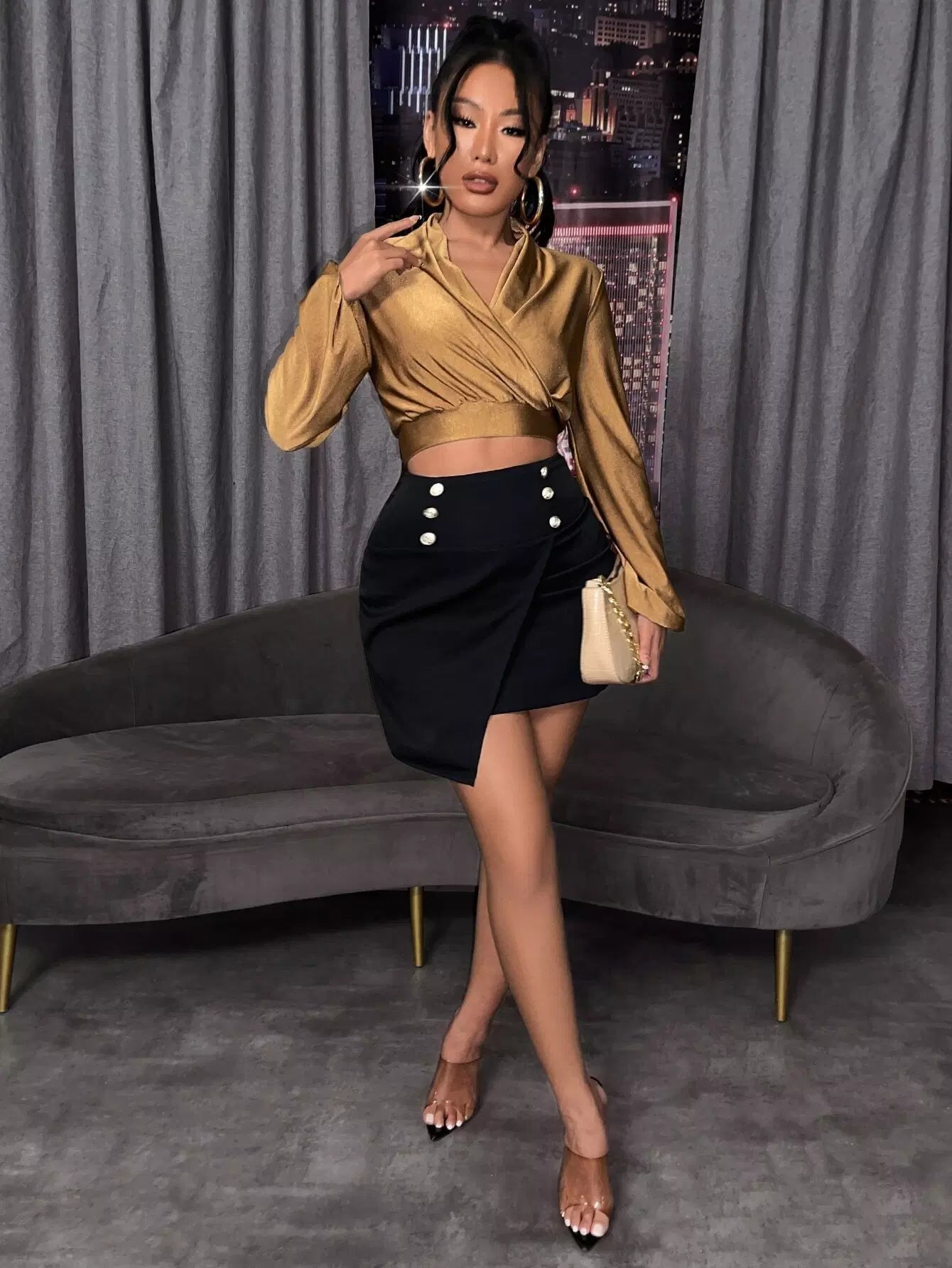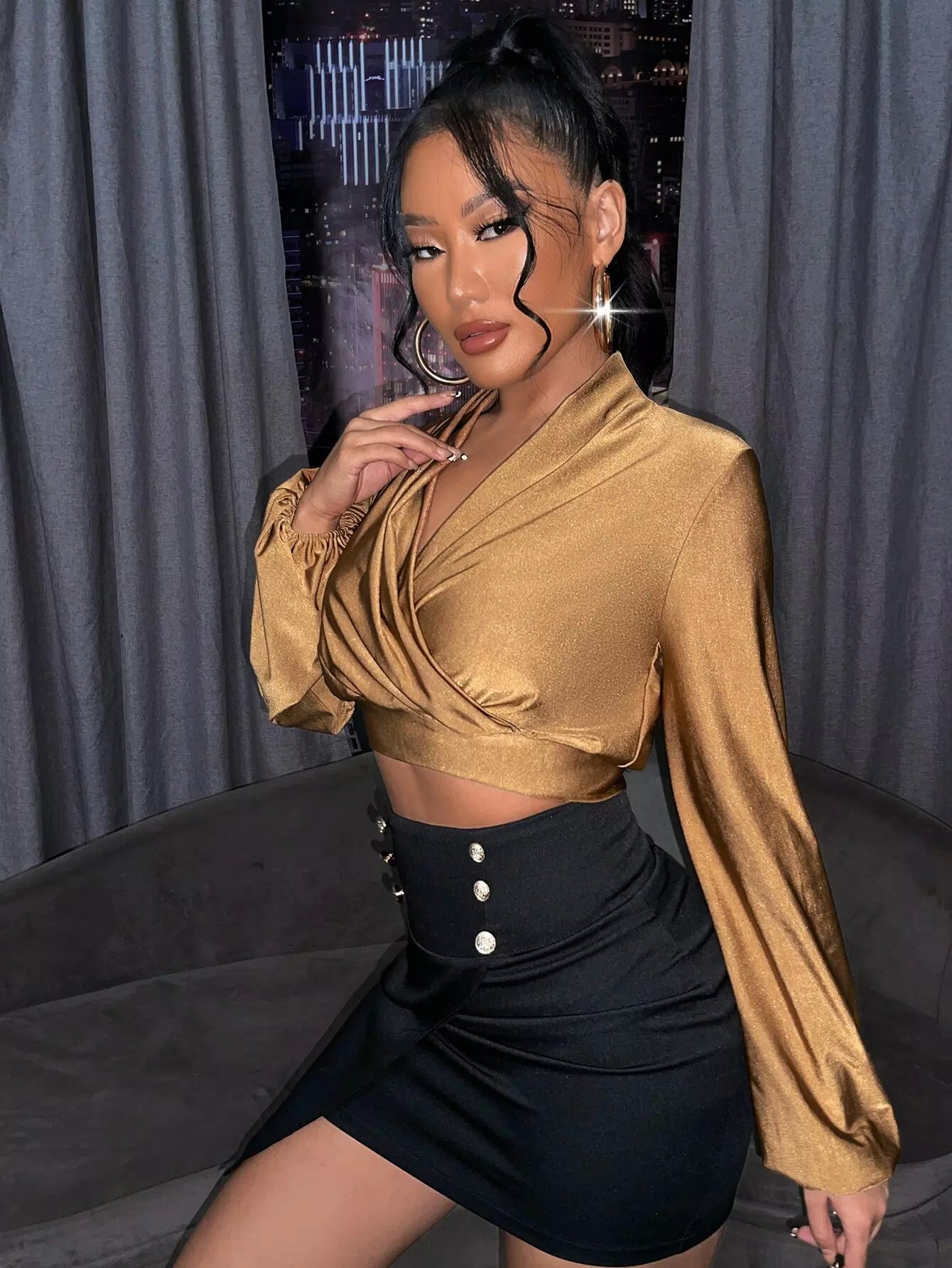 Surplice Neck Lantern Sleeve Crop Top