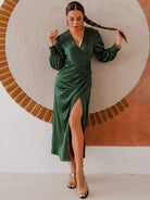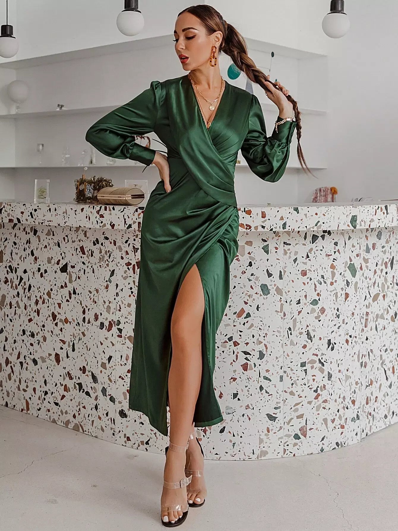 Women - Surplice Neck Ruched Wrap Satin Dress