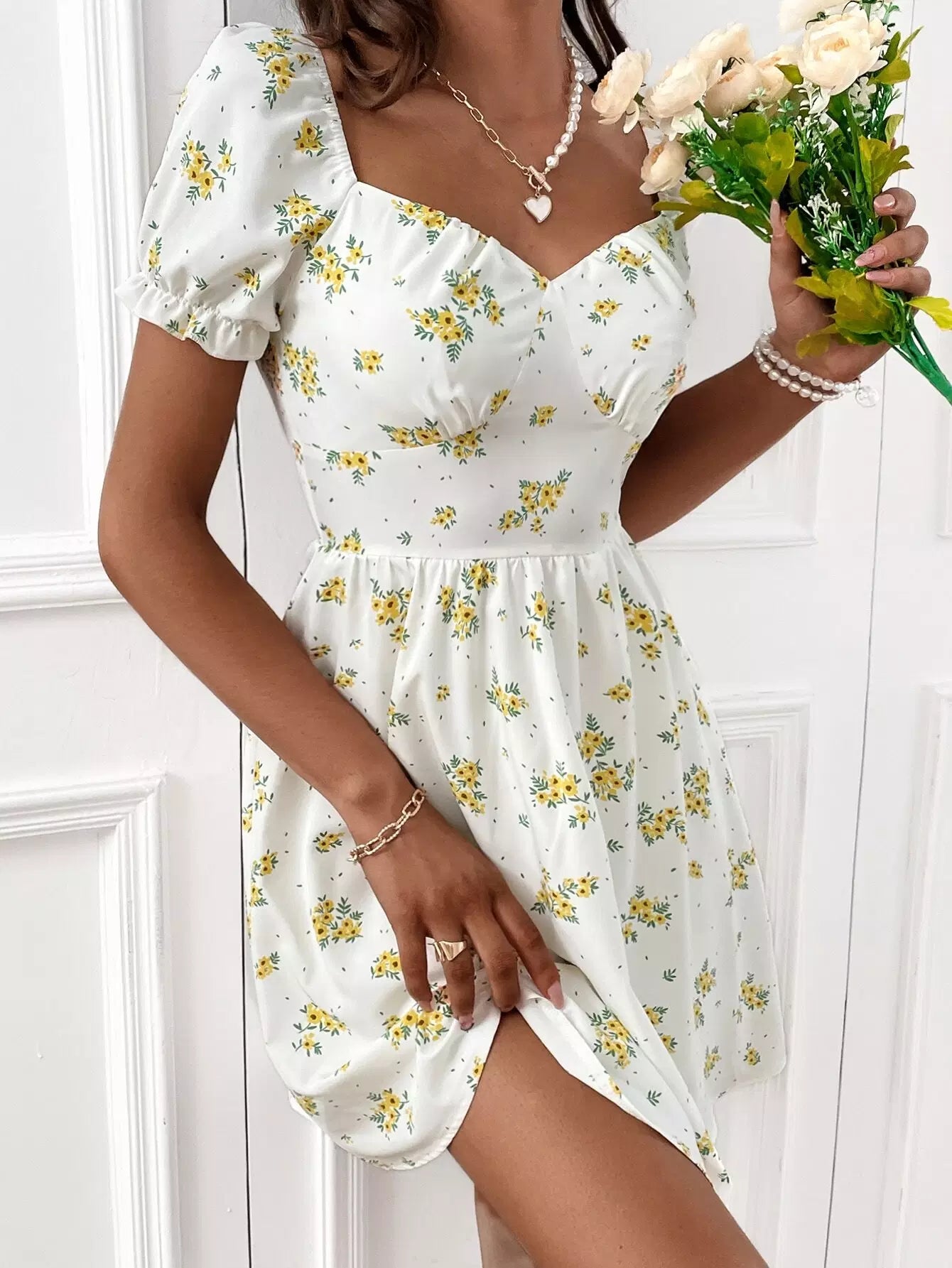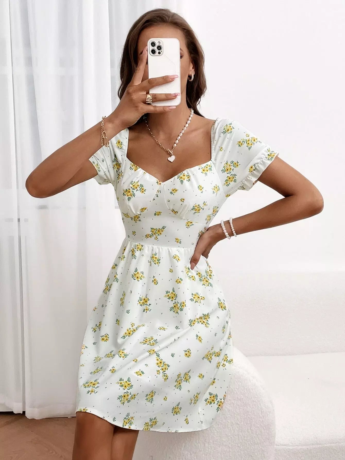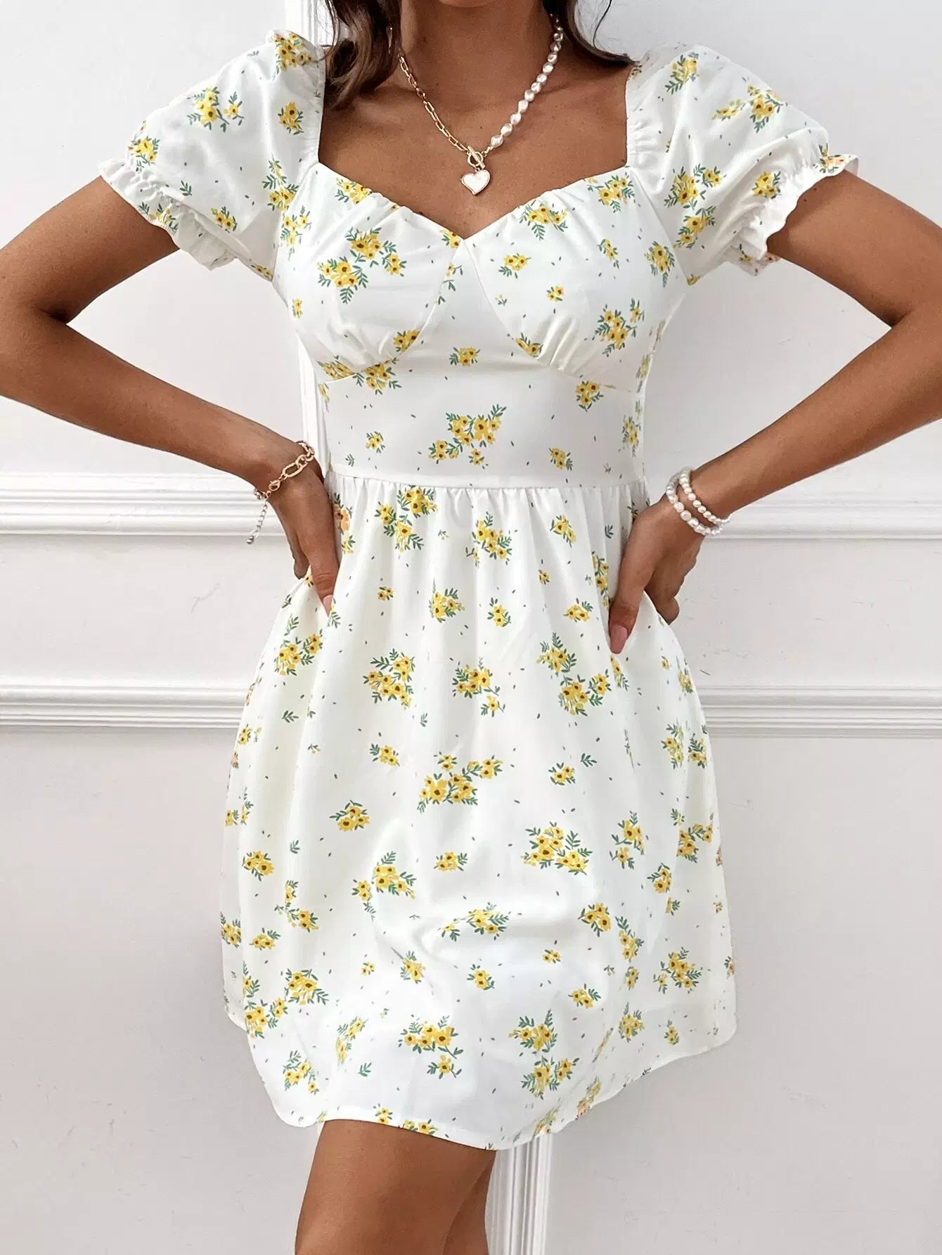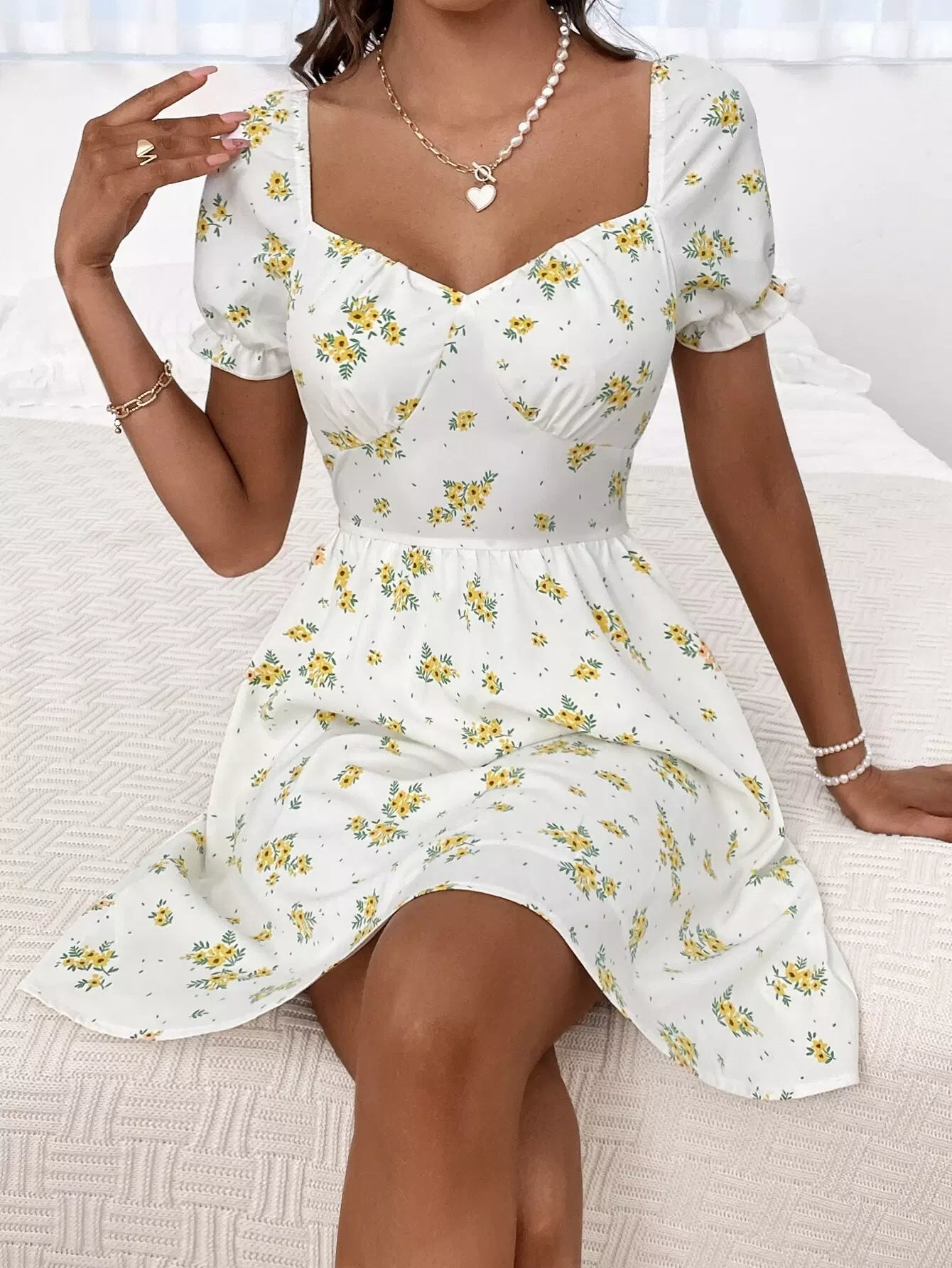 Sweetheart Neck Frill Trim Floral Print Dress