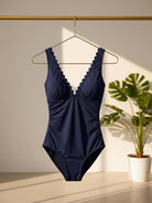 Swim Basics 2pcs Set Solid Color Scallop Trim Tankini One-Piece Swimsuit Set