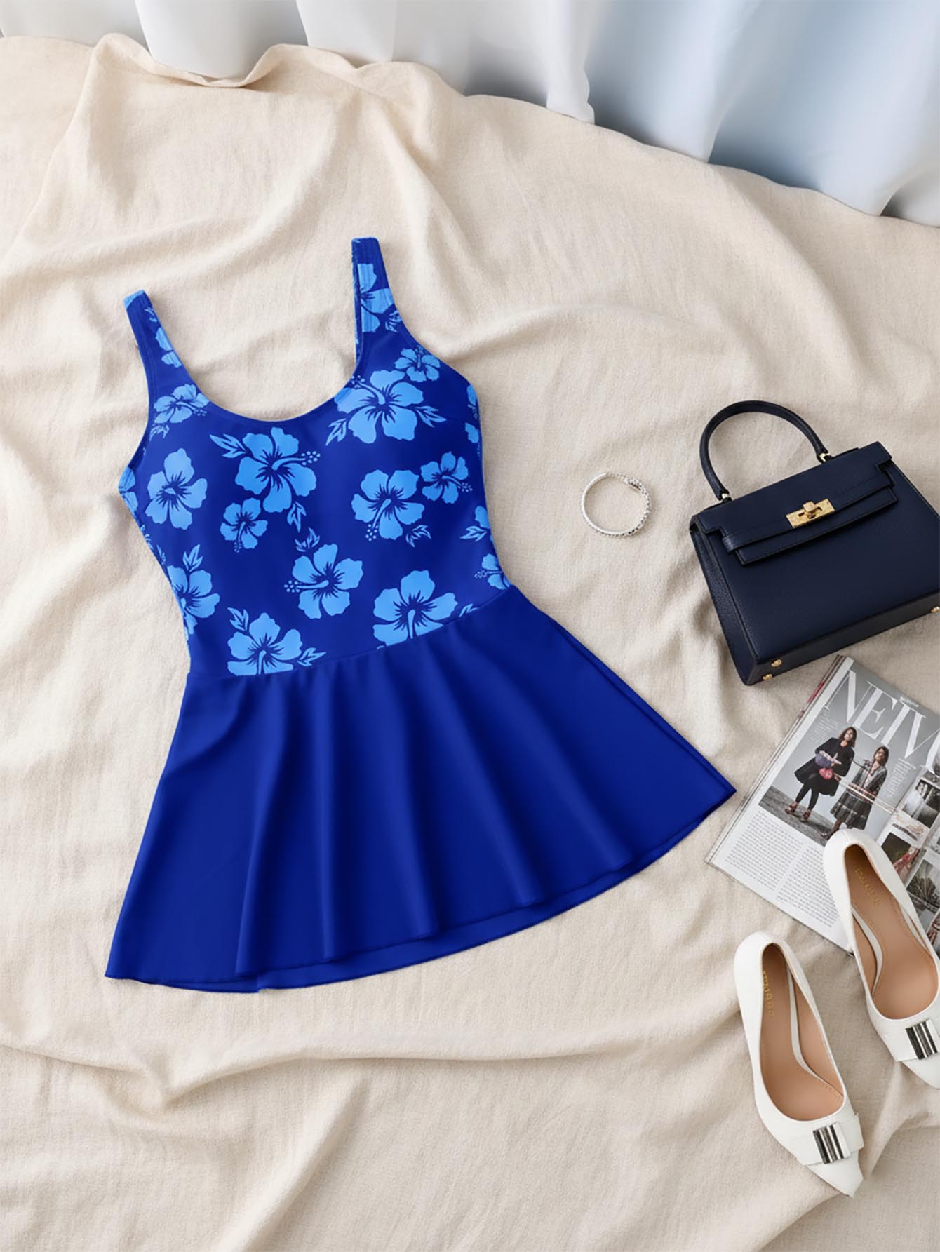 Swim Lushoire 1pc Hibiscus Floral Print U-Neck Slimming Skirt-Style One-Piece Swimsuit Summer