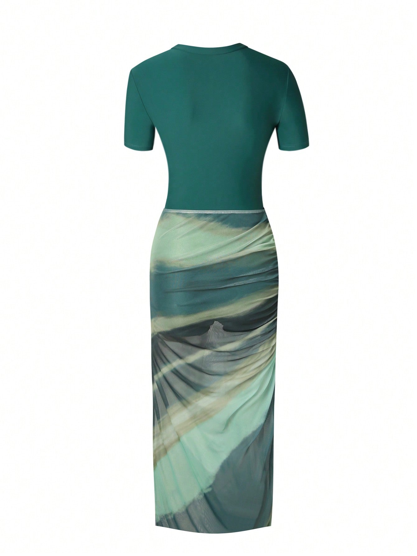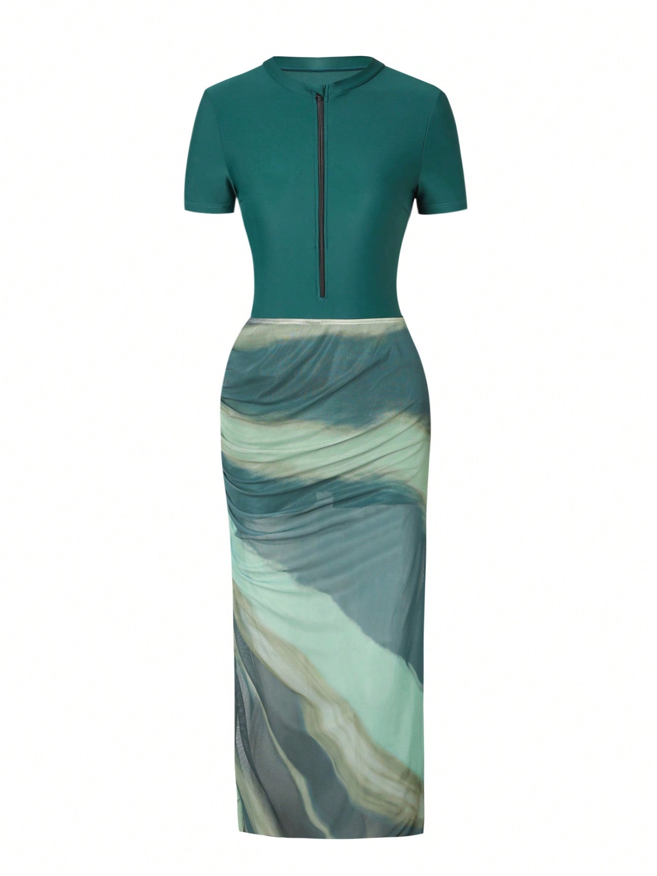 Swim Shayni New Women Summer Beach Vacation Outfits Set: Round Neck Zipper Design Short Sleeve Shorts One-Piece Swimsuit + Long Printed Mesh Cover Up Skirt