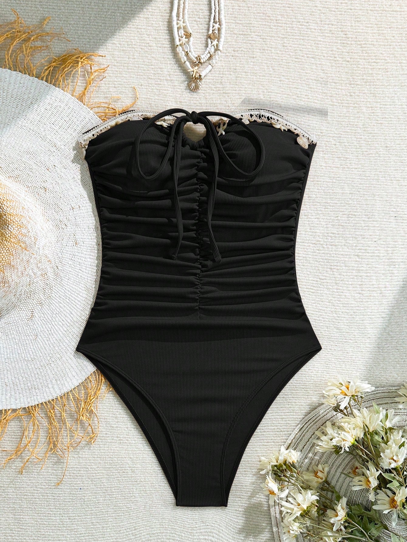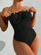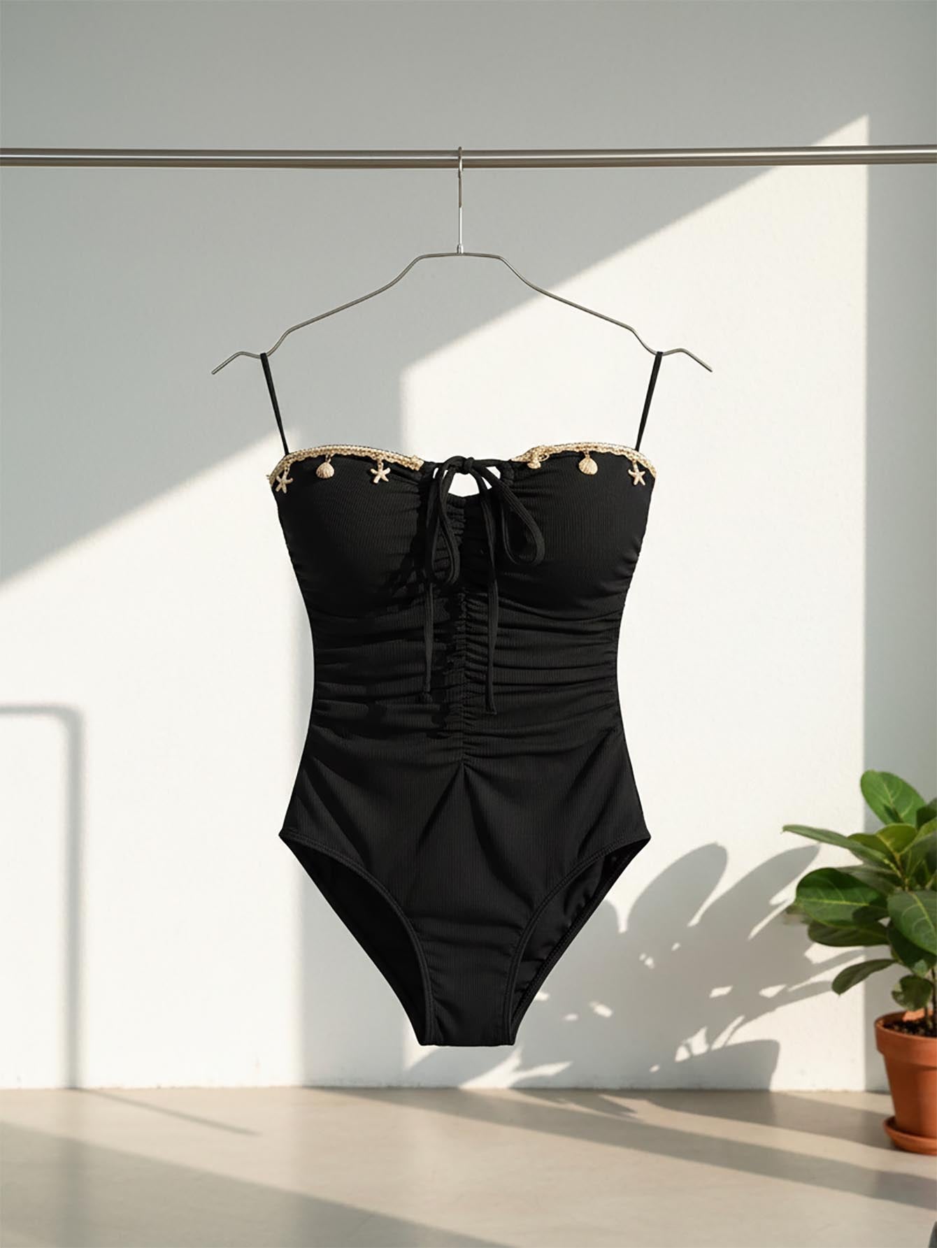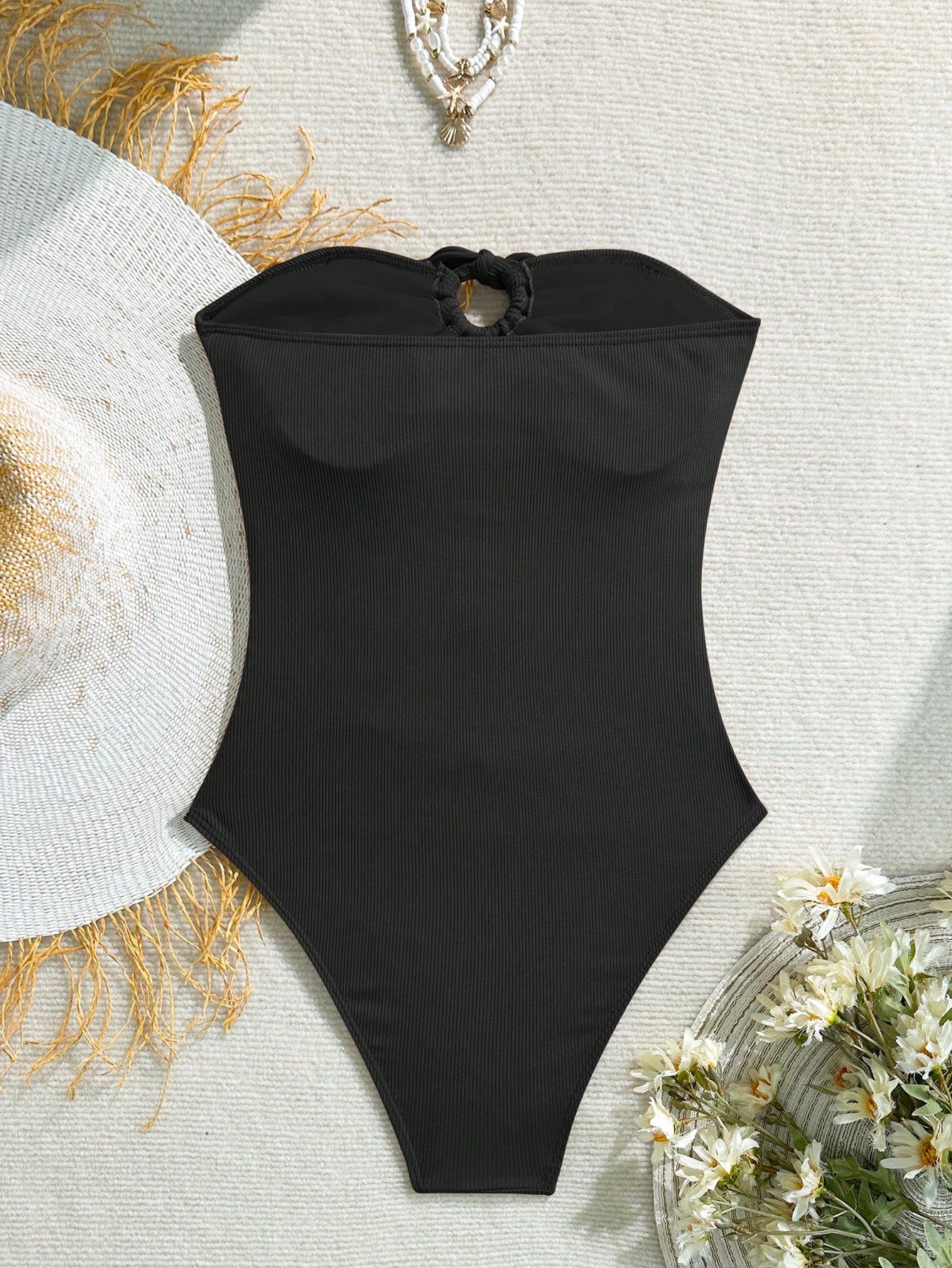 Swim Vcay 1pc Elegant Strapless Brown Ribbed Seashell Webbing Decor Monokini Swimsuit For Women For
