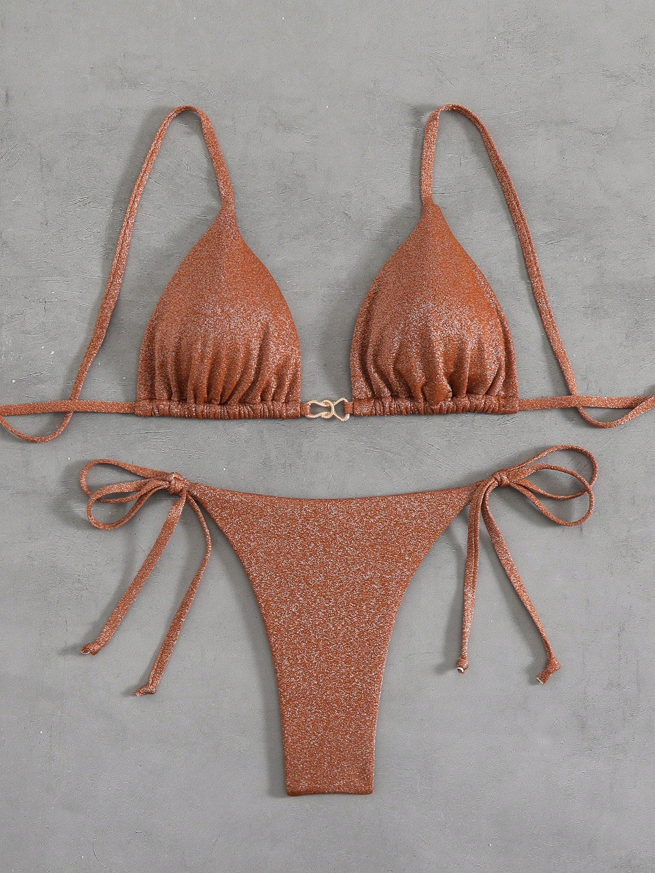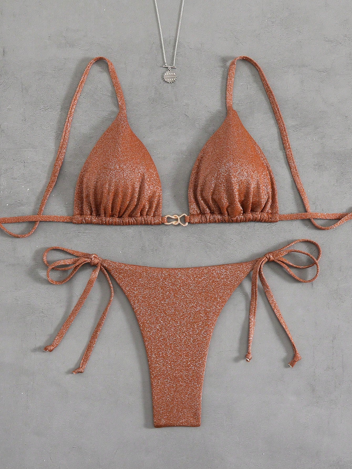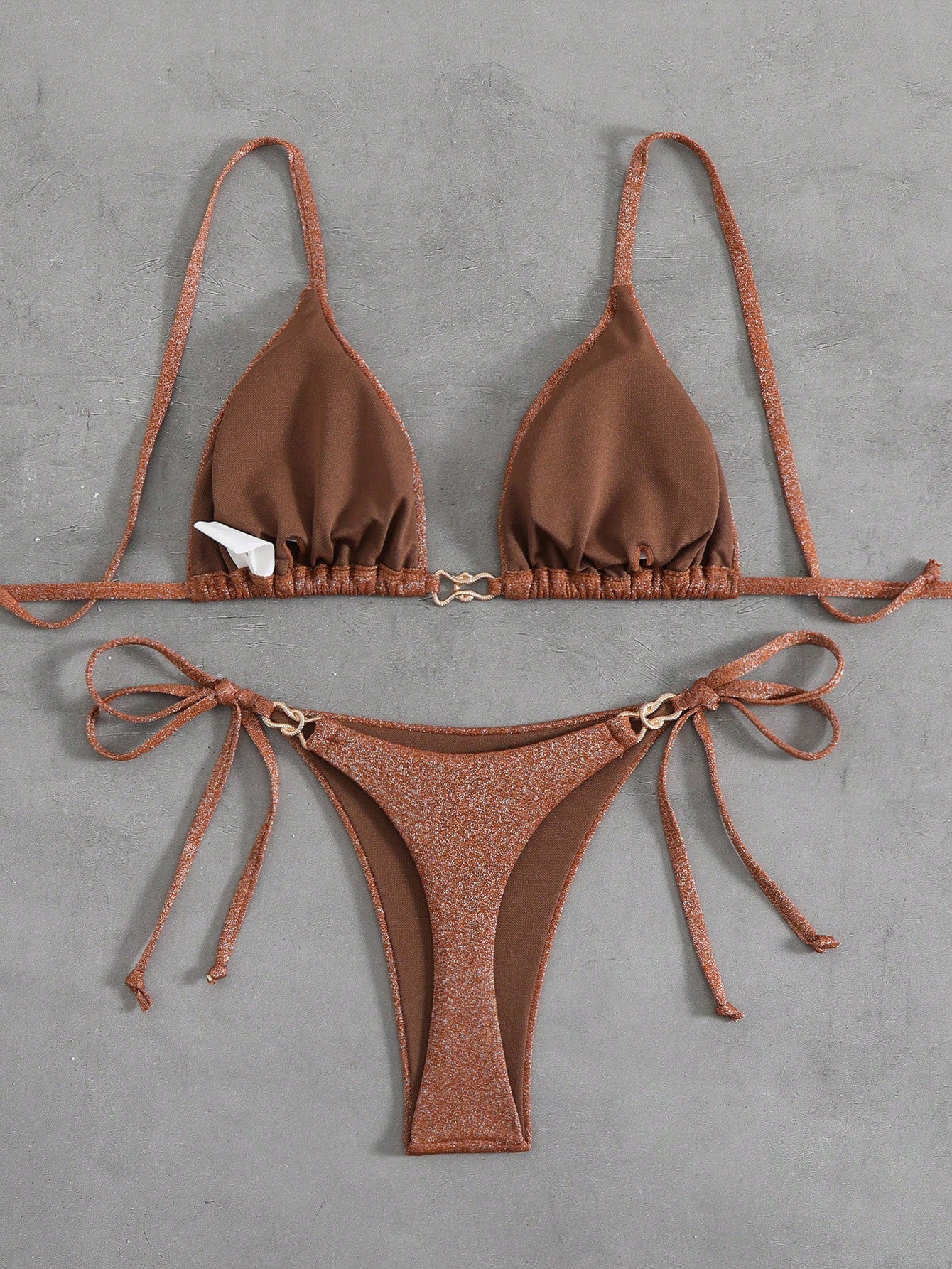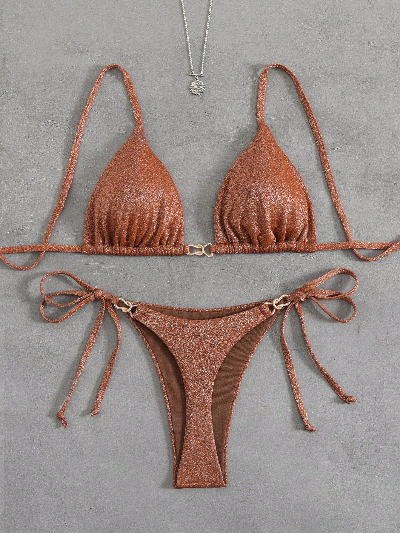 Swim Vcay Women's Solid Color Metallic Fabric Spaghetti Strap Jewelry Decor Bikini Set