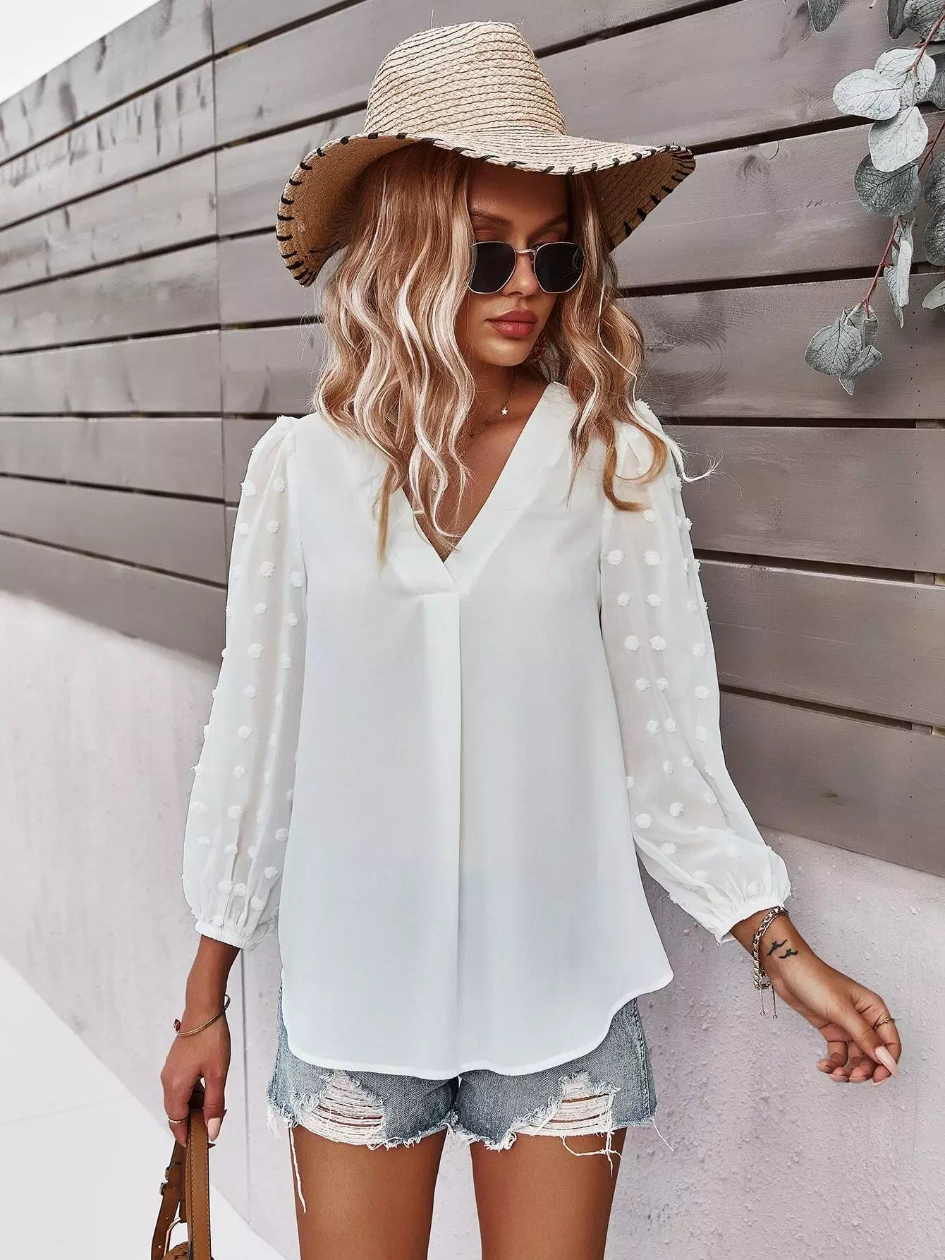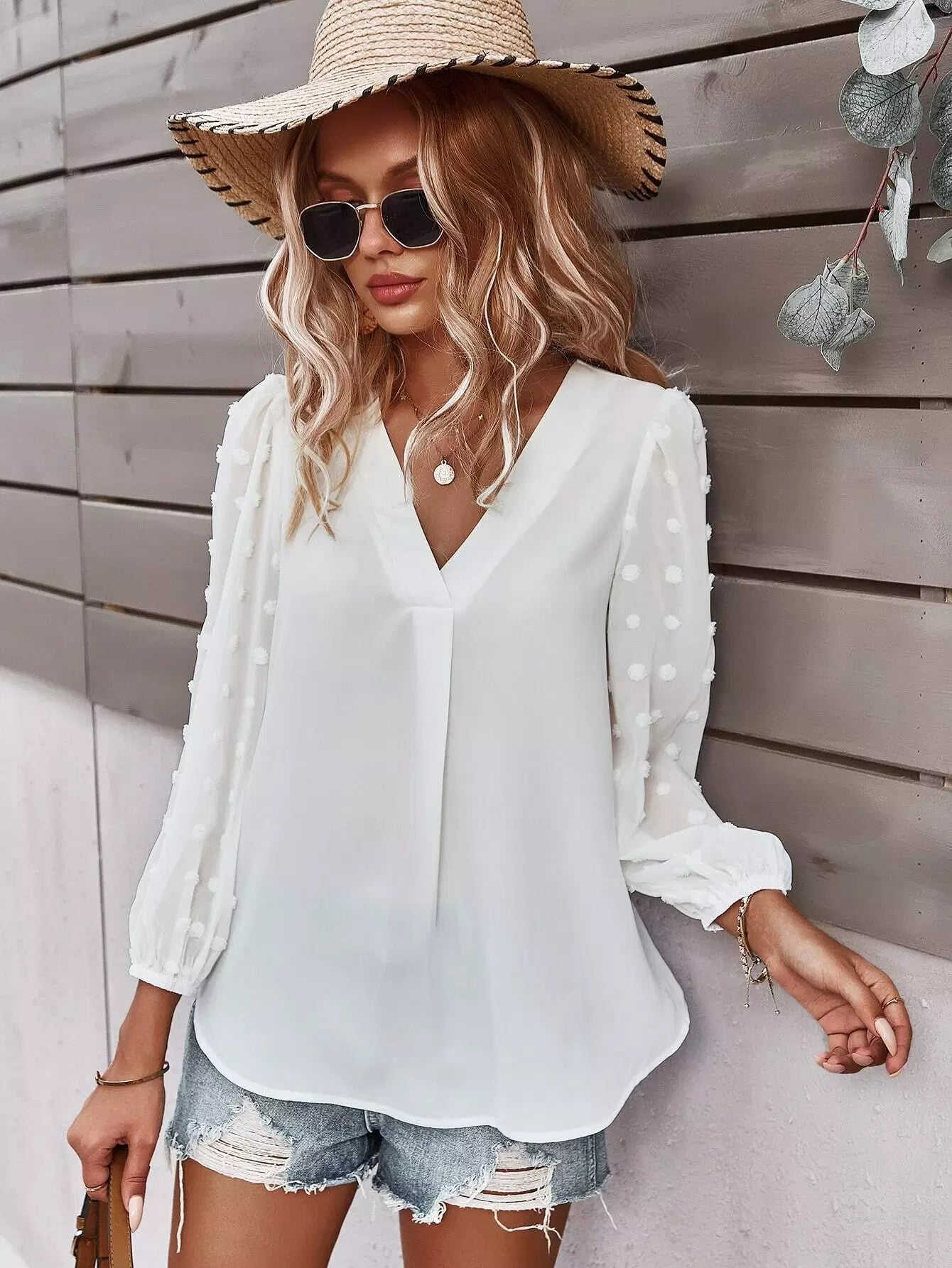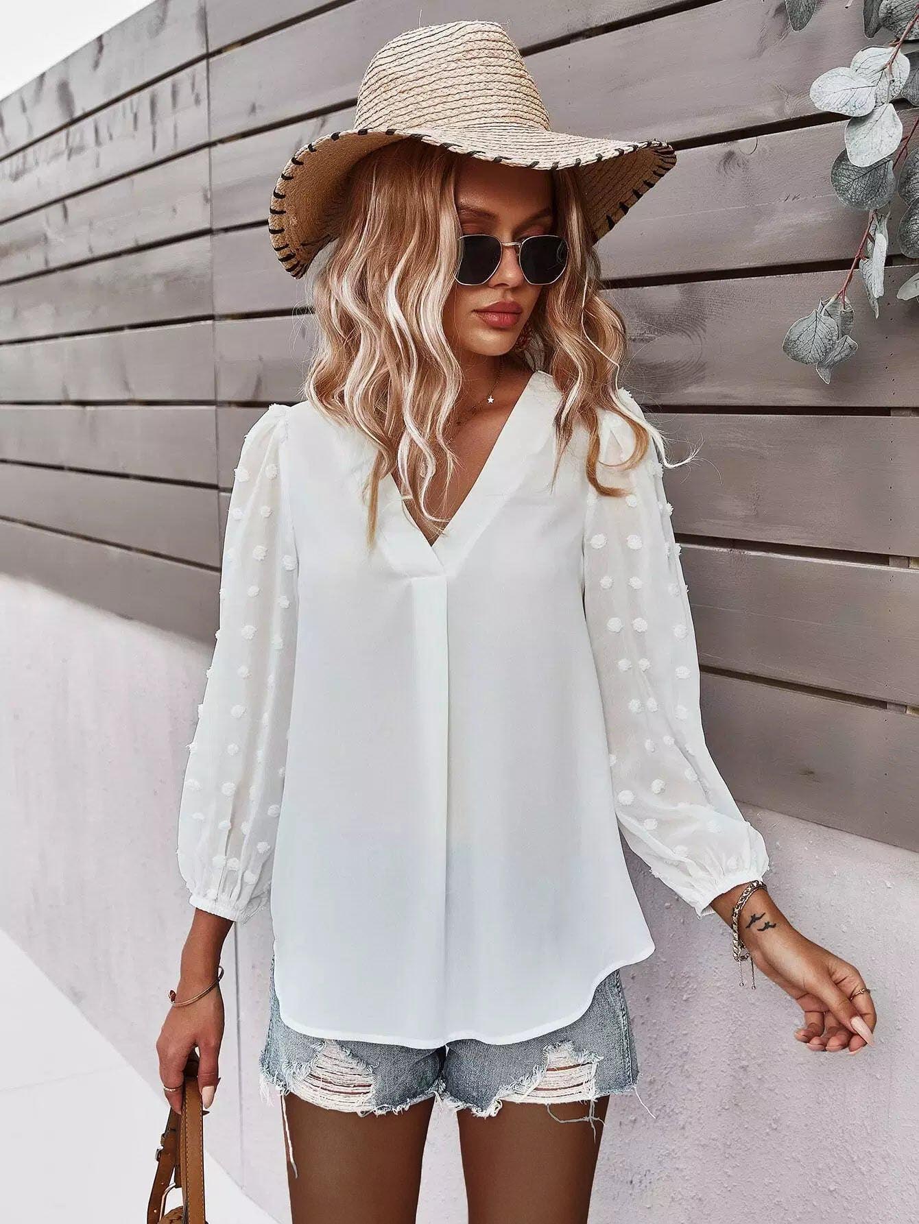 Swiss Dot Curved Hem Blouse