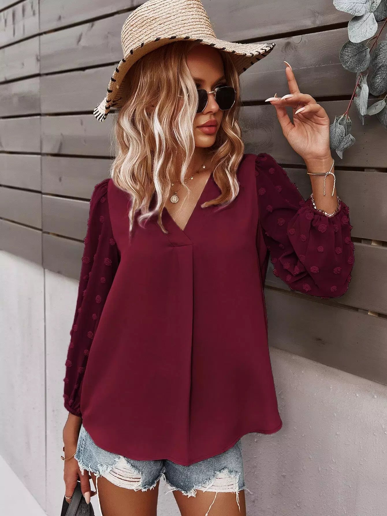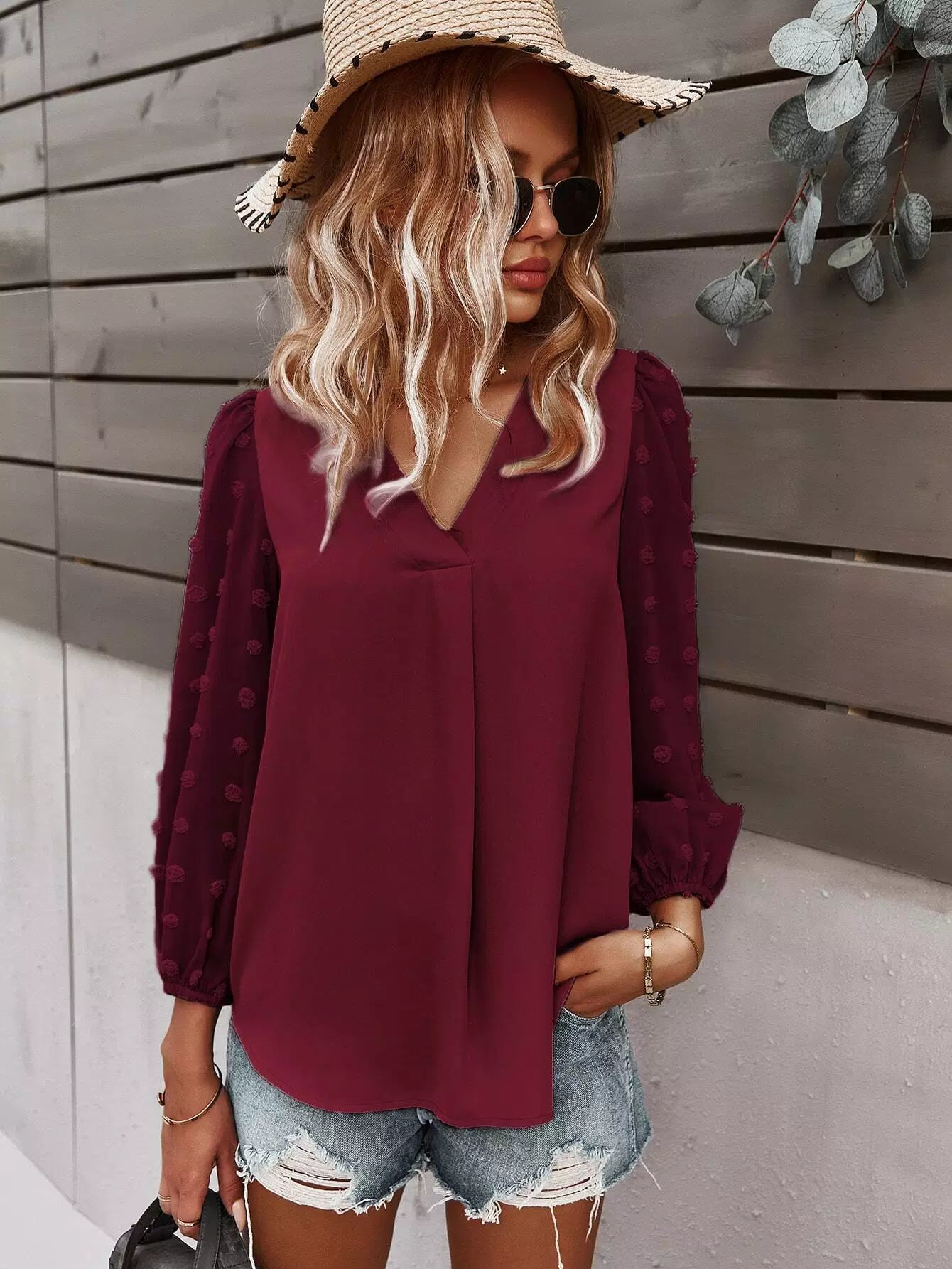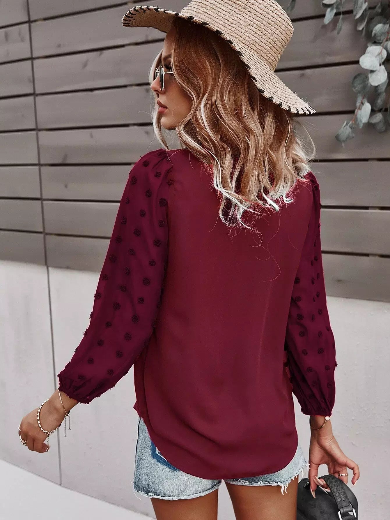 Swiss Dot Curved Hem Blouse