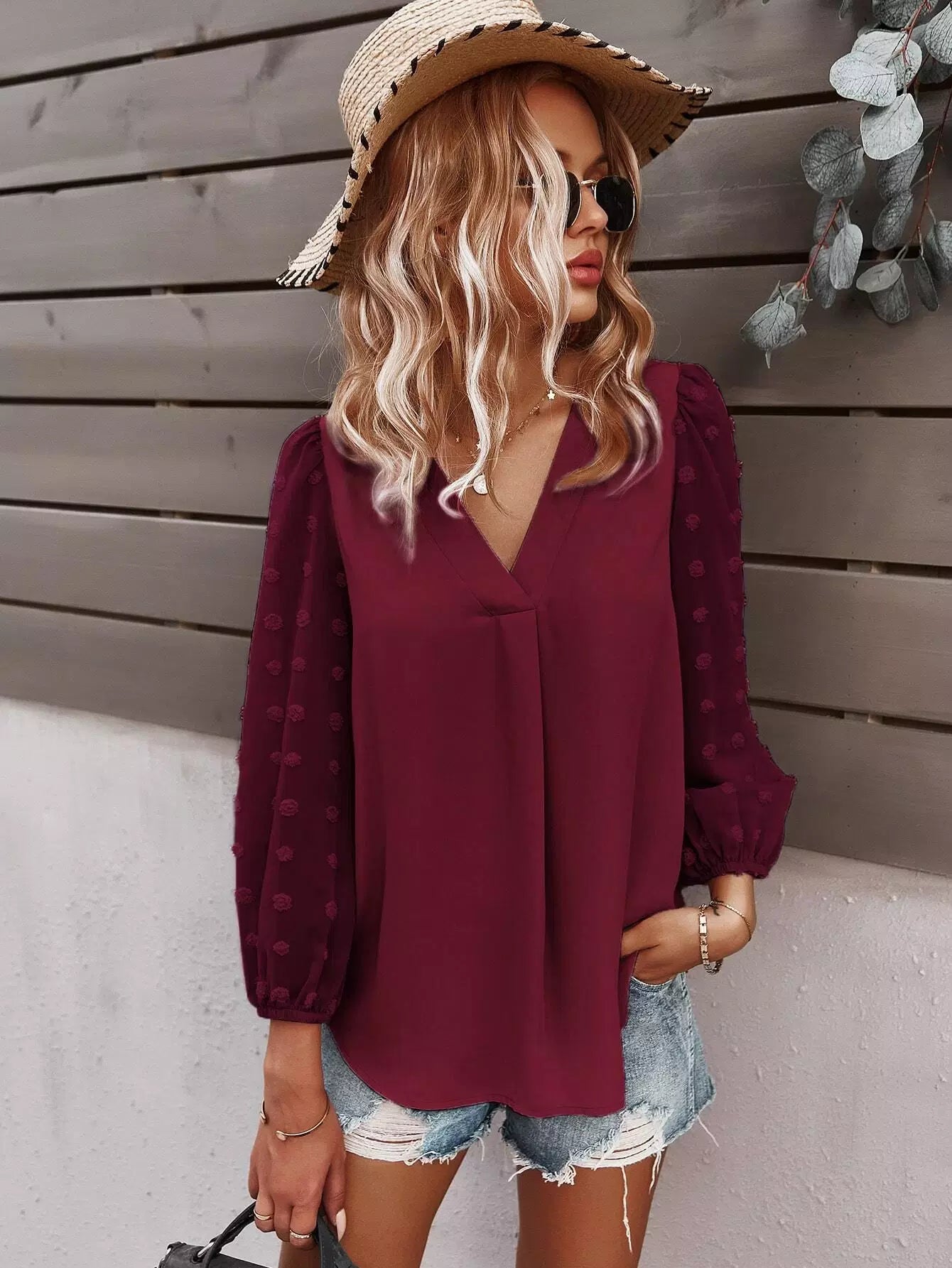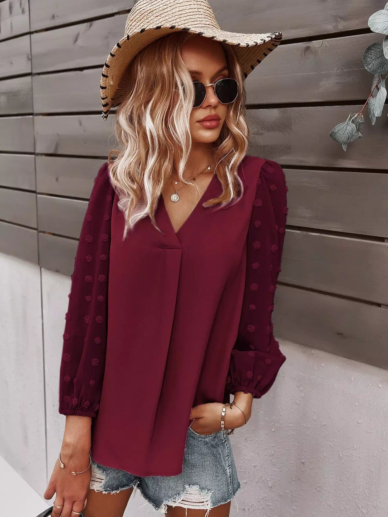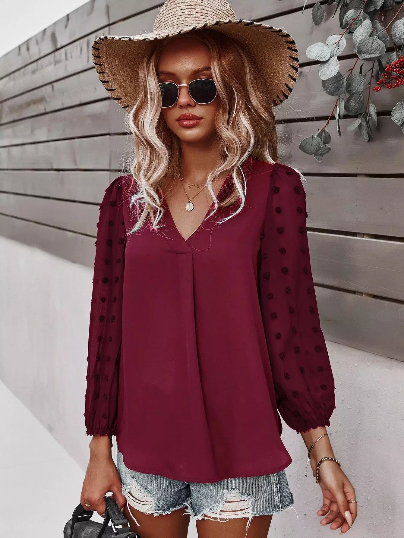Swiss Dot Curved Hem Blouse