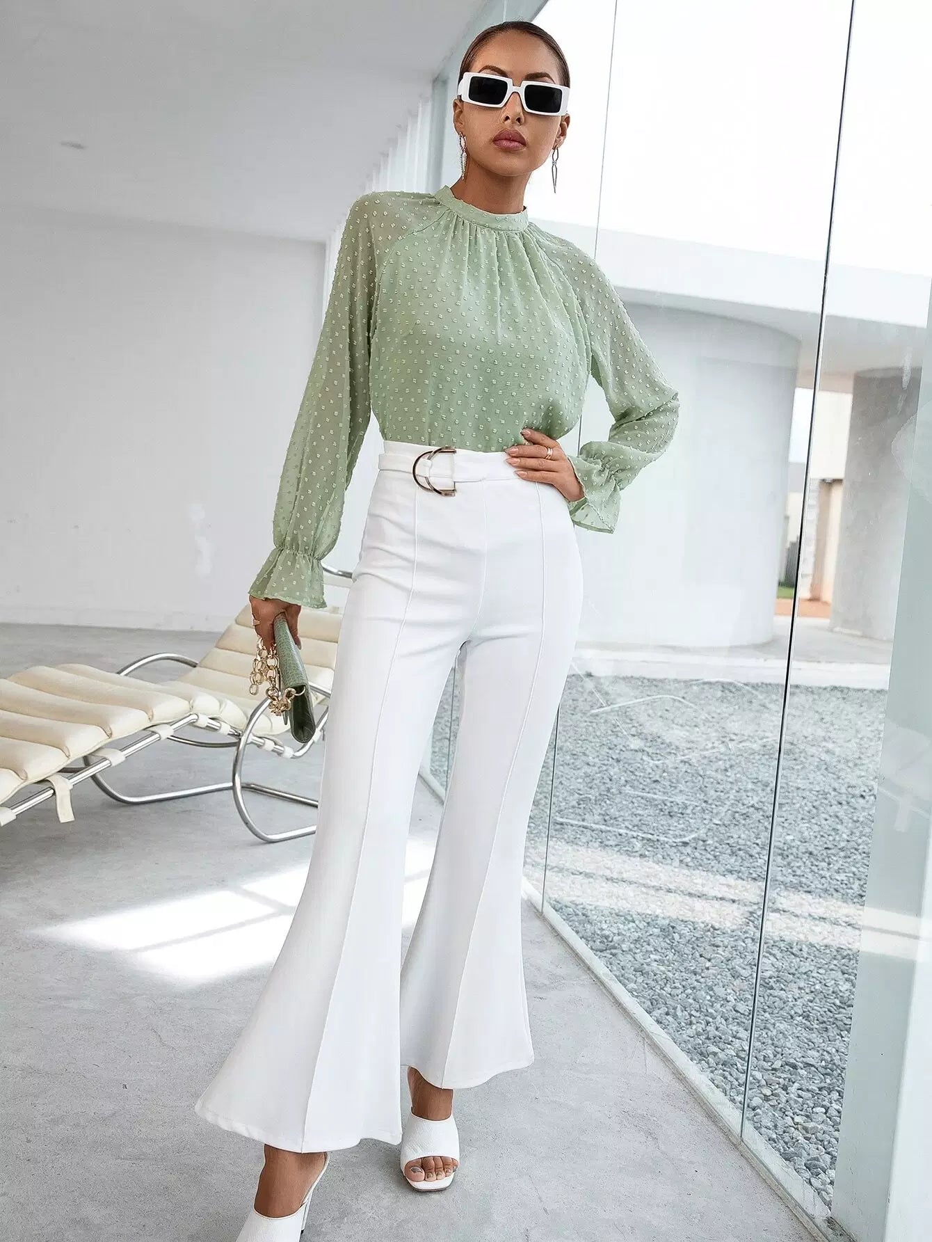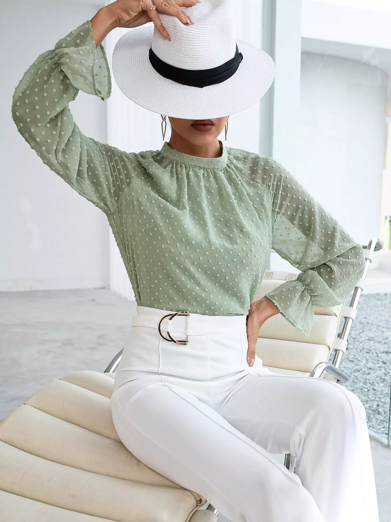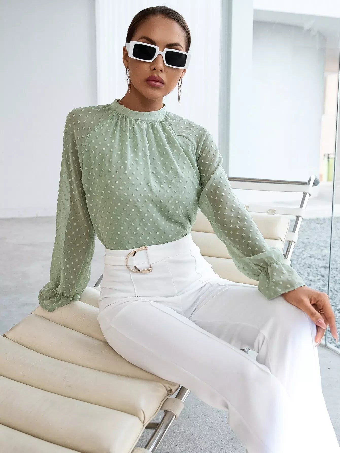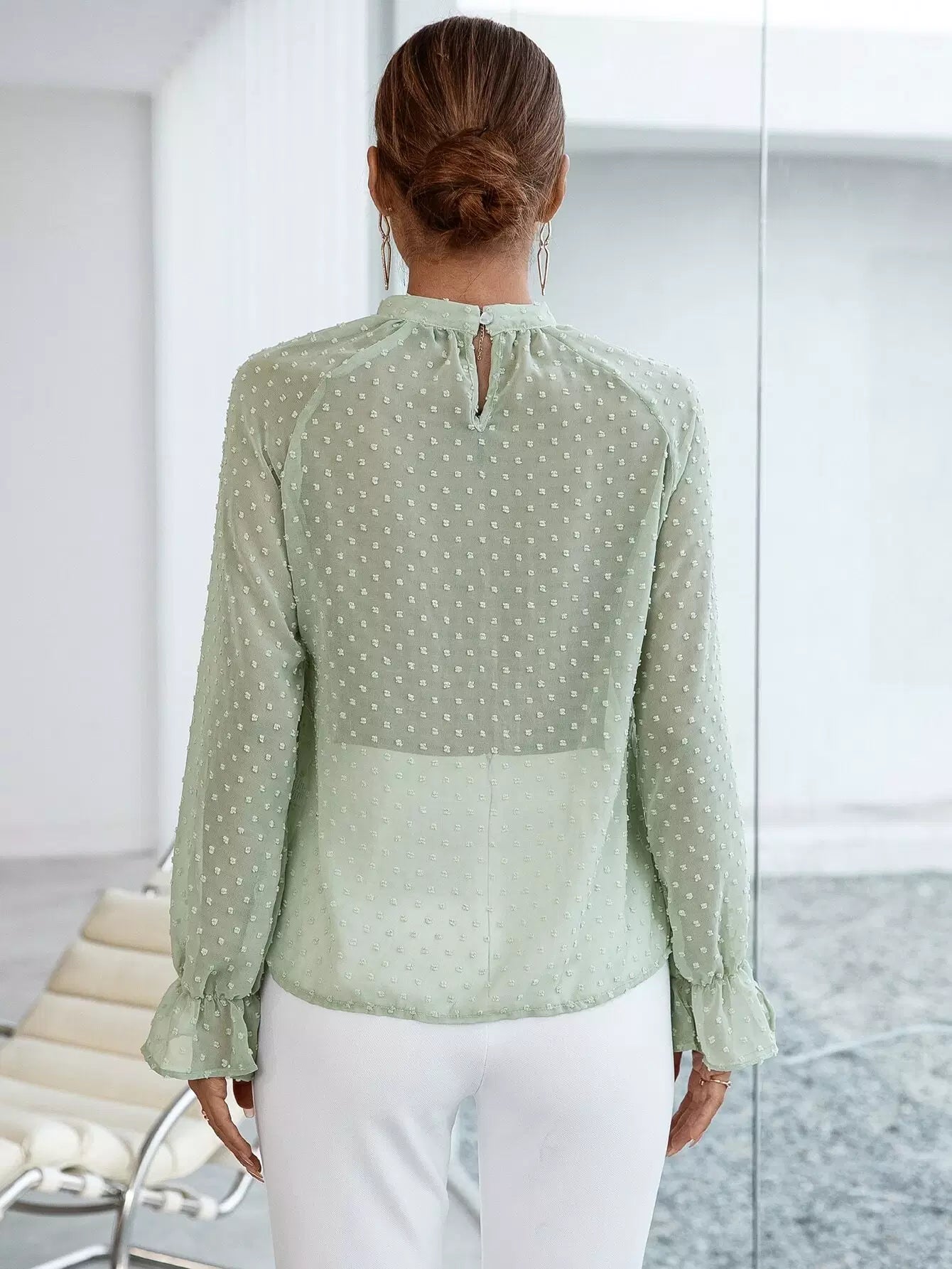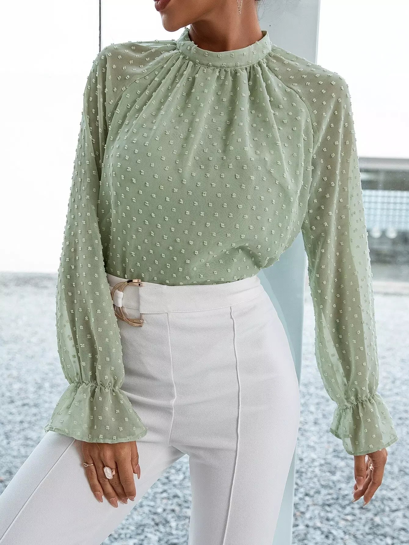 Swiss Dot Mock Neck Flounce Sleeve Blouse