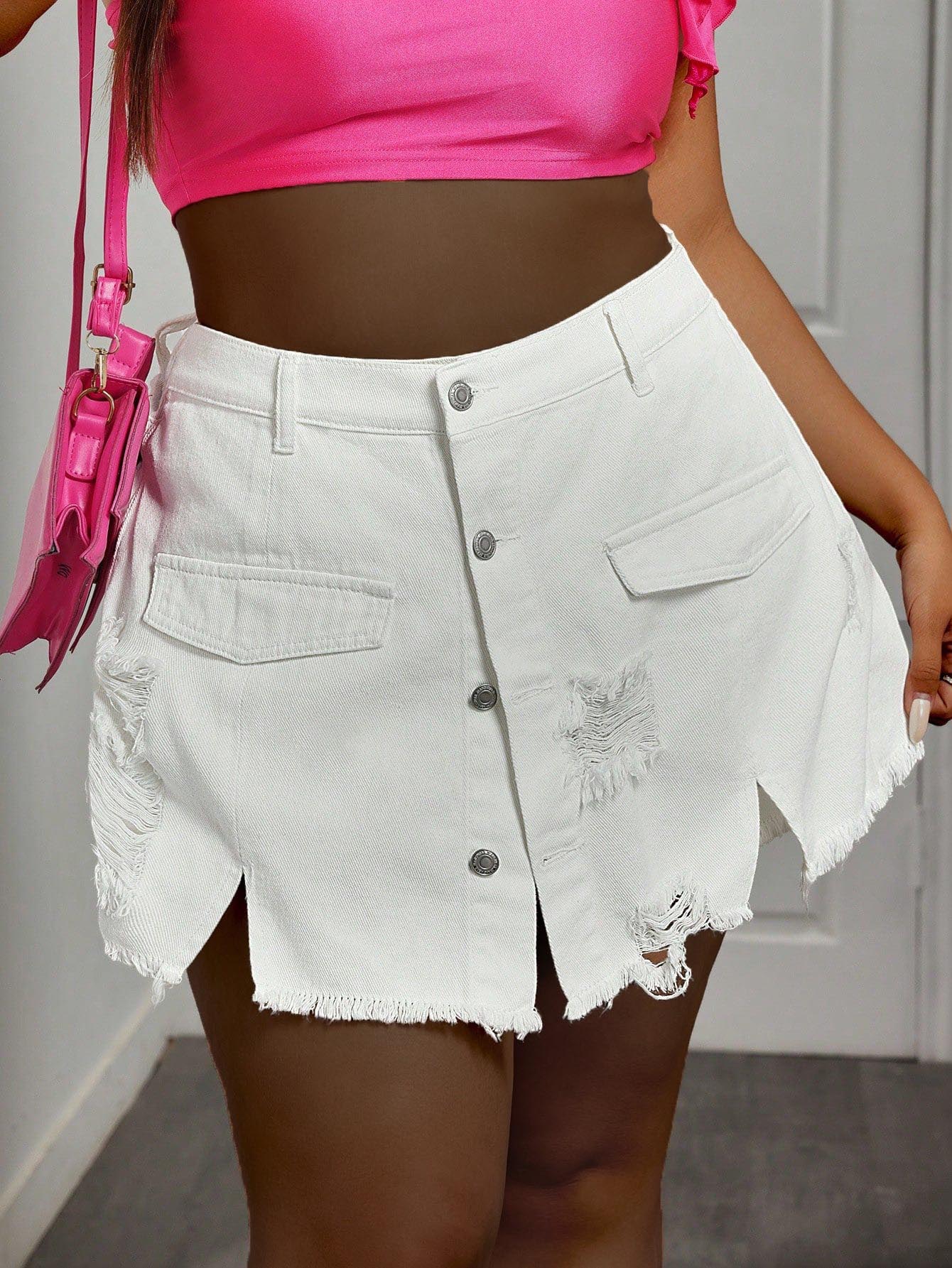 SXY Plus Size Women Ripped Single-Breasted Casual Versatile Jean Skirt