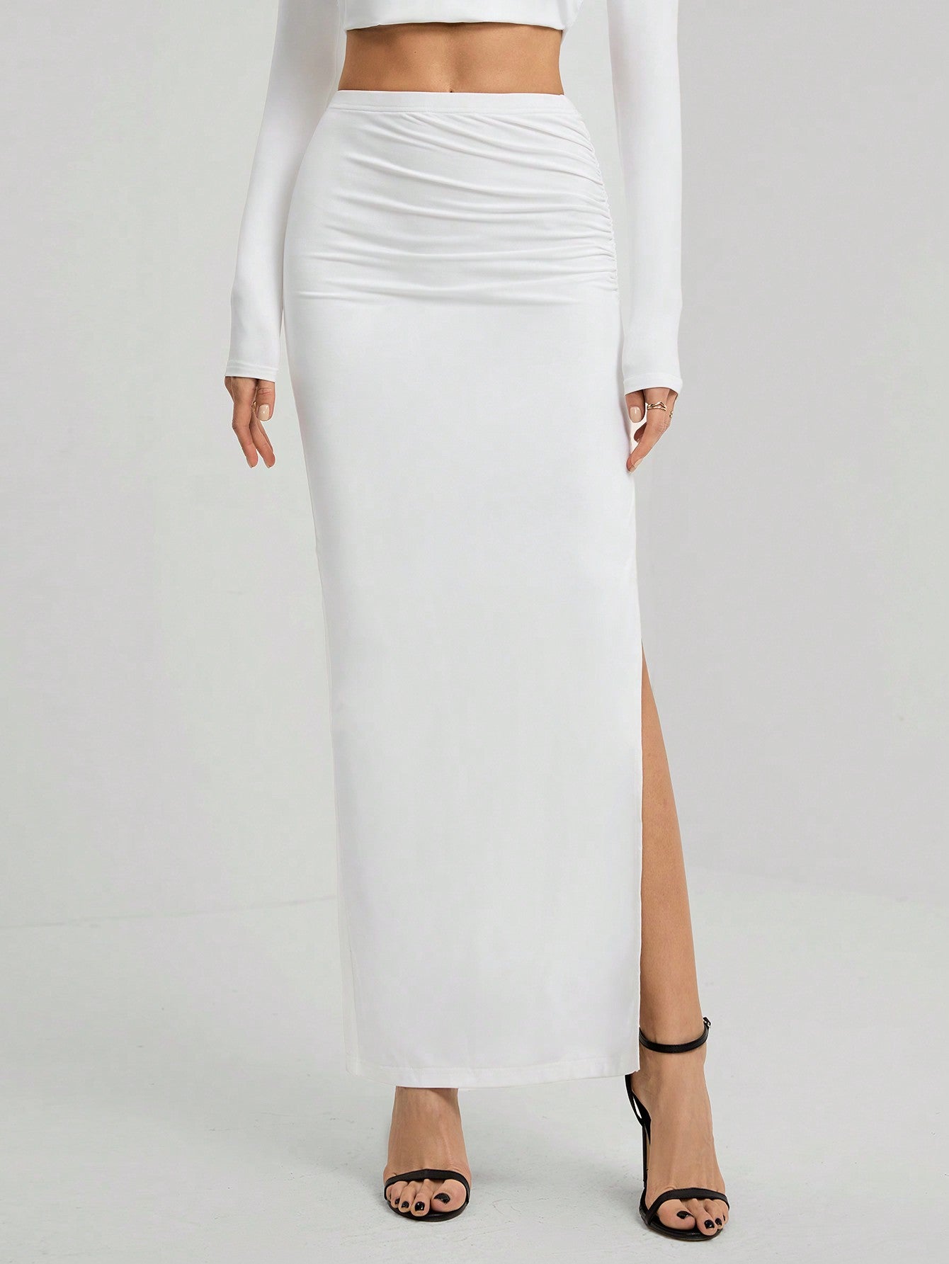 Tall White High Slit Side Gathered Women's Slim Long Skirt