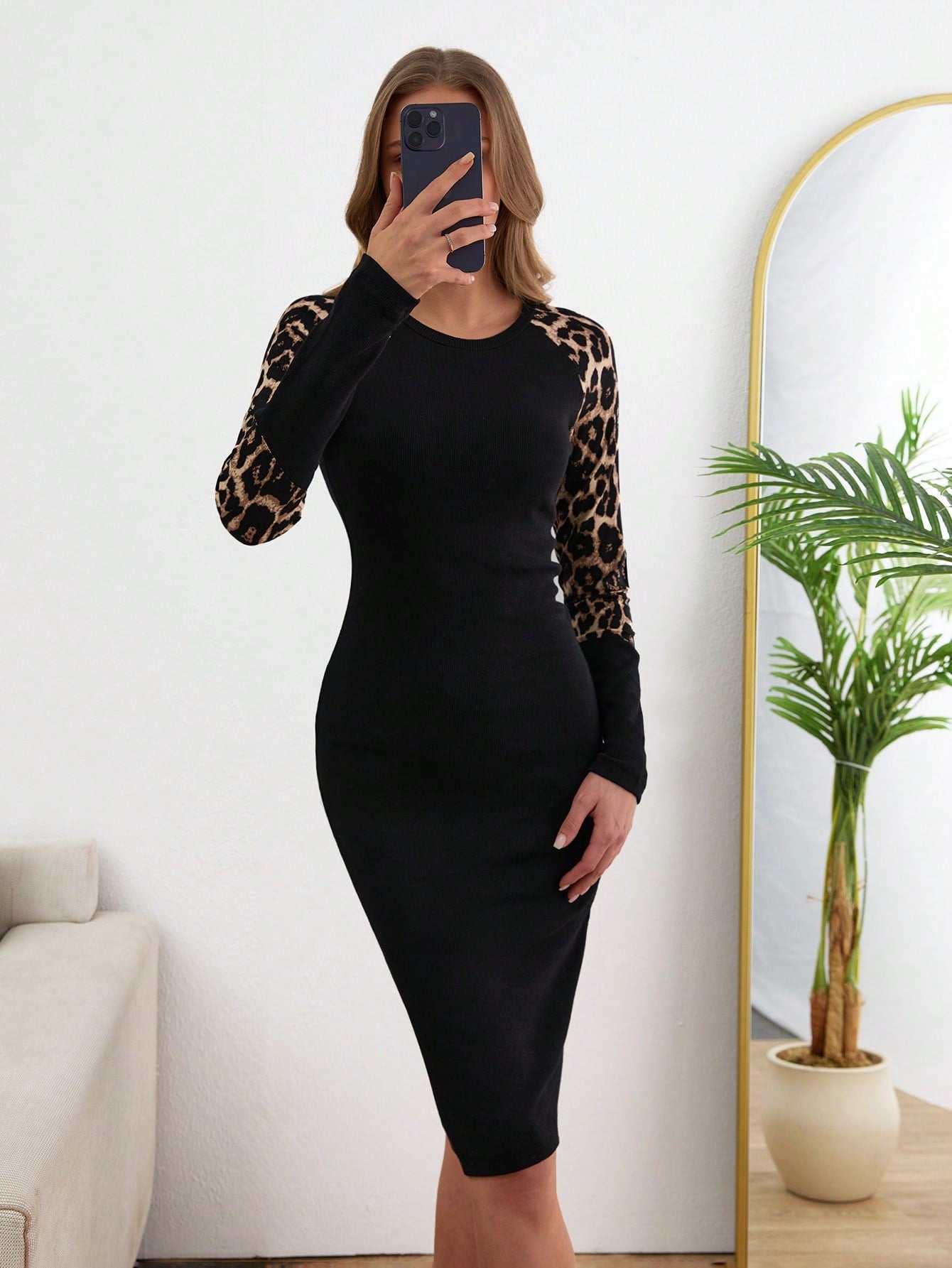 Tall Women Leopard Printed Midi Black Dress