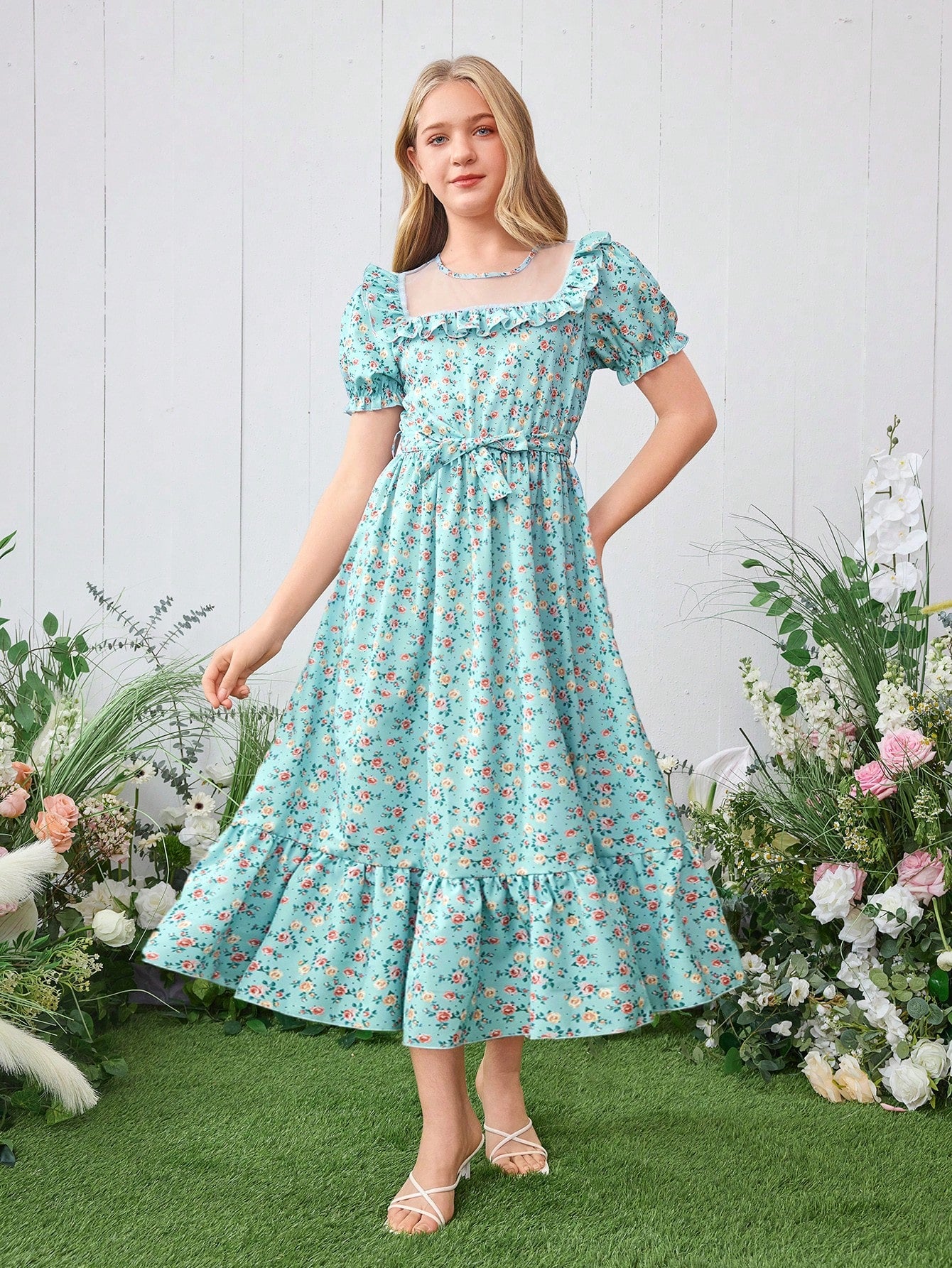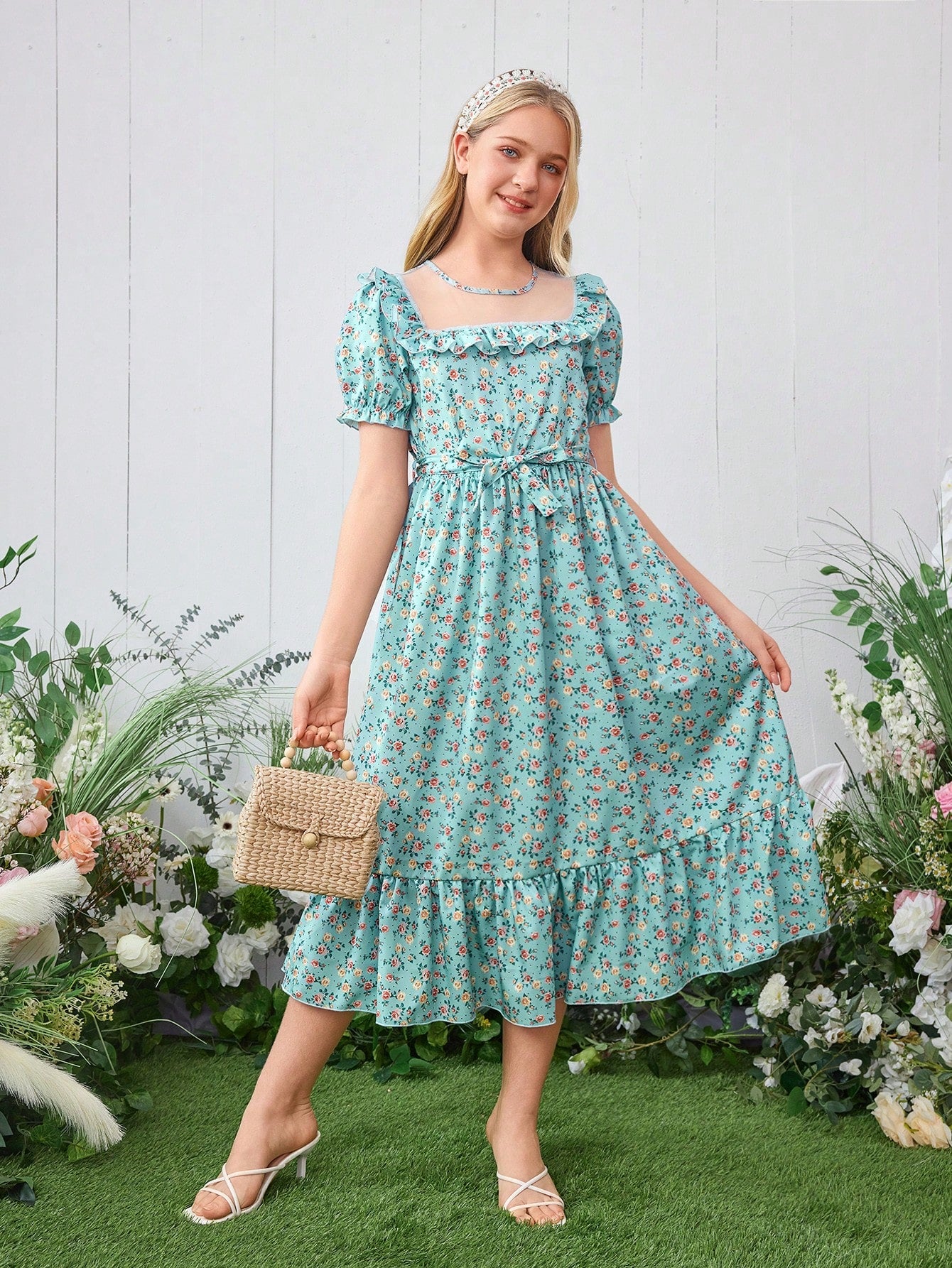 Teen Girl's Ditsy Floral Short Sleeve Mesh Yoke Vintage Style Mini Dress