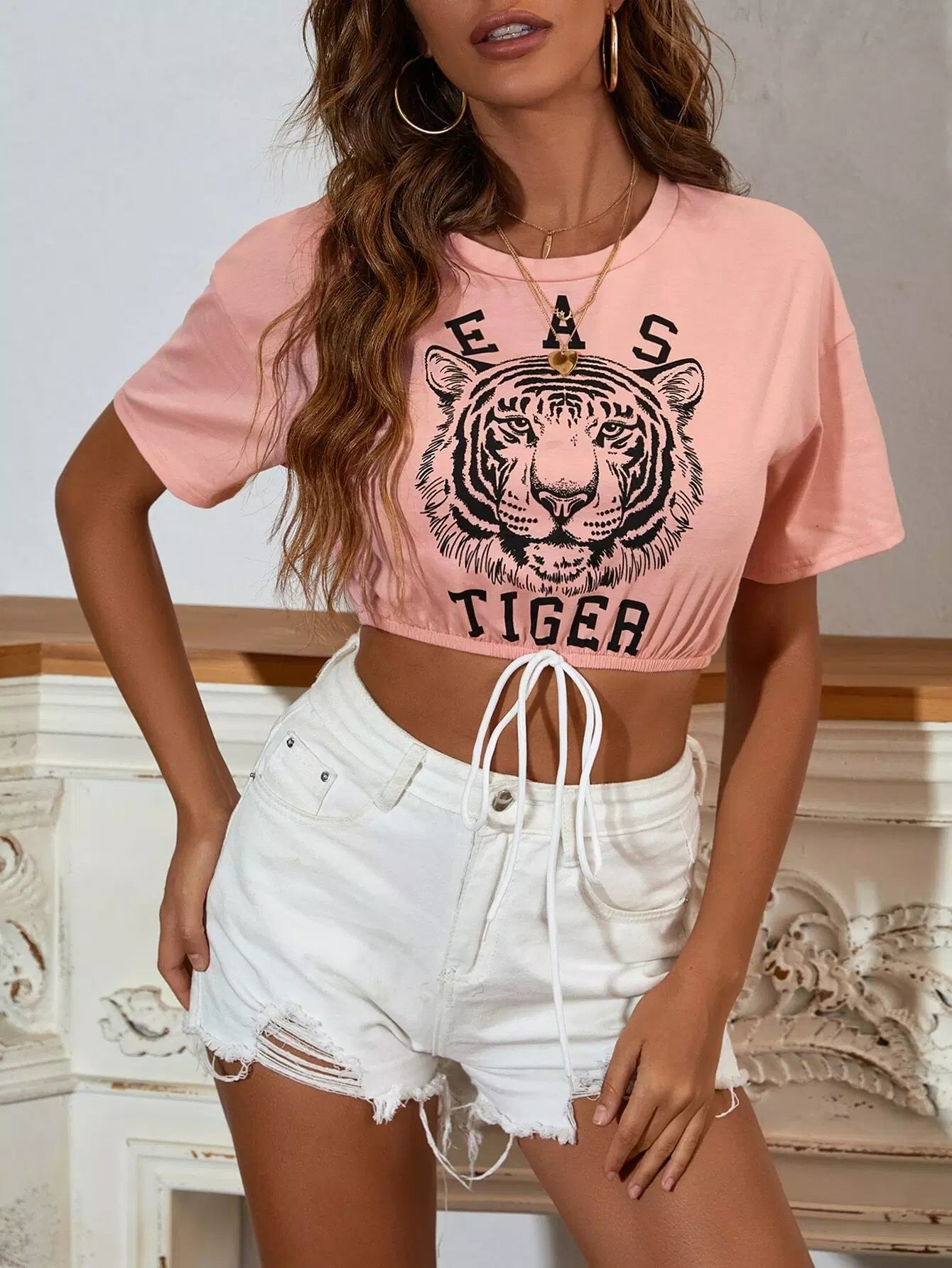 Tiger & Letter Graphic Knot Hem Crop Tee