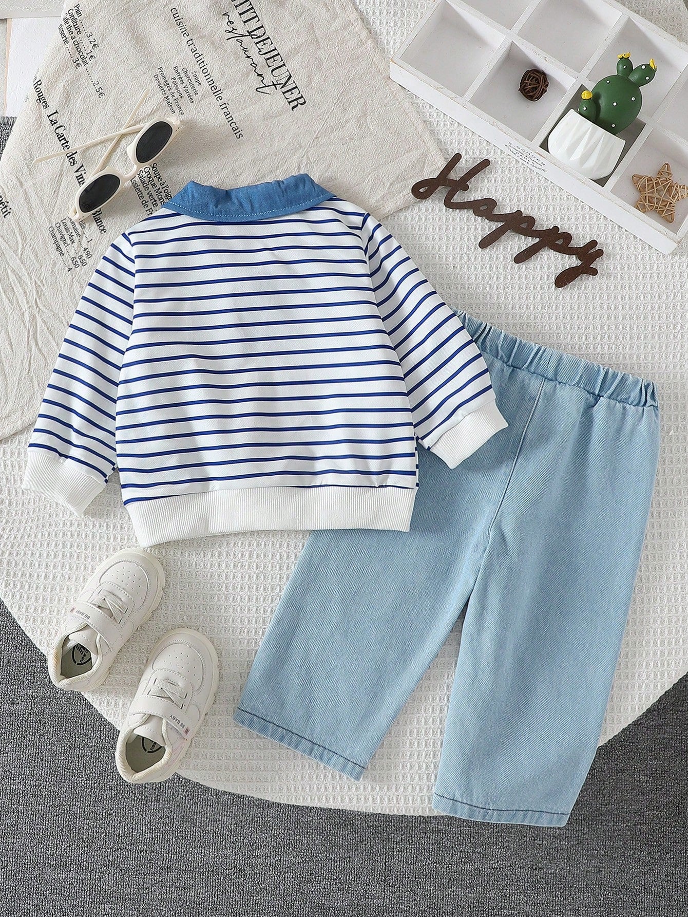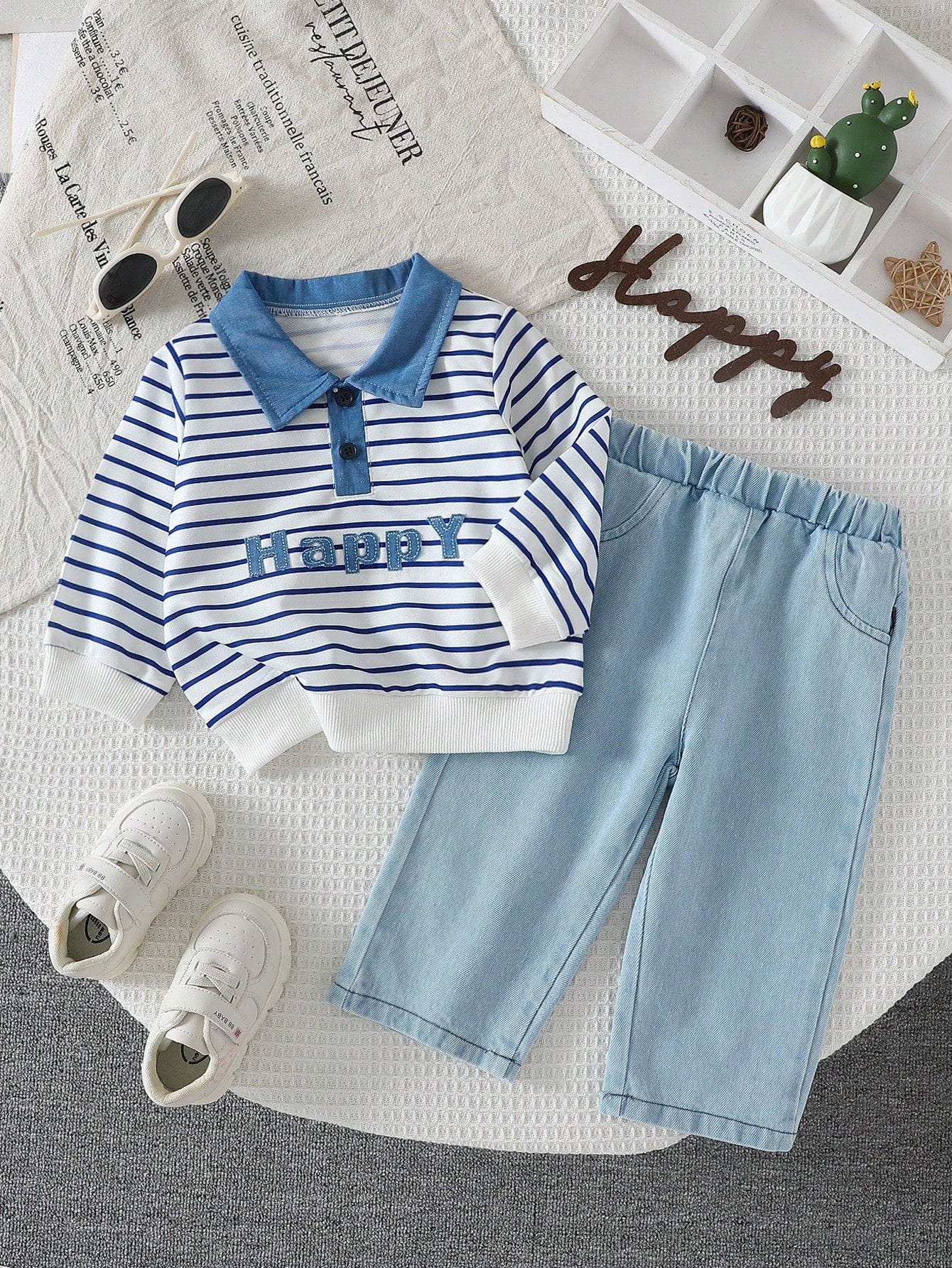 Toddler Boys Fashionable Casual Striped Denim Collar Hoodie And Jeans Set For Autumn