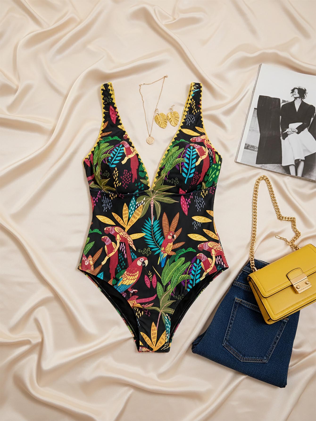 Travachic Plus Size Women's Holiday Casual Tropical Palm Tree & Parrot Print Sexy Backless Bowknot One-Piece