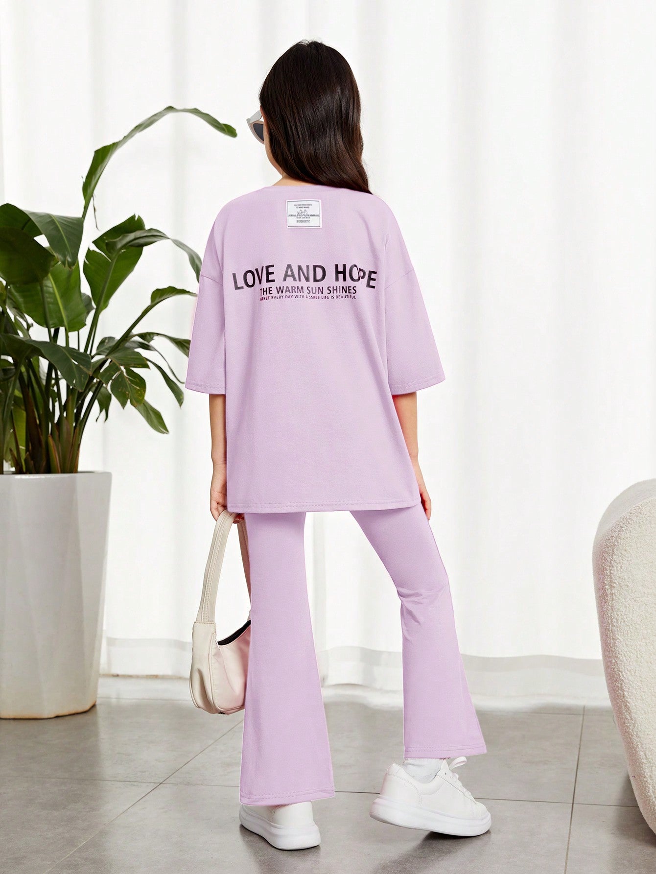 Tween Girl Slogan Graphic Drop Shoulder Tee & Flare Leg Pants