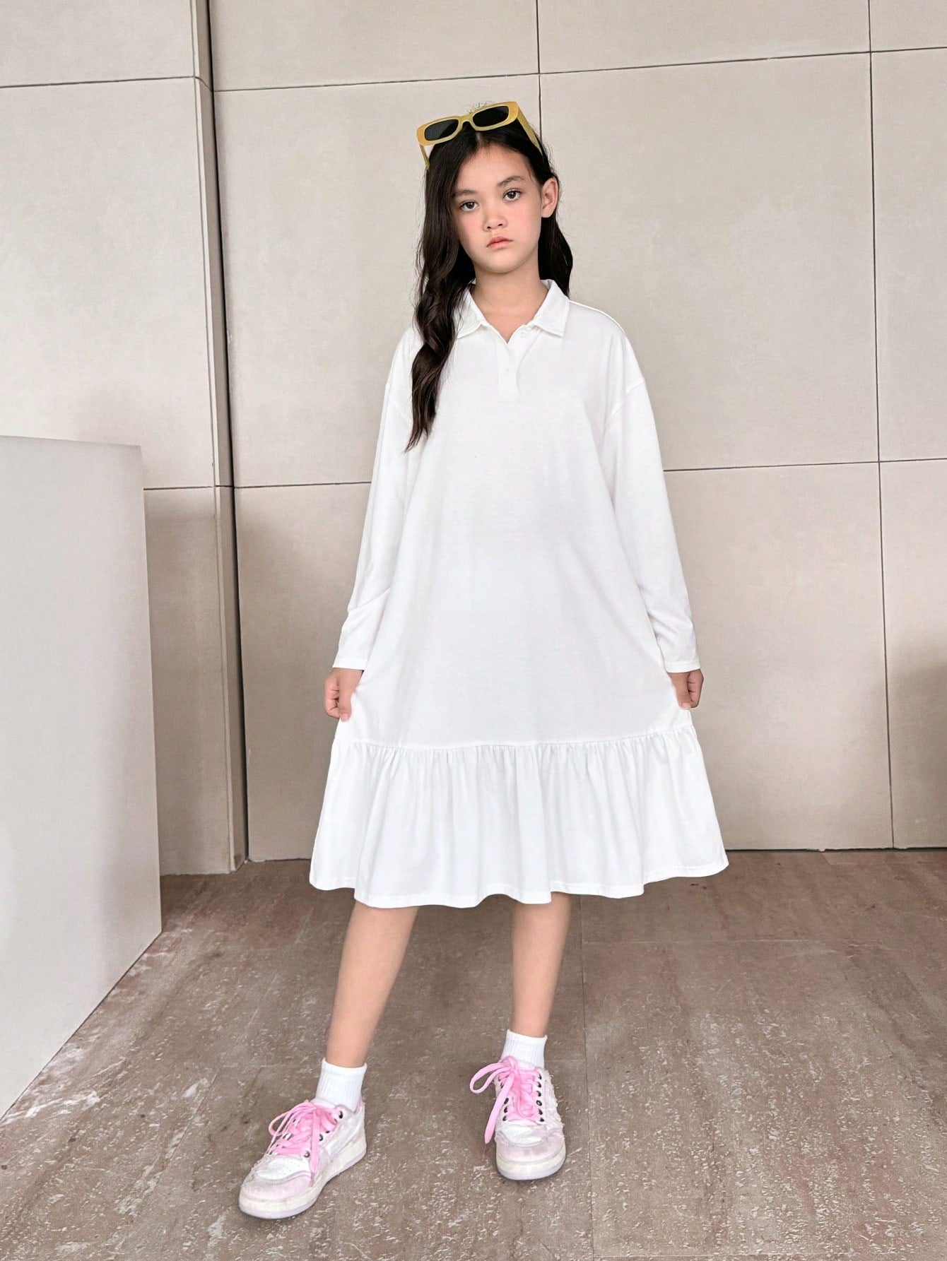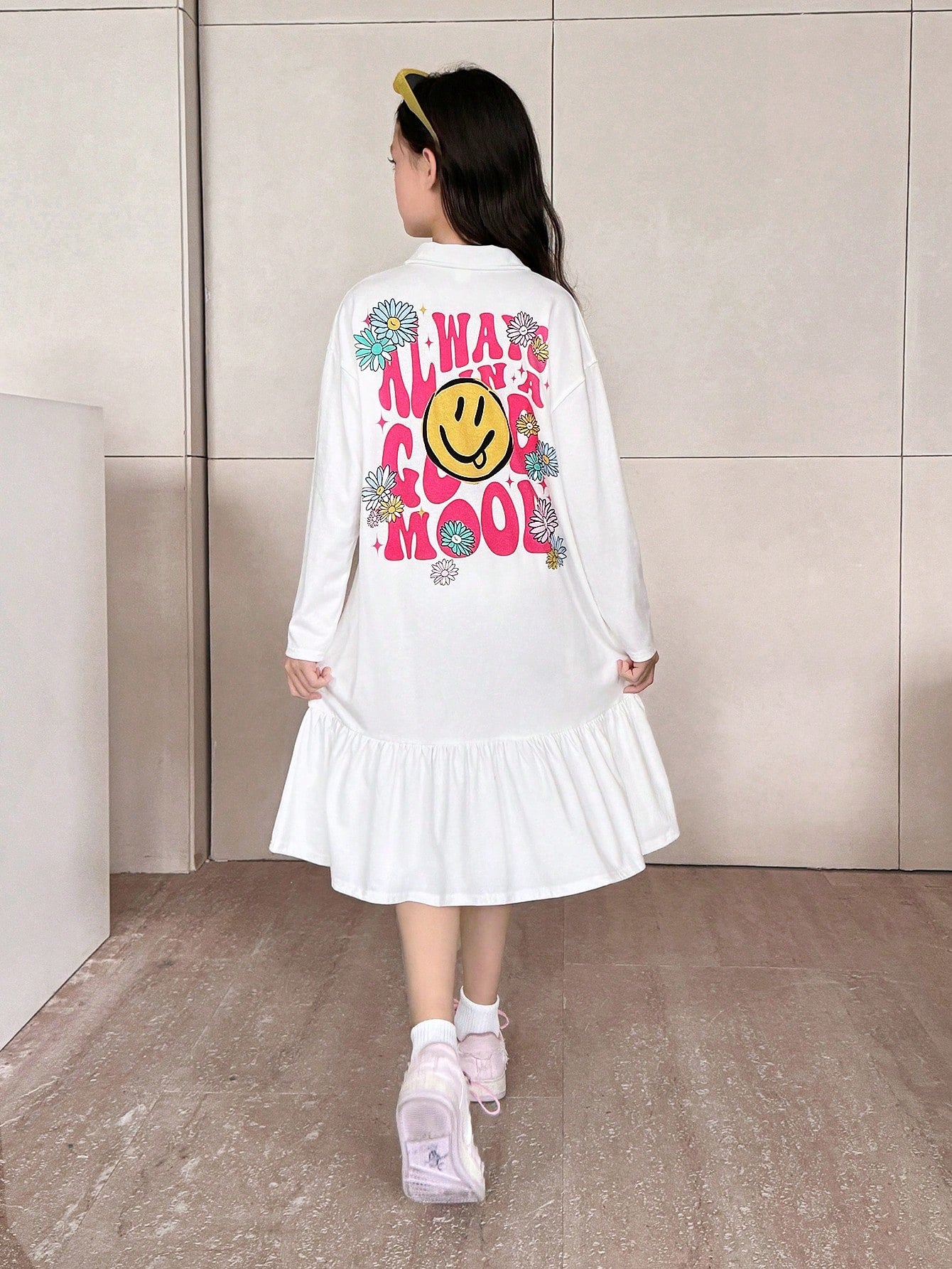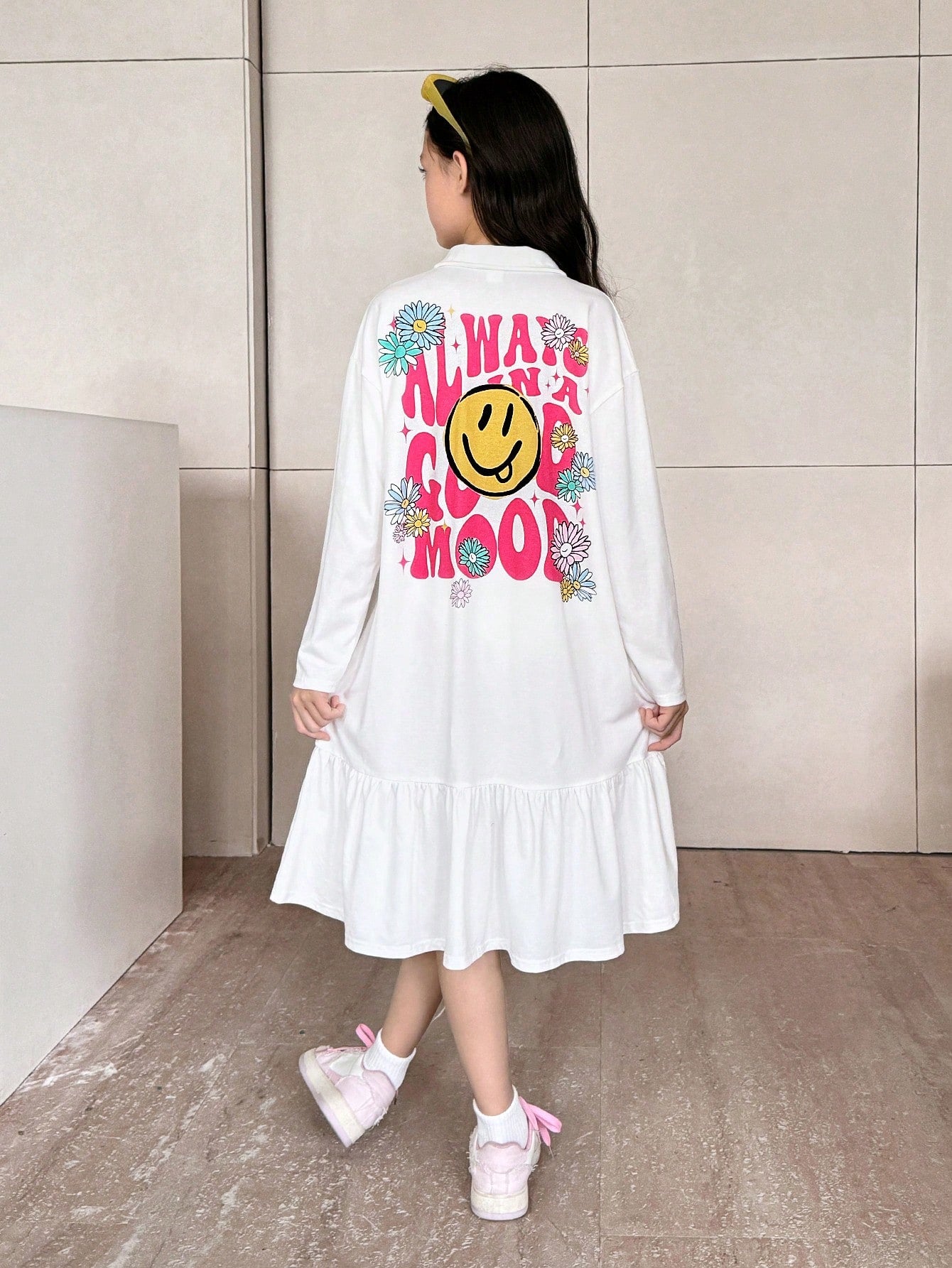 Tween Girls Casual Cotton Pique Fabric Back Smiling Face Graphic Print Collared Patchwork Hem Polo Dress,