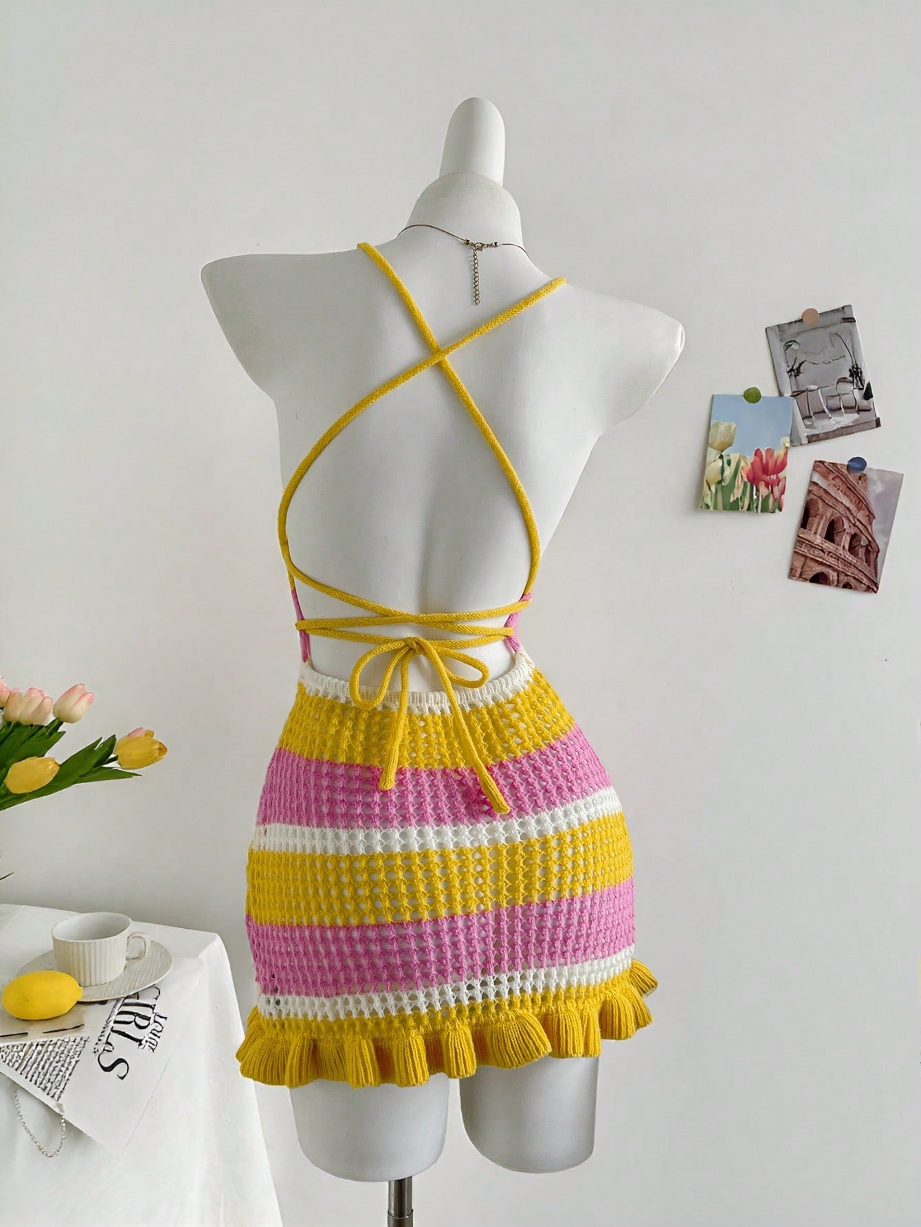 Unity Women's Sweet Multi-Color Contrast Knitted Backless Sleeveless Ruffle Hem Beach Knit Dress