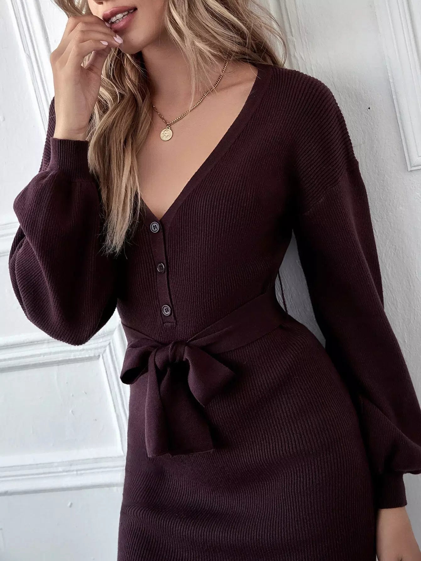 Women - V-neck Button Front Lantern Sleeve Self Belted Sweater Dress