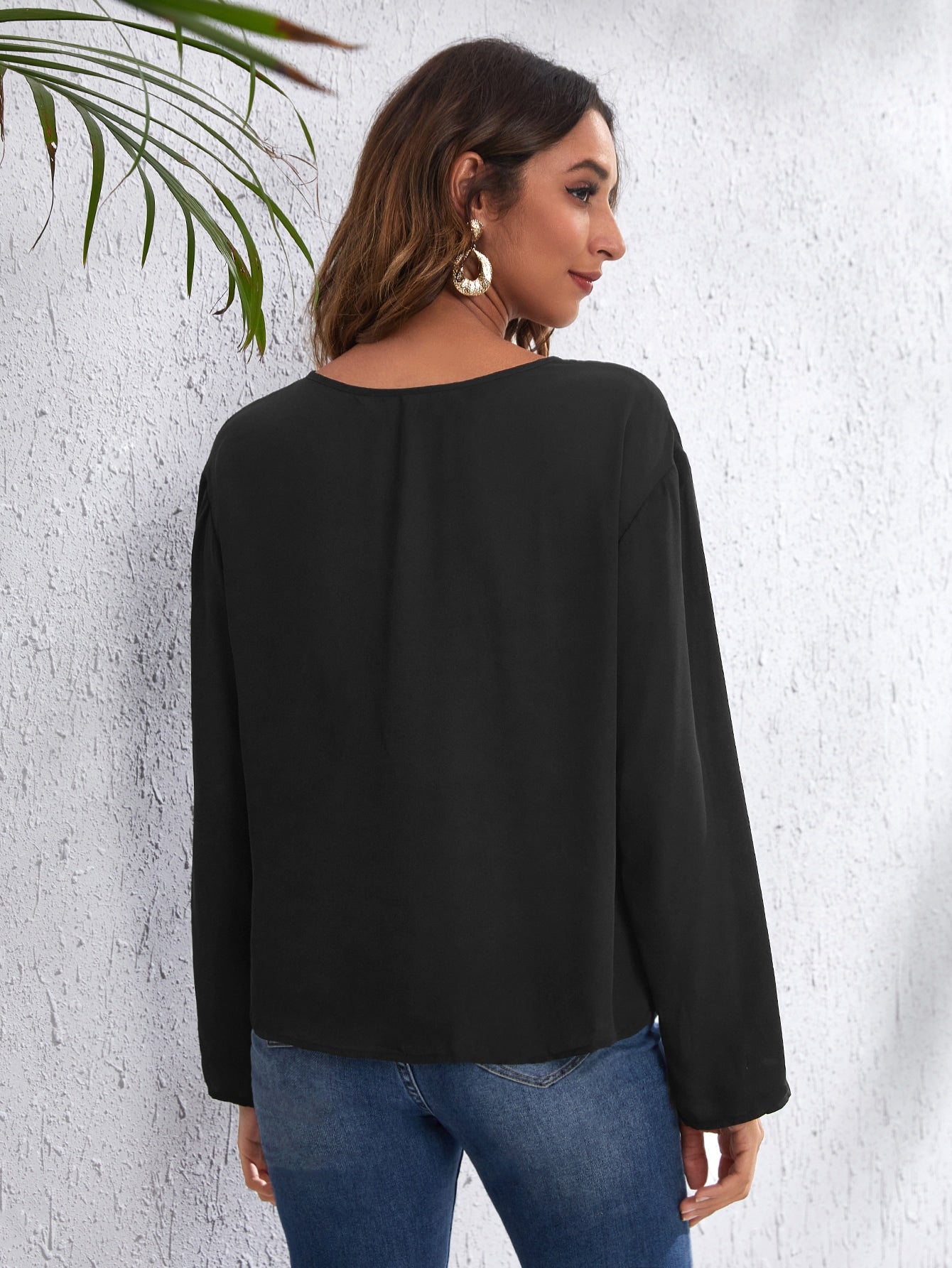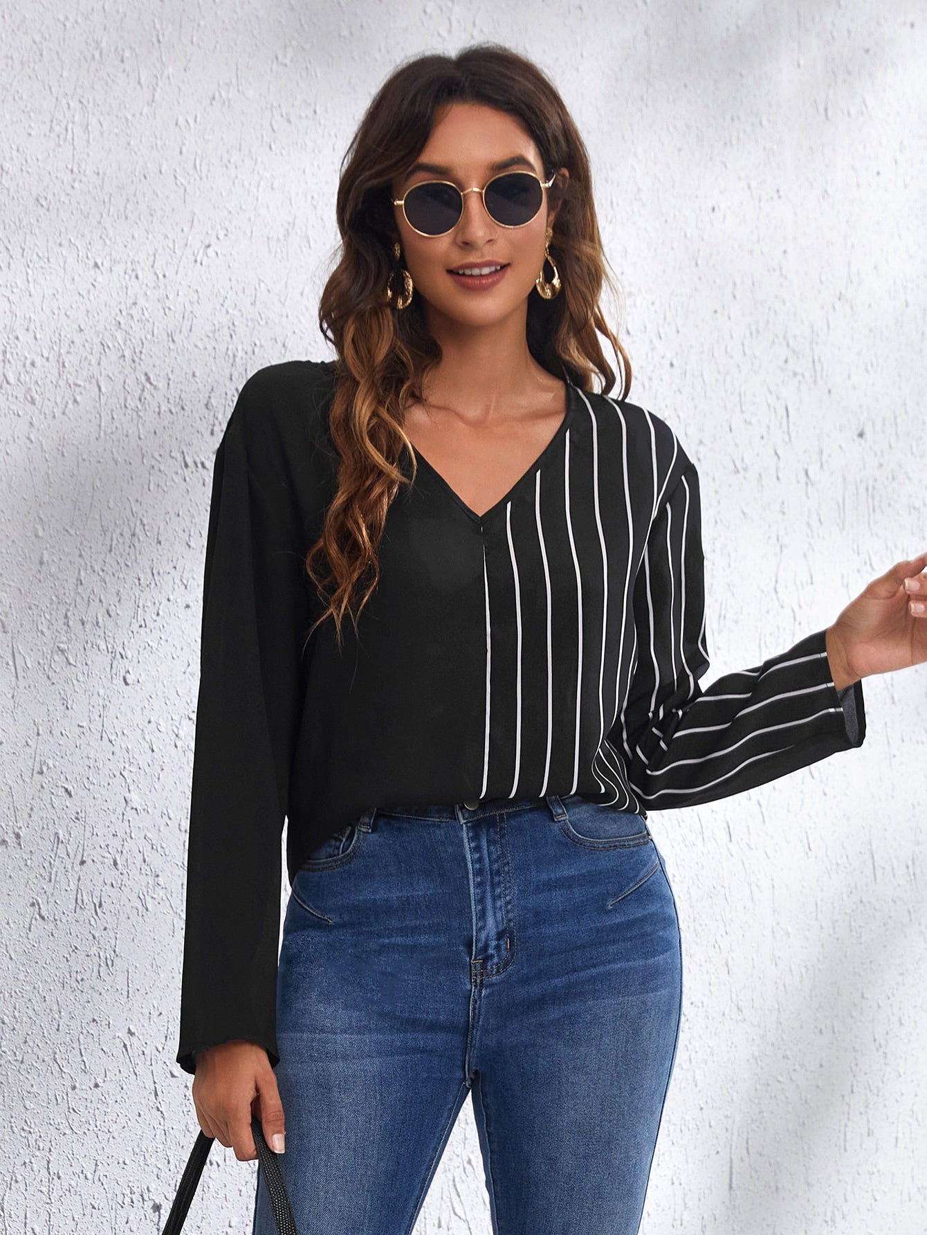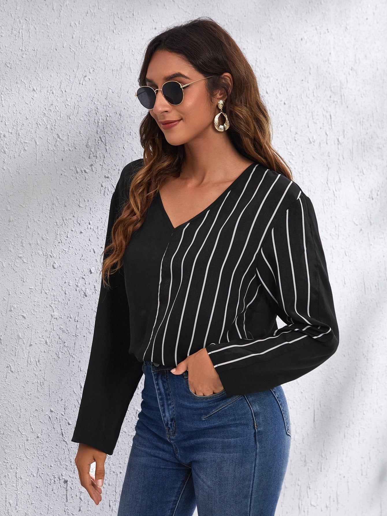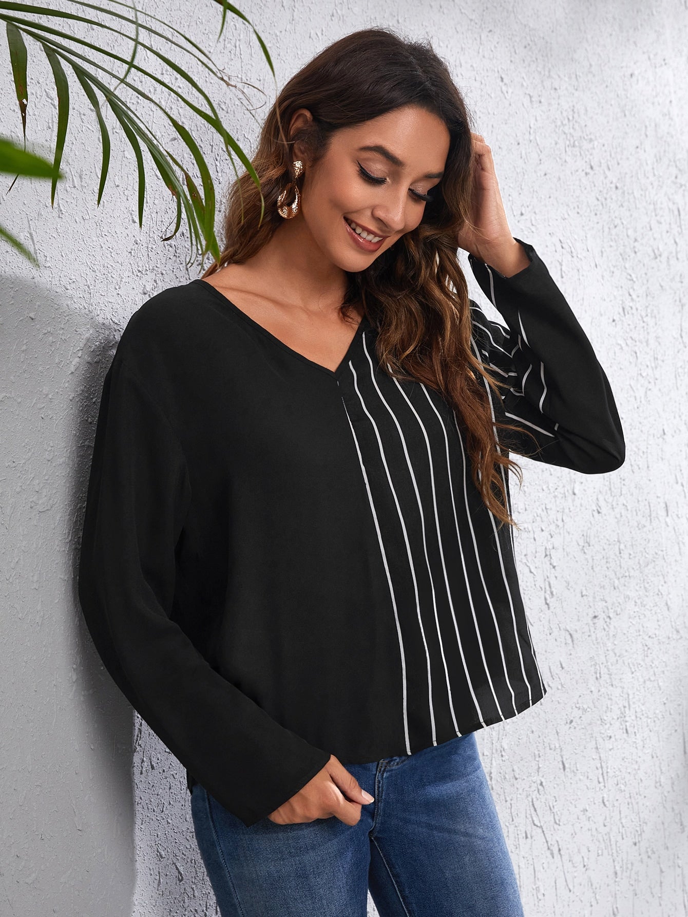 V-neck Drop Shoulder Striped Panel Top