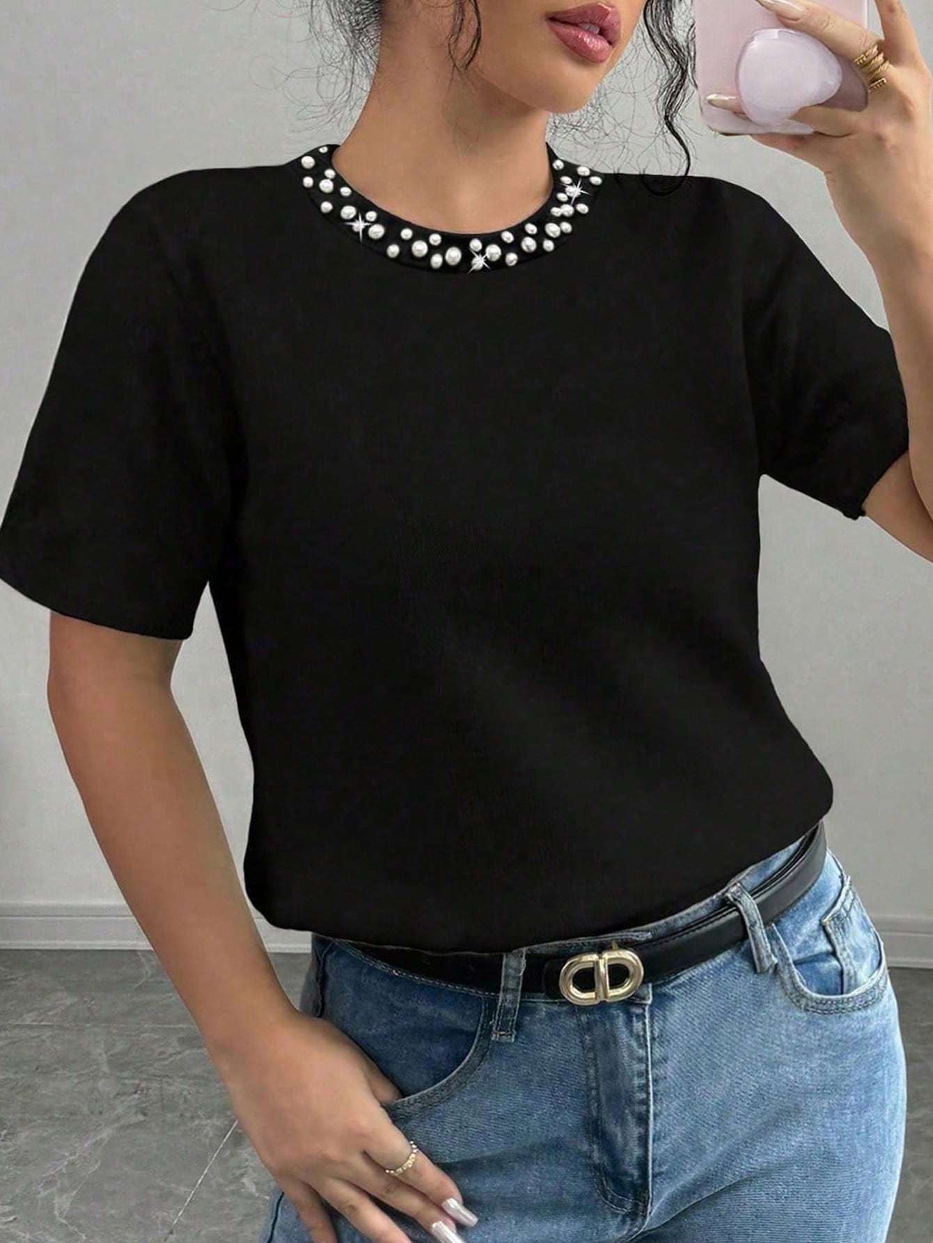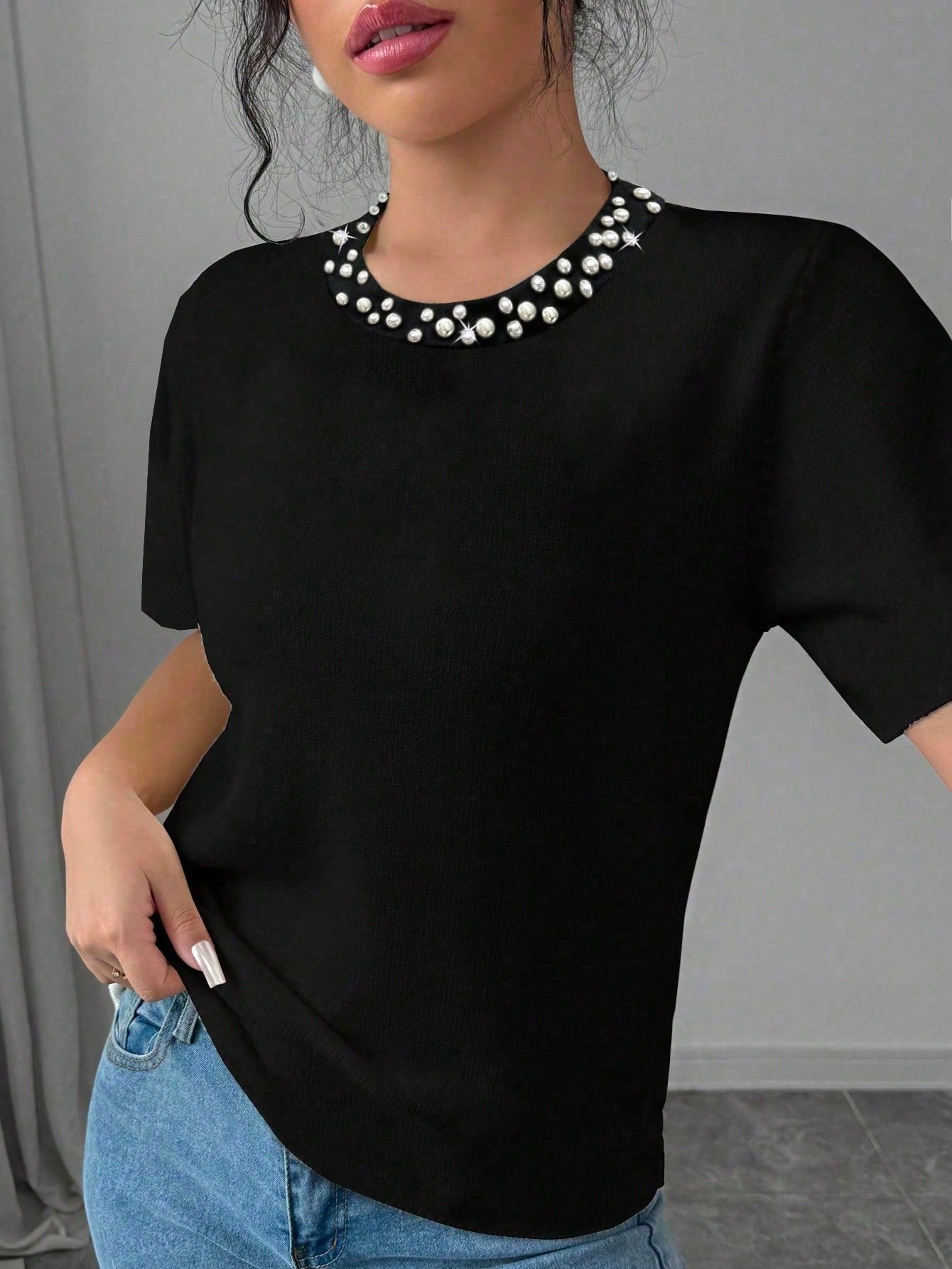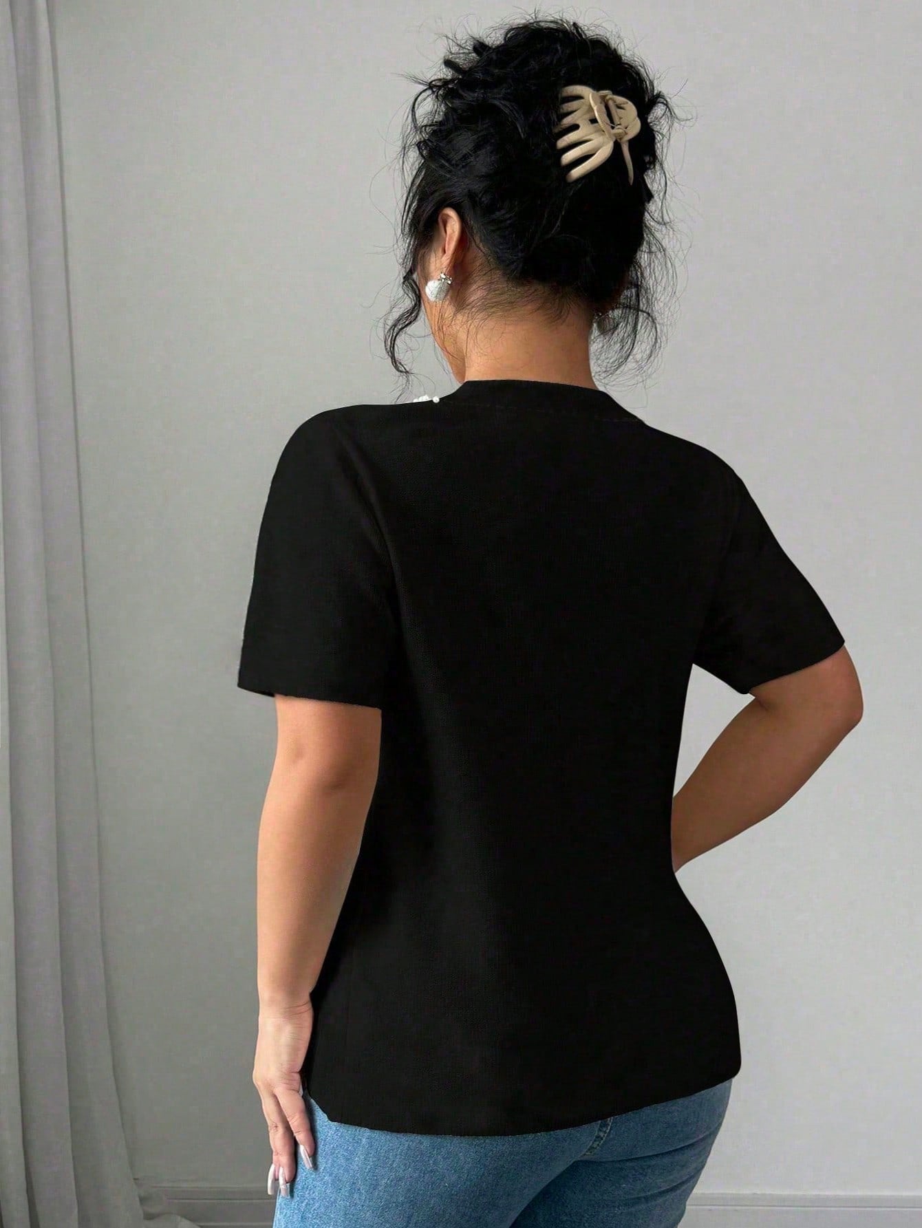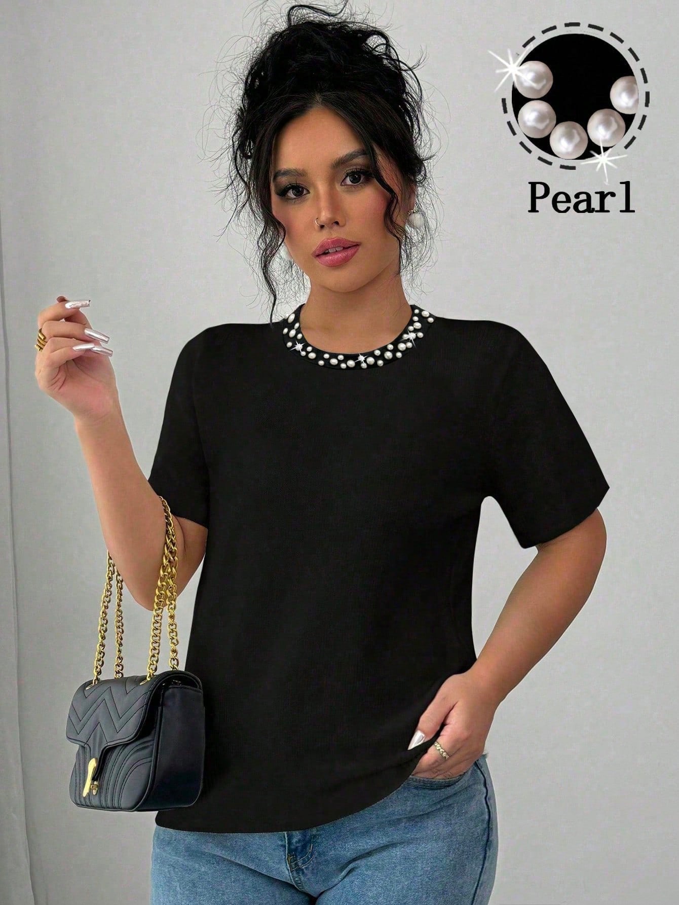 Vaclyn Plus Size Women Round Neck Short Sleeve T-Shirt With Faux Pearl And Patchwork Trim