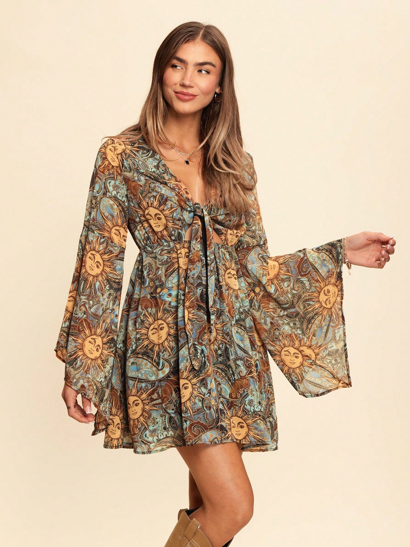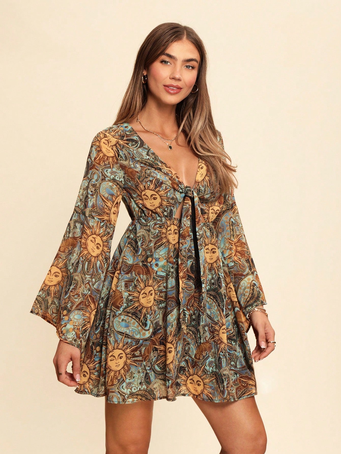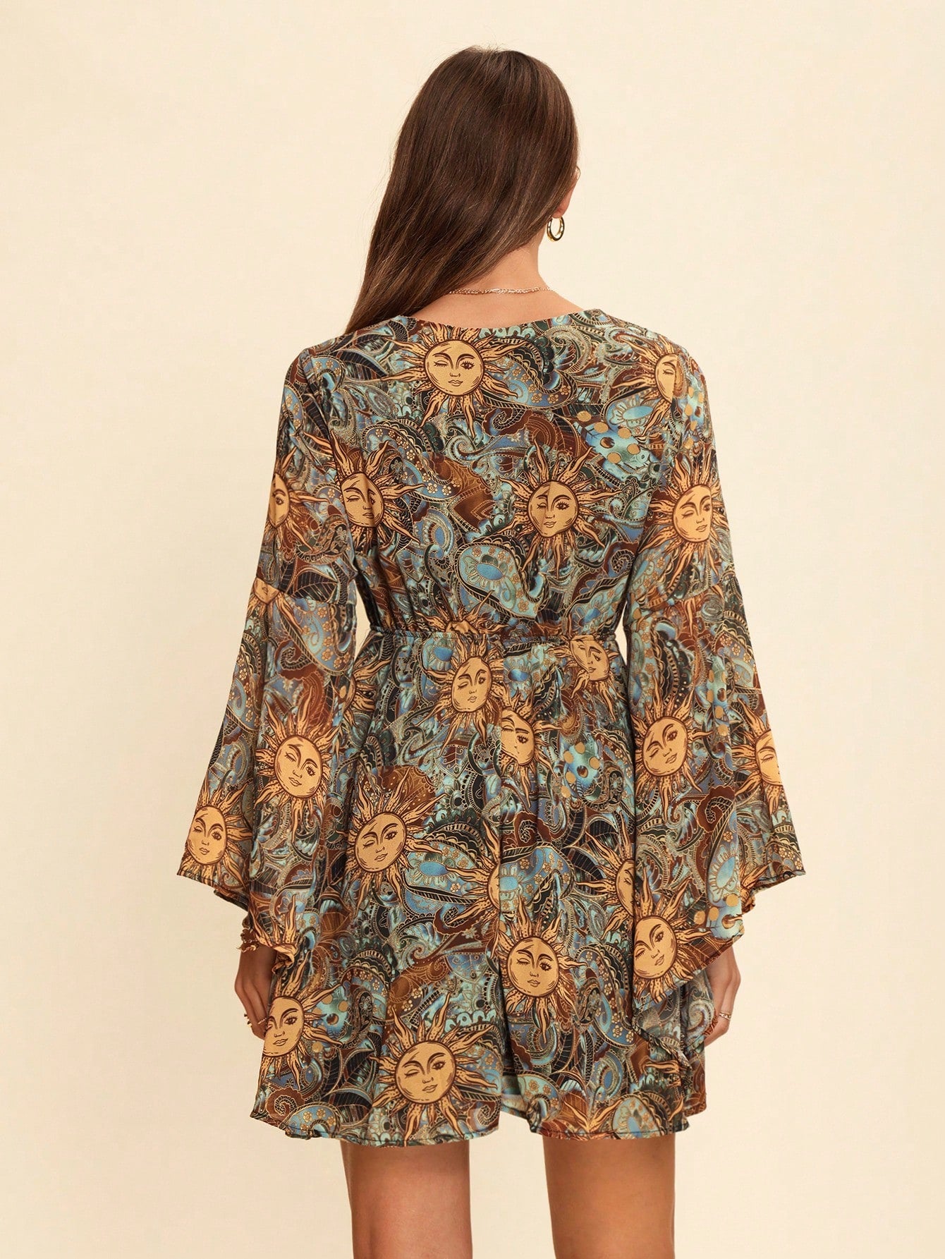 VCAY Casual V-Neck Bell Sleeve Fitted Short Dress With Sfumato Print