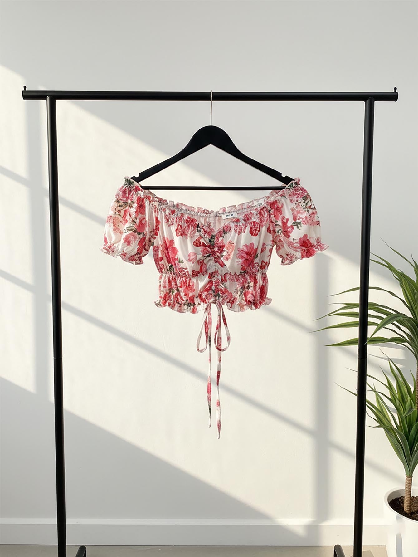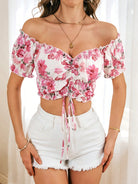 VCAY Off Shoulder Ruffled Drawstring Vacation Blouse With Romantic Print For Women