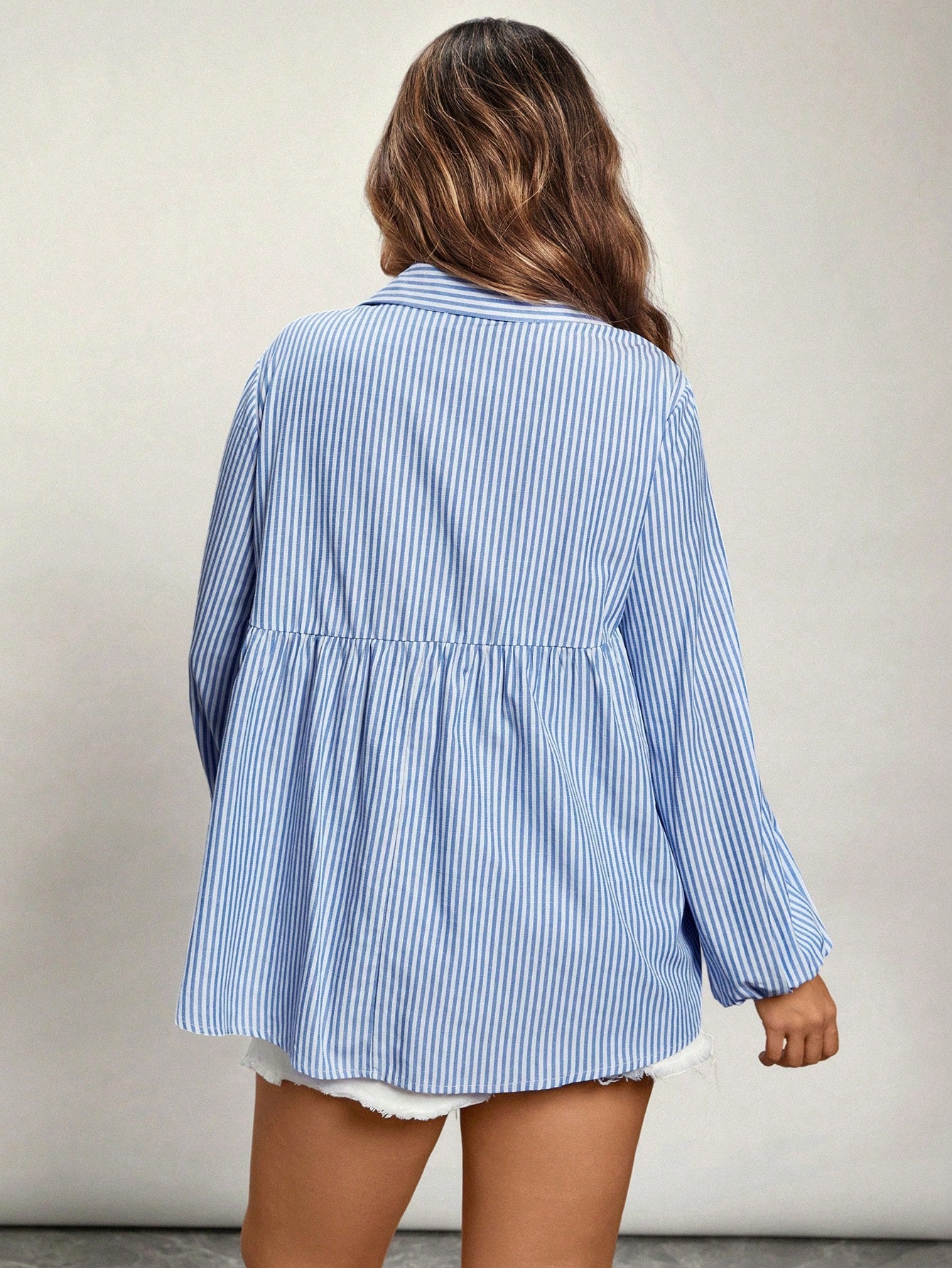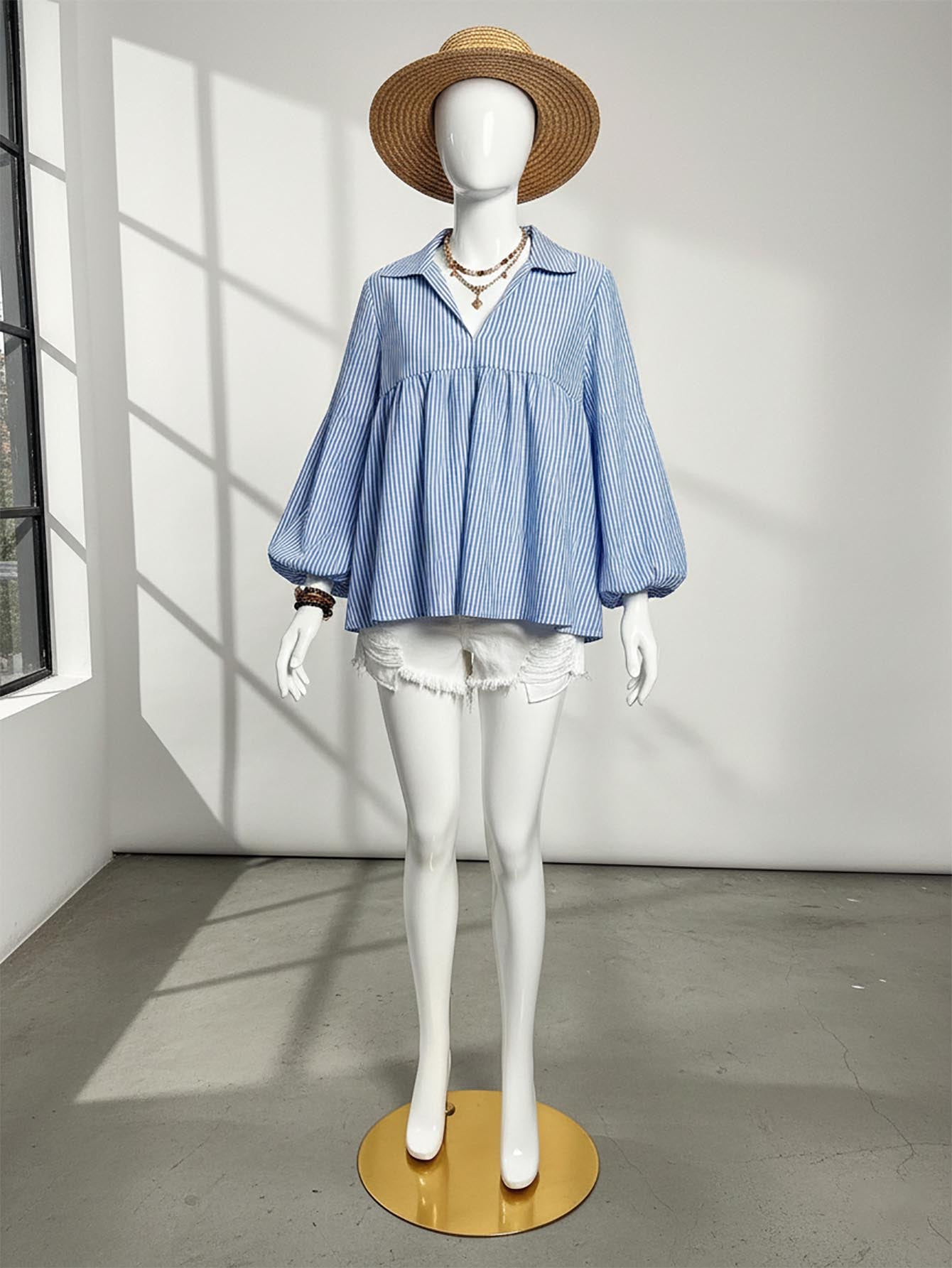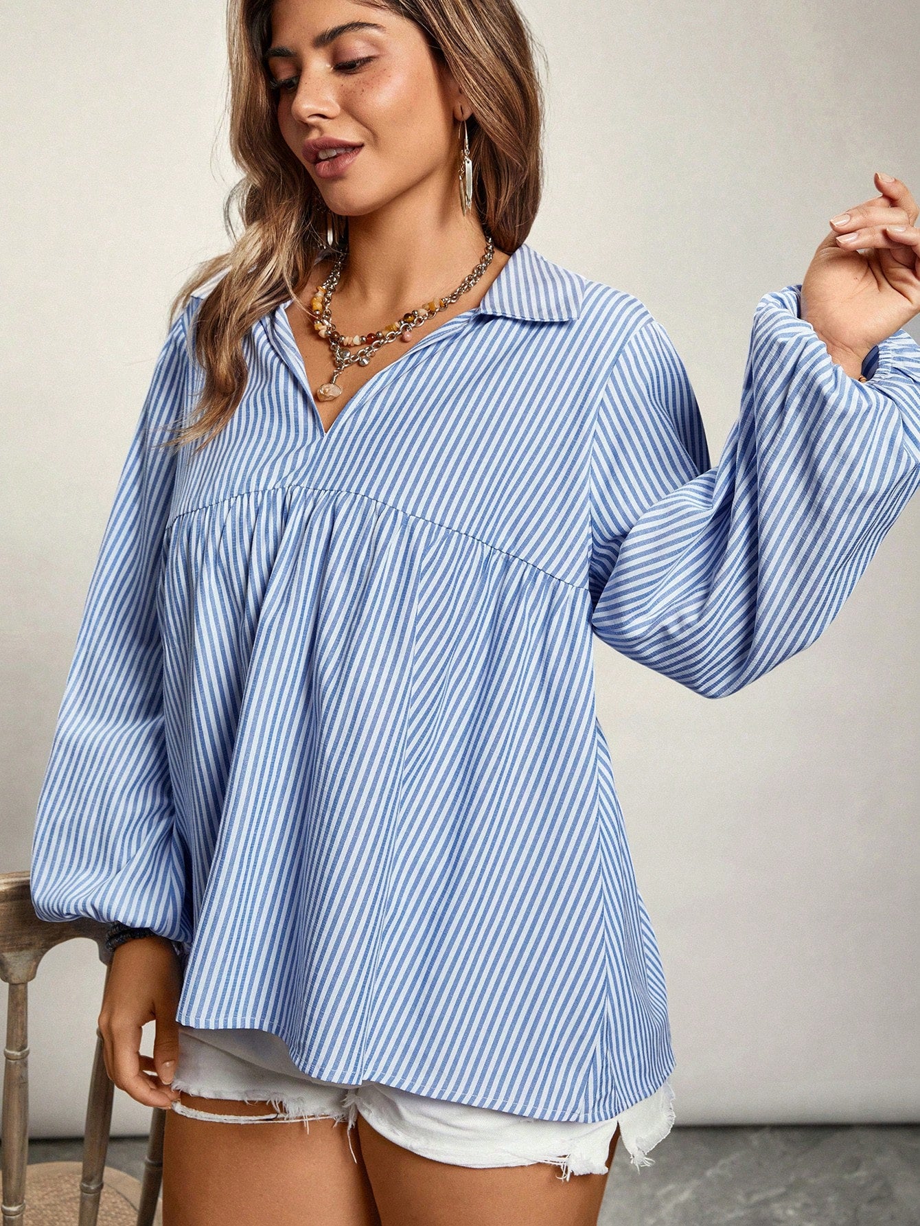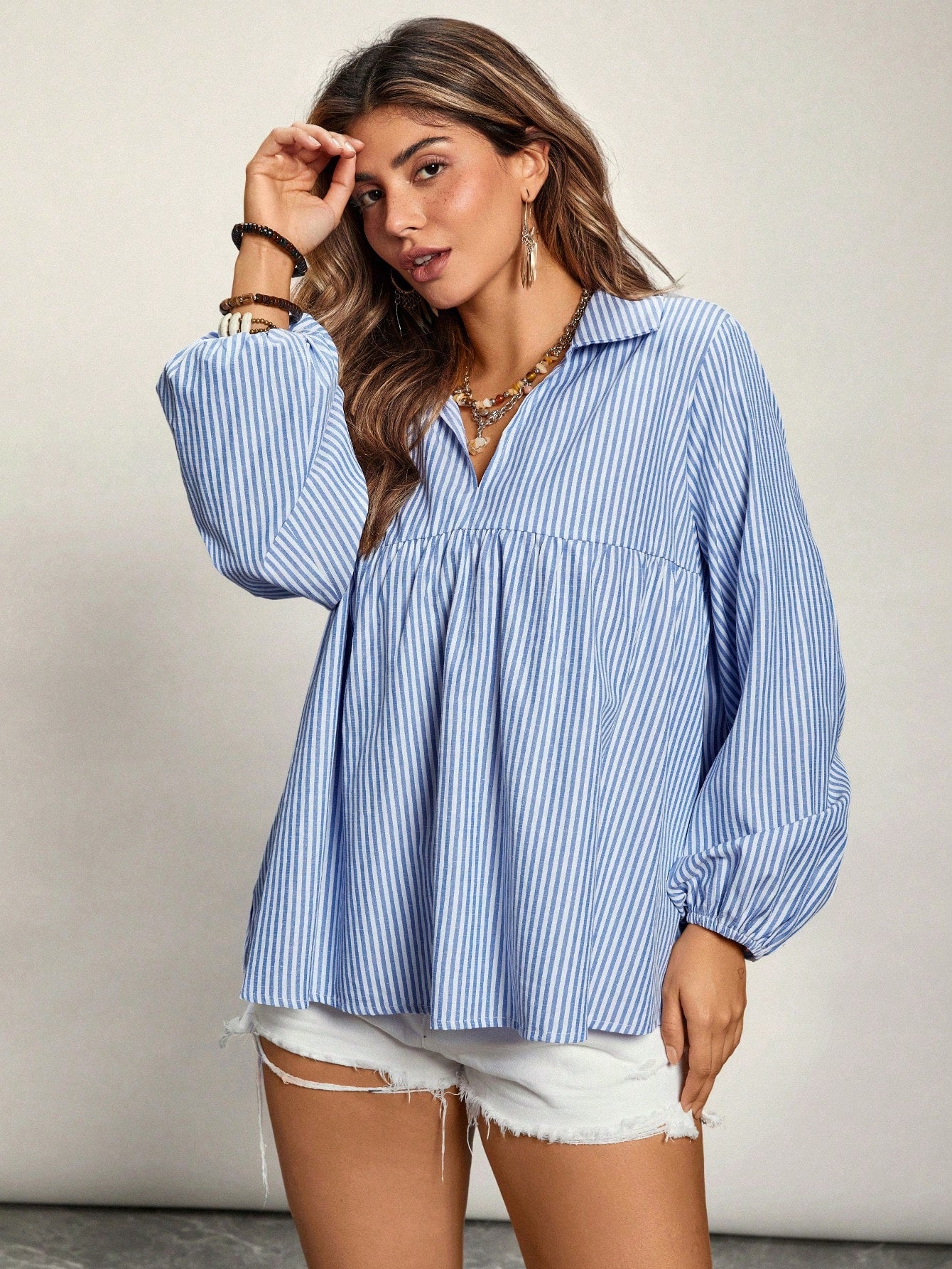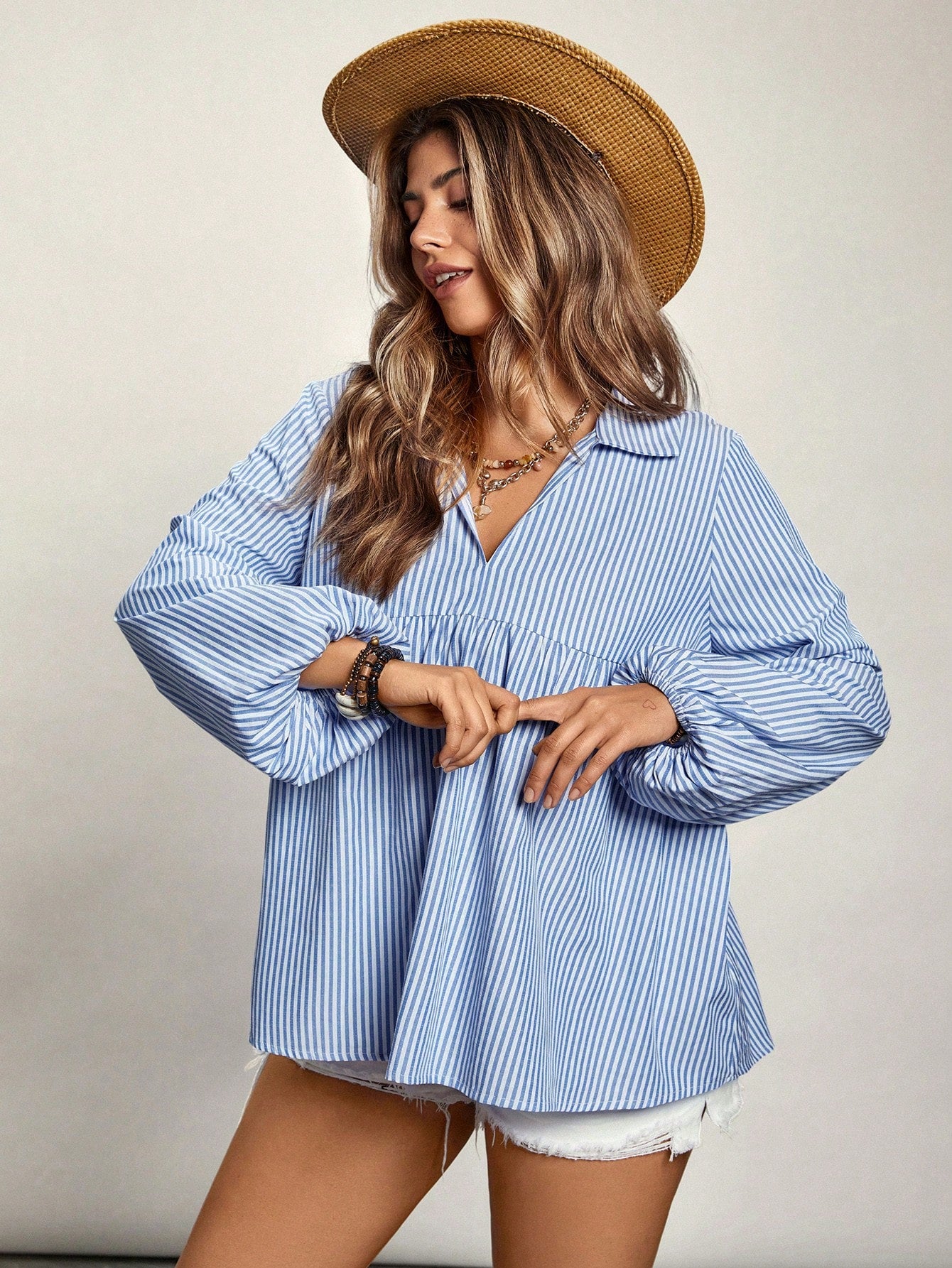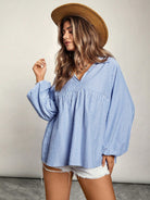 VCAY Plus Size V-Neck Long Sleeve Striped Casual Top