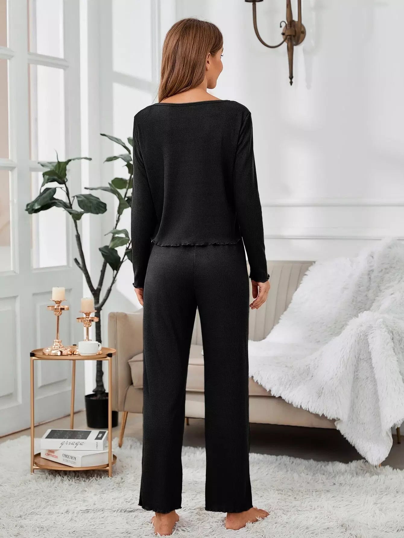 Waffle Knit Lettuce Trim Top & Pants Lounge Set